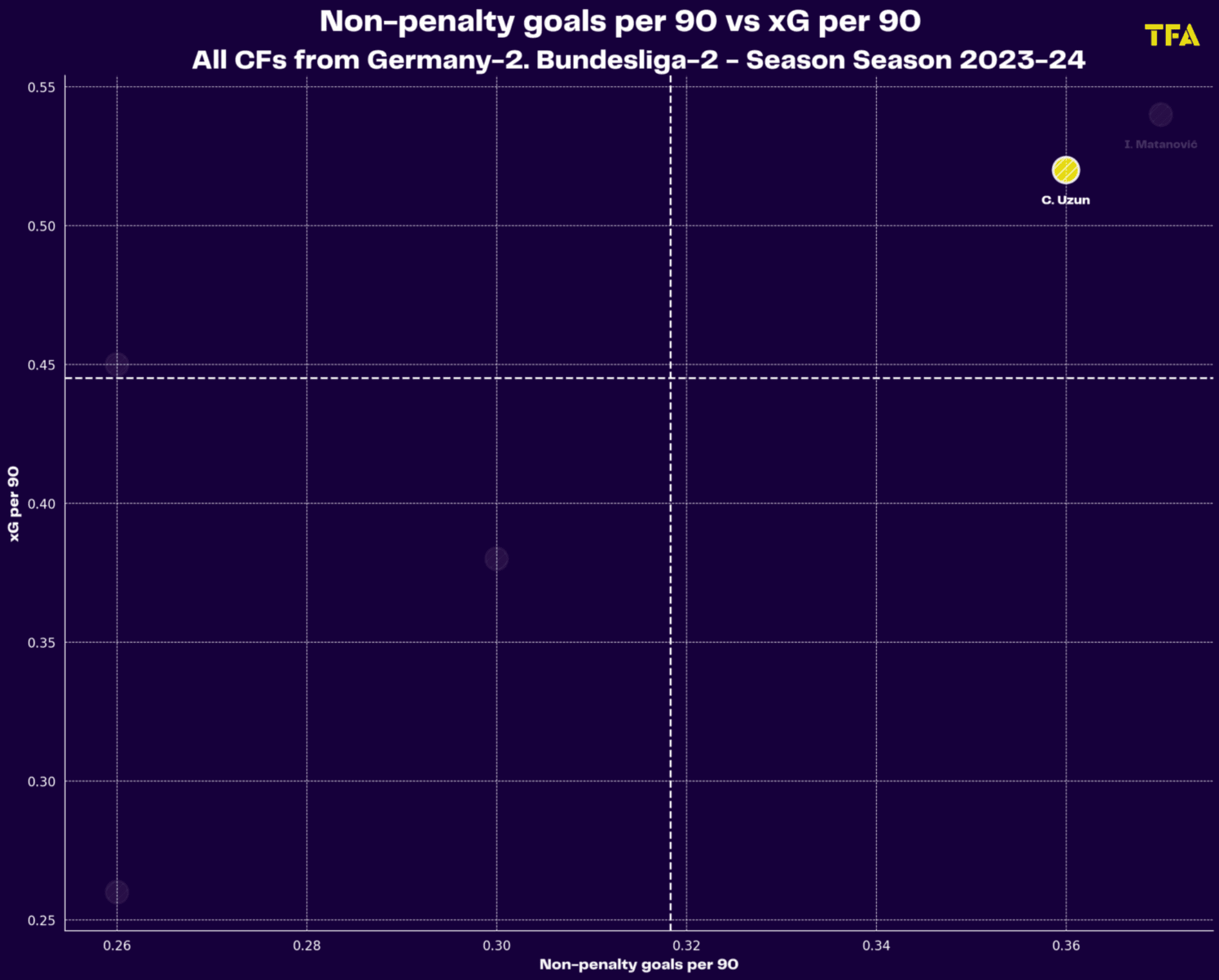 The scatter chart above shows non-penalty goals per 90 along the x-axis and xG per 90 up the y-axis. As you can see, Uzun has been performing well on both counts and is firmly established in the top-right quadrant of the scatter.