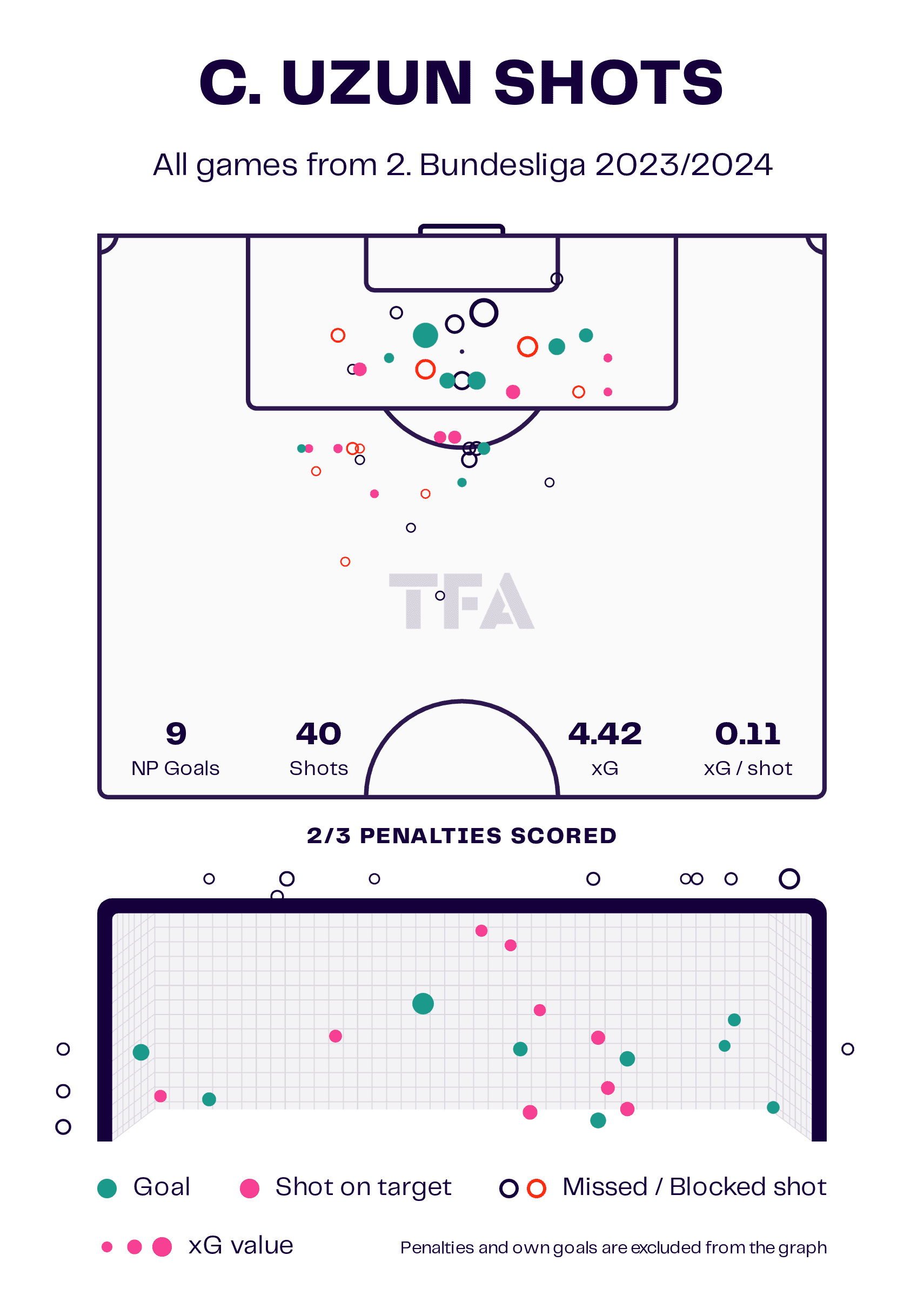 Now, we can drill down further into the shot map for Uzun so far this season in the 2.Bundesliga. While there are still some shots from outside the area, we can clearly see that he does his best work as a striker in the width of the opposition penalty area. His movement and positional awareness when working around the edges and into the penalty area is generally excellent. As a result, he gets into good goalscoring positions in central areas. He can create separation from opposition defensive players with his movement in tight areas and timing.