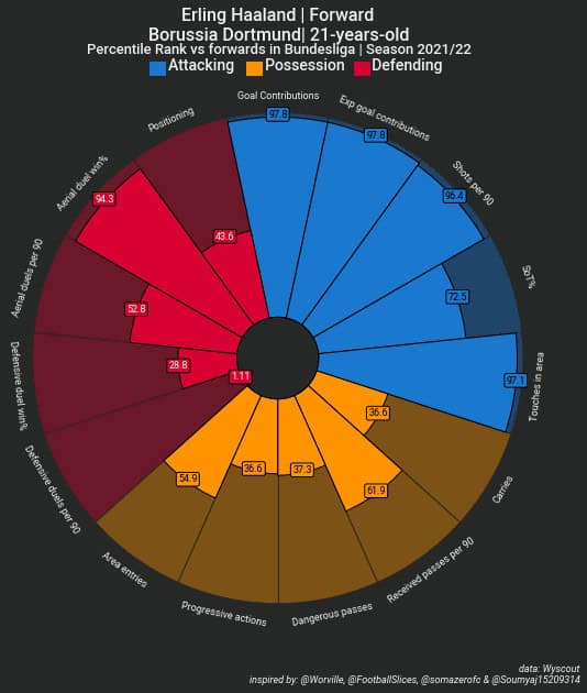 Last season we saw City play, for the most part, without a fixed striker with an advanced midfield player occupying the ‘9’ position. This means that the forwards will be involved in linking the attack. As you can see from Haaland’s pie chart, passing and ball progression are not strengths for him (although we have to bear in mind that this data is skewed somewhat by the style of play at Dortmund).