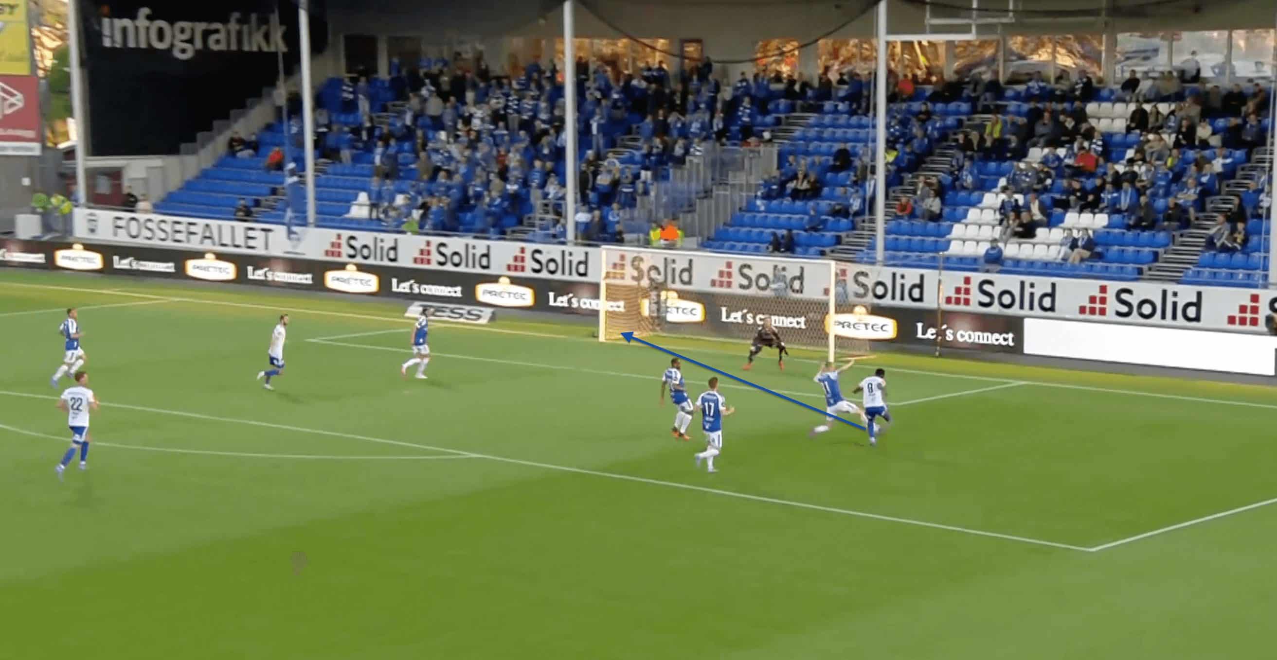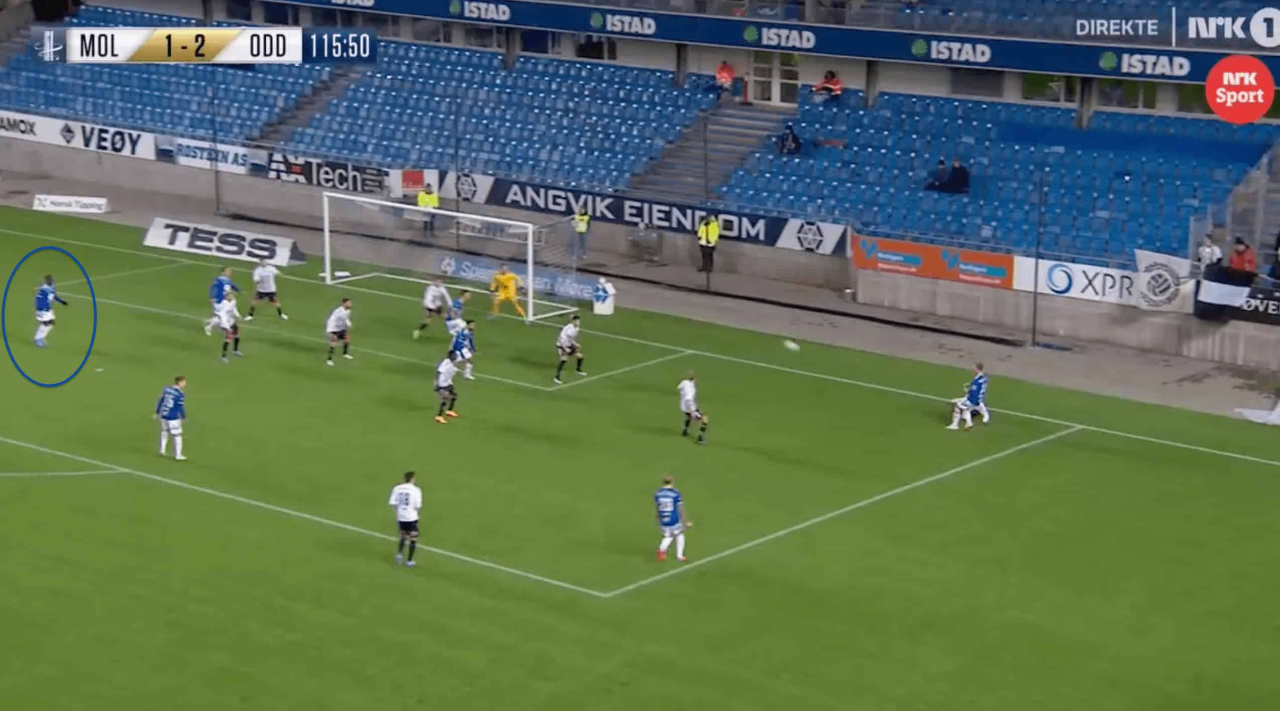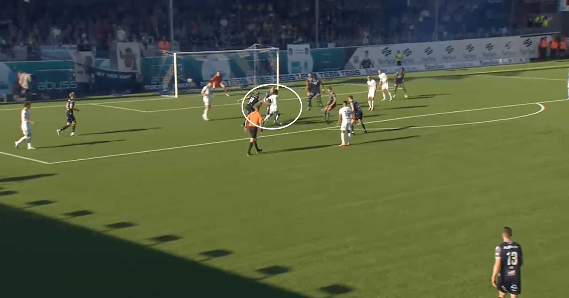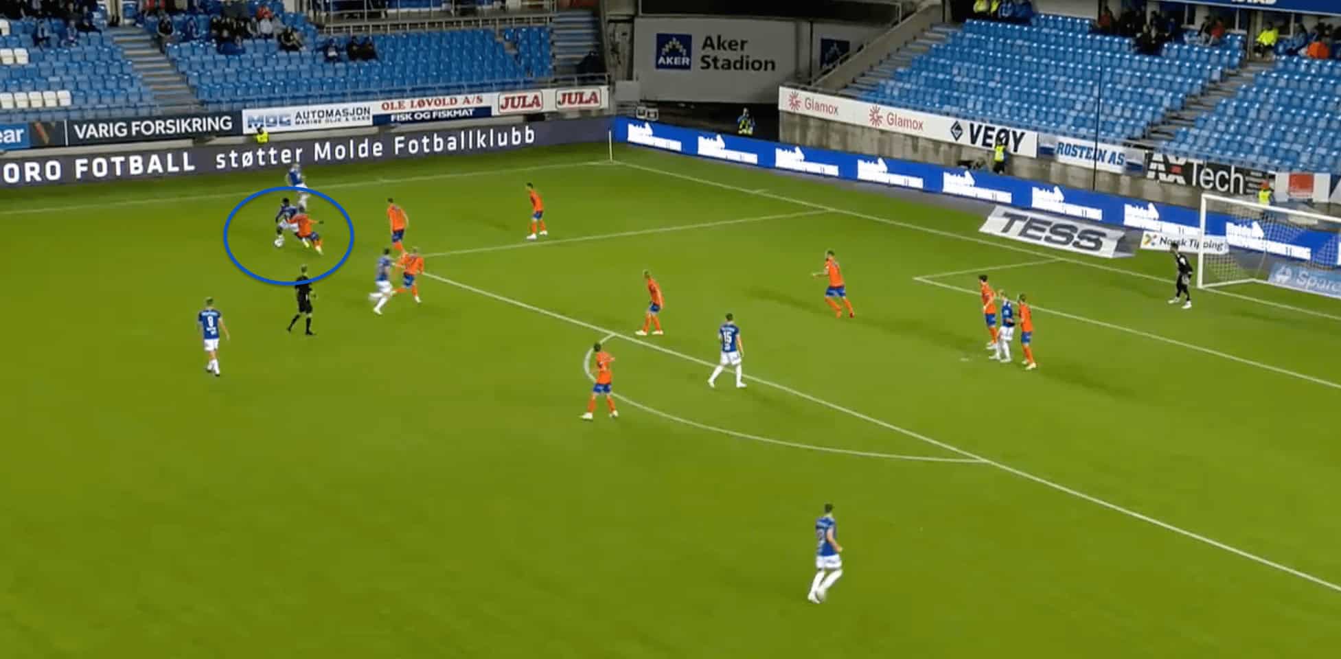 We can see an example of this in the image above, where Fofana manages to stay back and create separation from the opposing defenders, who are all drawn by the other Molde players to the ball, which helps create separation for Fofana from the defenders.