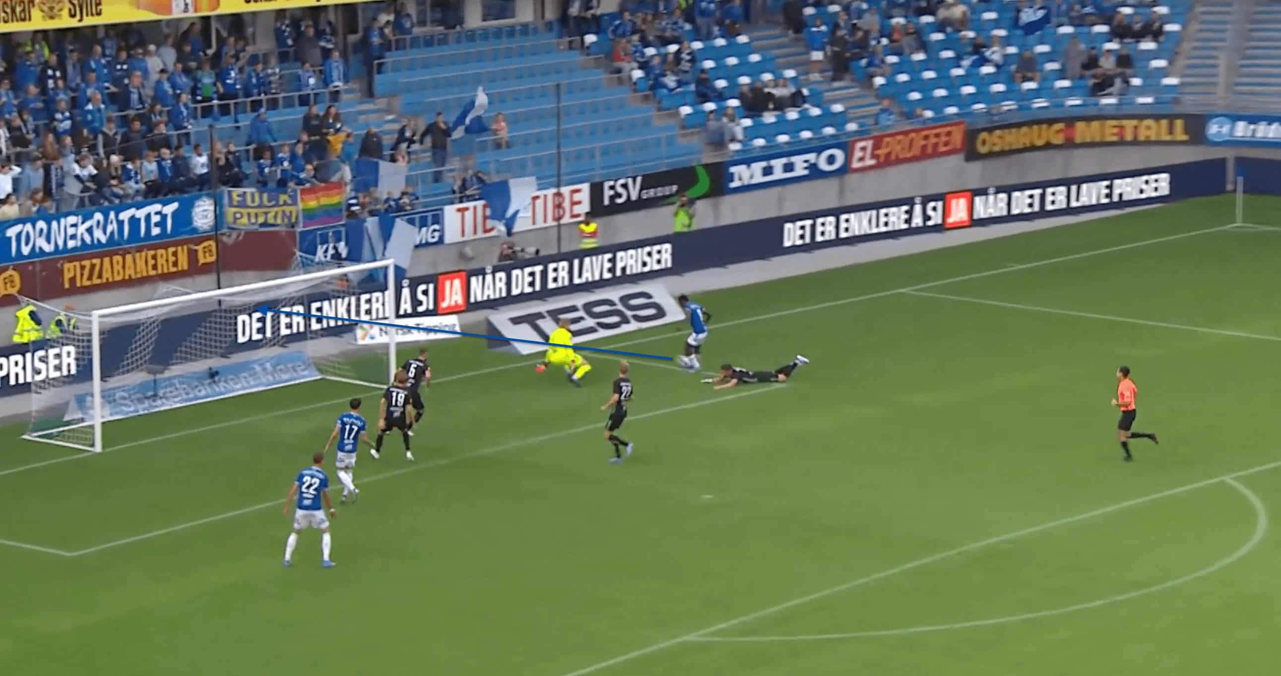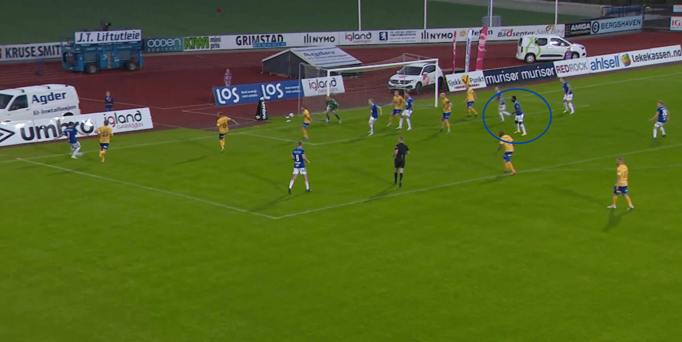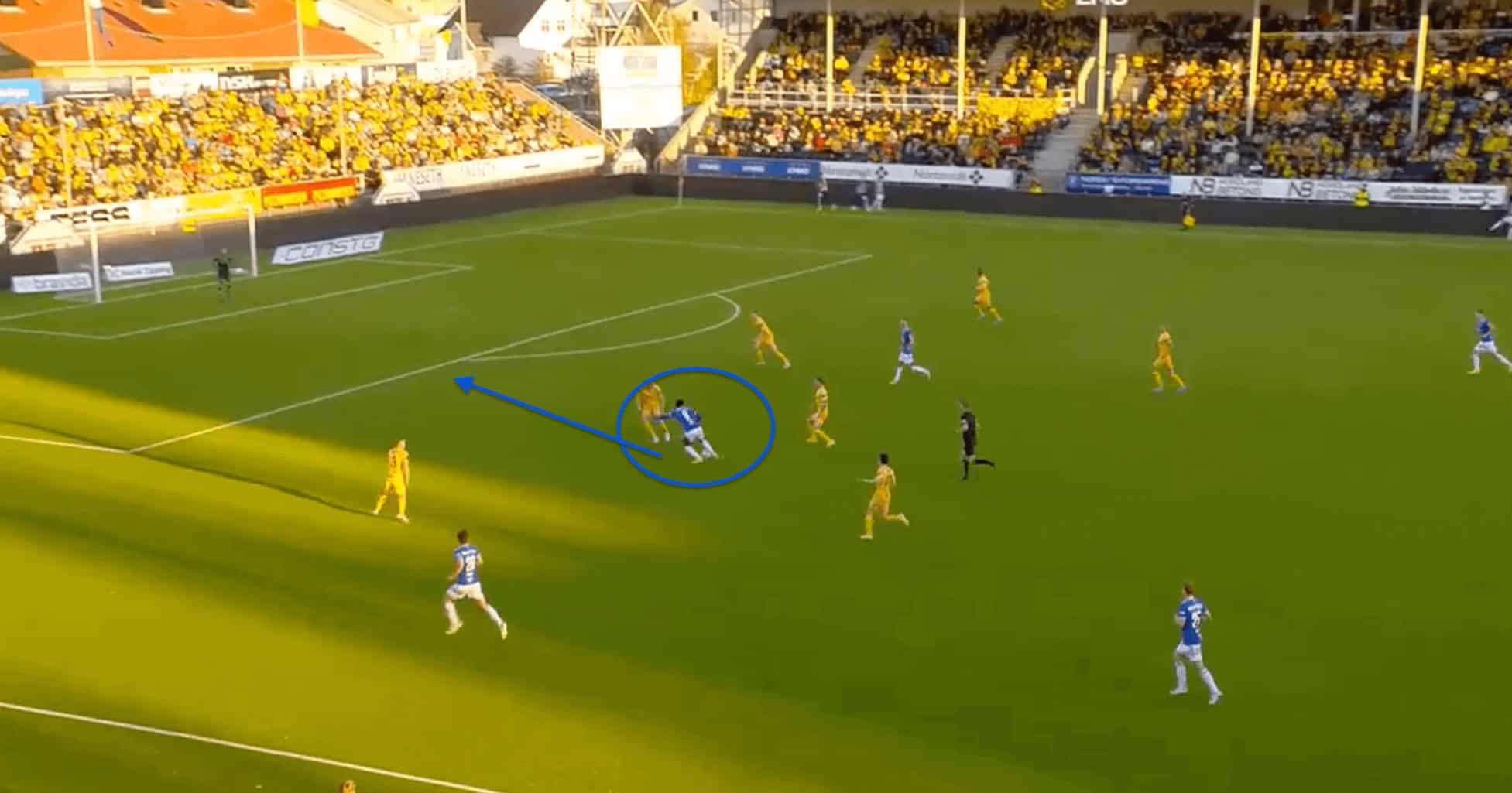 We can see an example of this in the image above, where Fofana manages to stay back and create separation from the opposing defenders, who are all drawn by the other Molde players to the ball, which helps create separation for Fofana from the defenders.