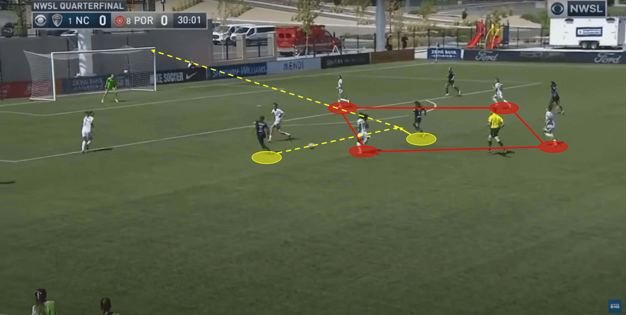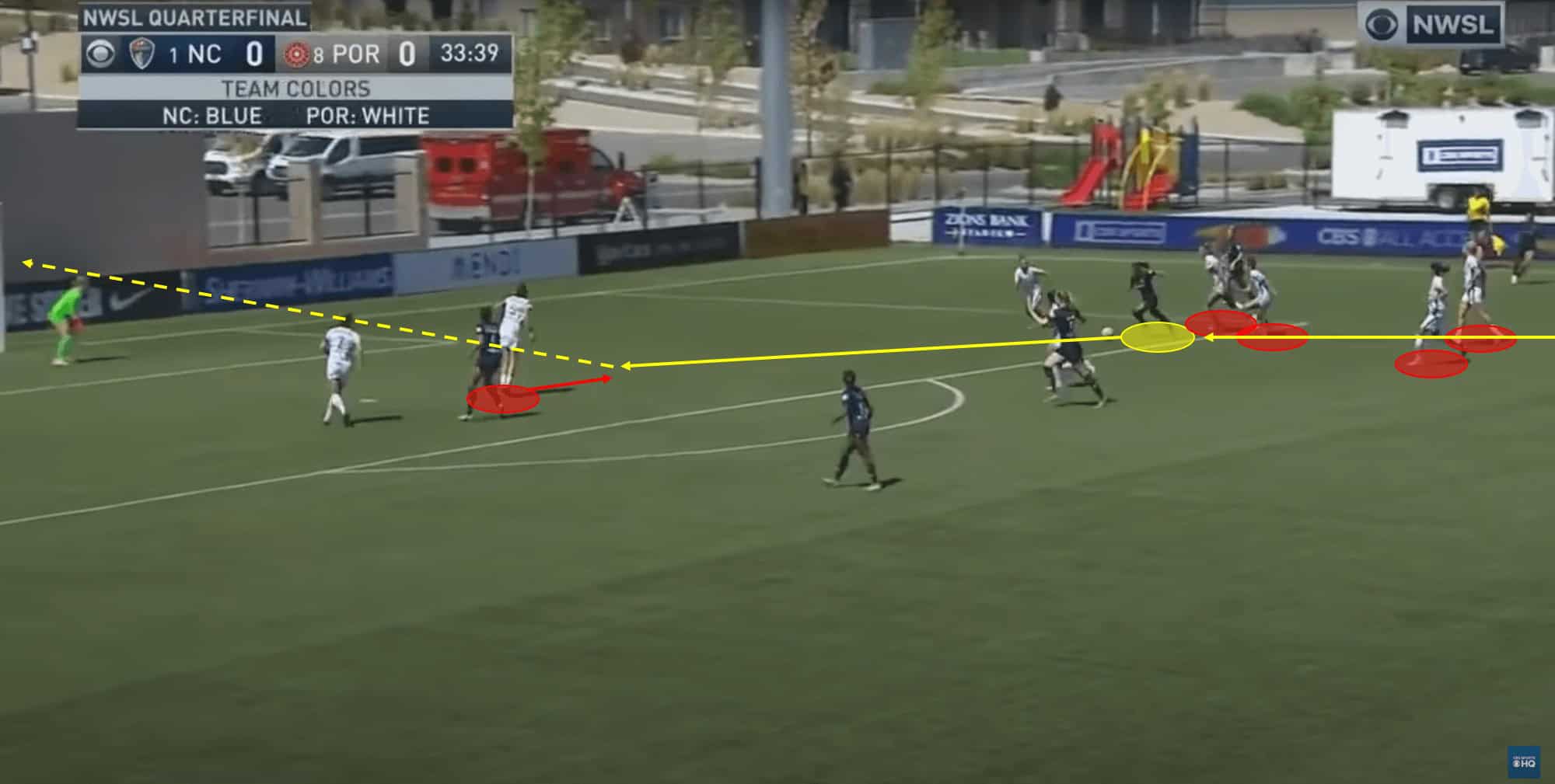In this moment, she has drawn pressure from the Thorns right-back and subsequently created space to penetrate into for fellow attacker Lynn Williams.