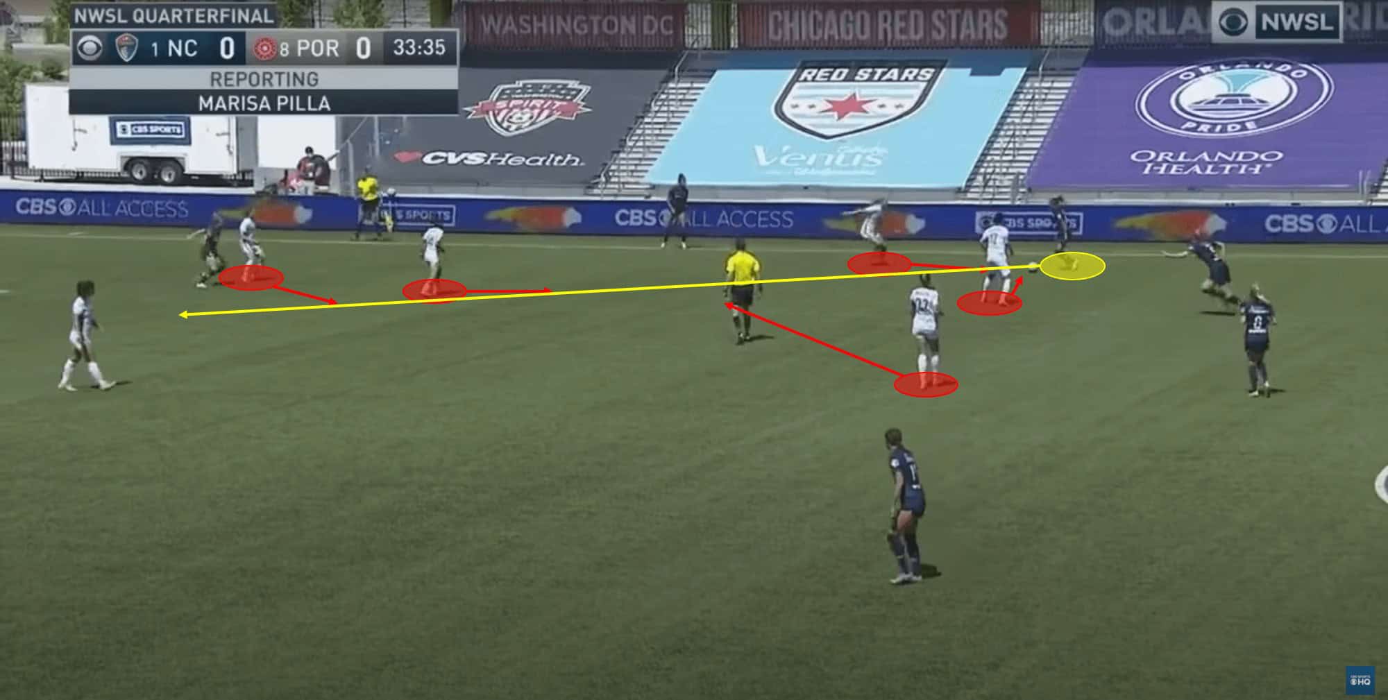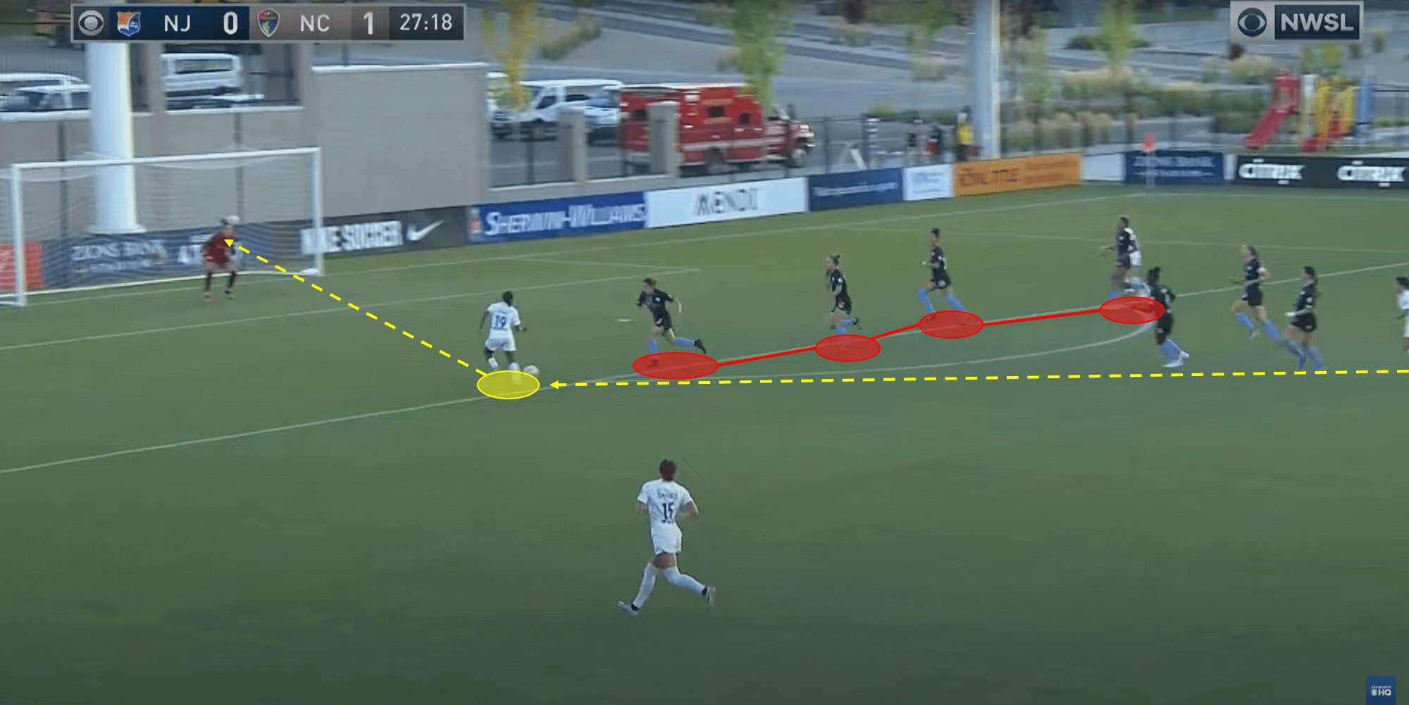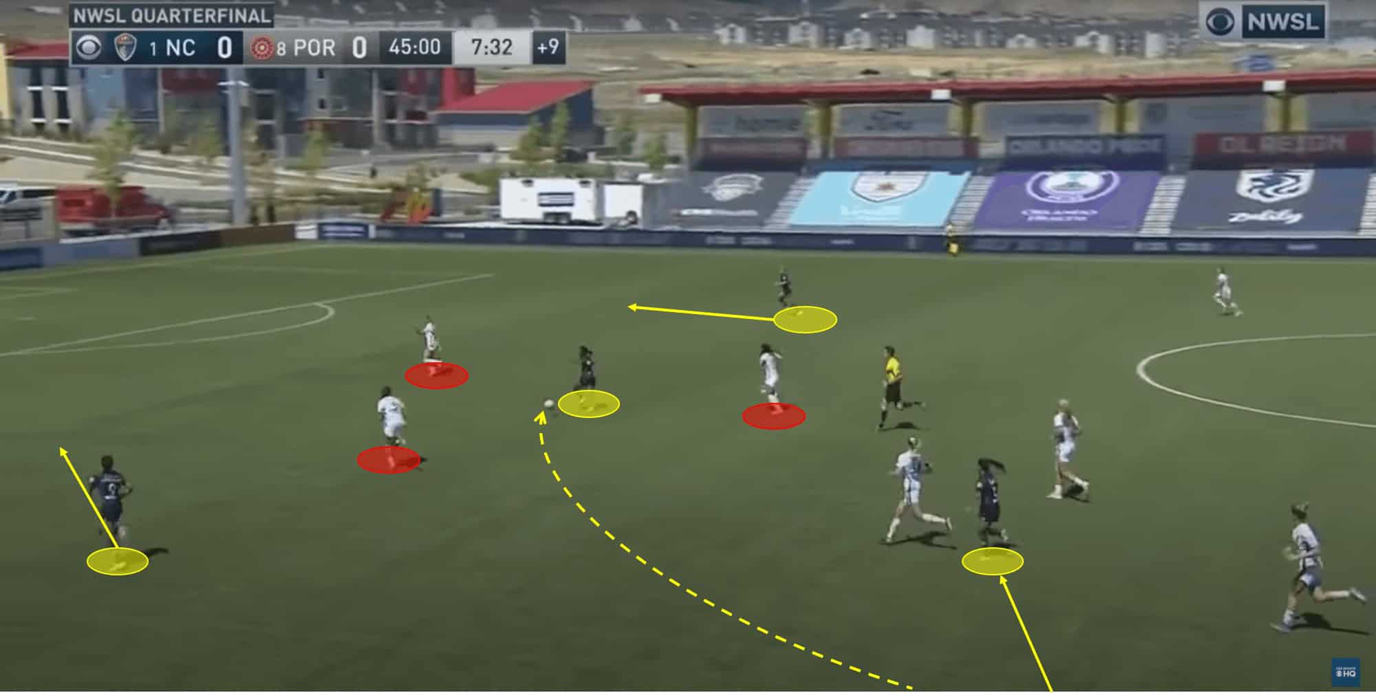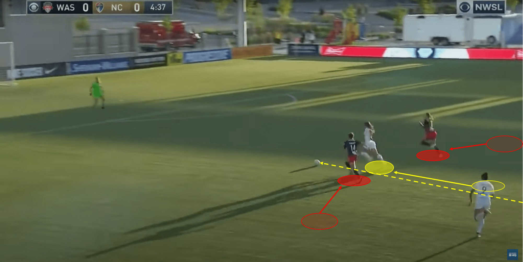 In this scenario, Mewis or O’Sullivan are then able to penetrate forward into the newly opened space to retrieve a return pass from Debinha