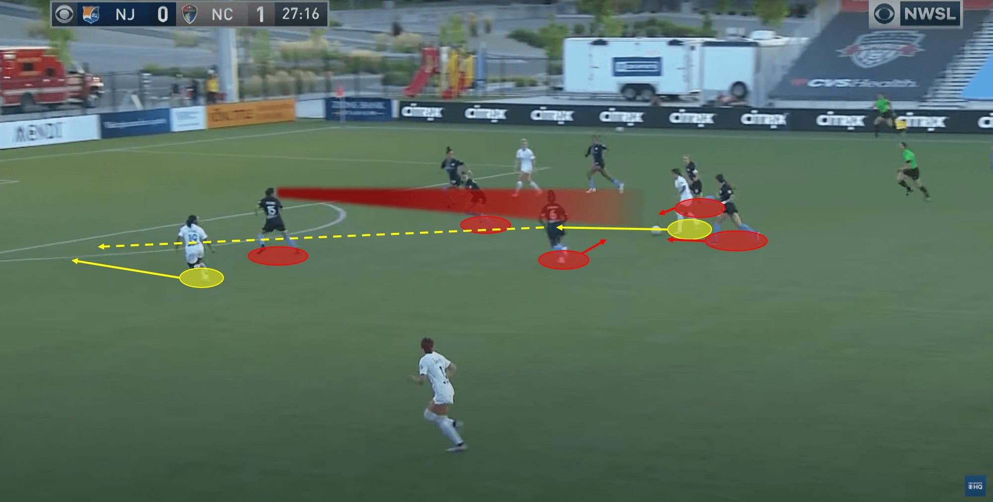 In doing so she attracts pressure from four nearby Sky Blue players as well as the visual attention of the Sky Blue right-back.
