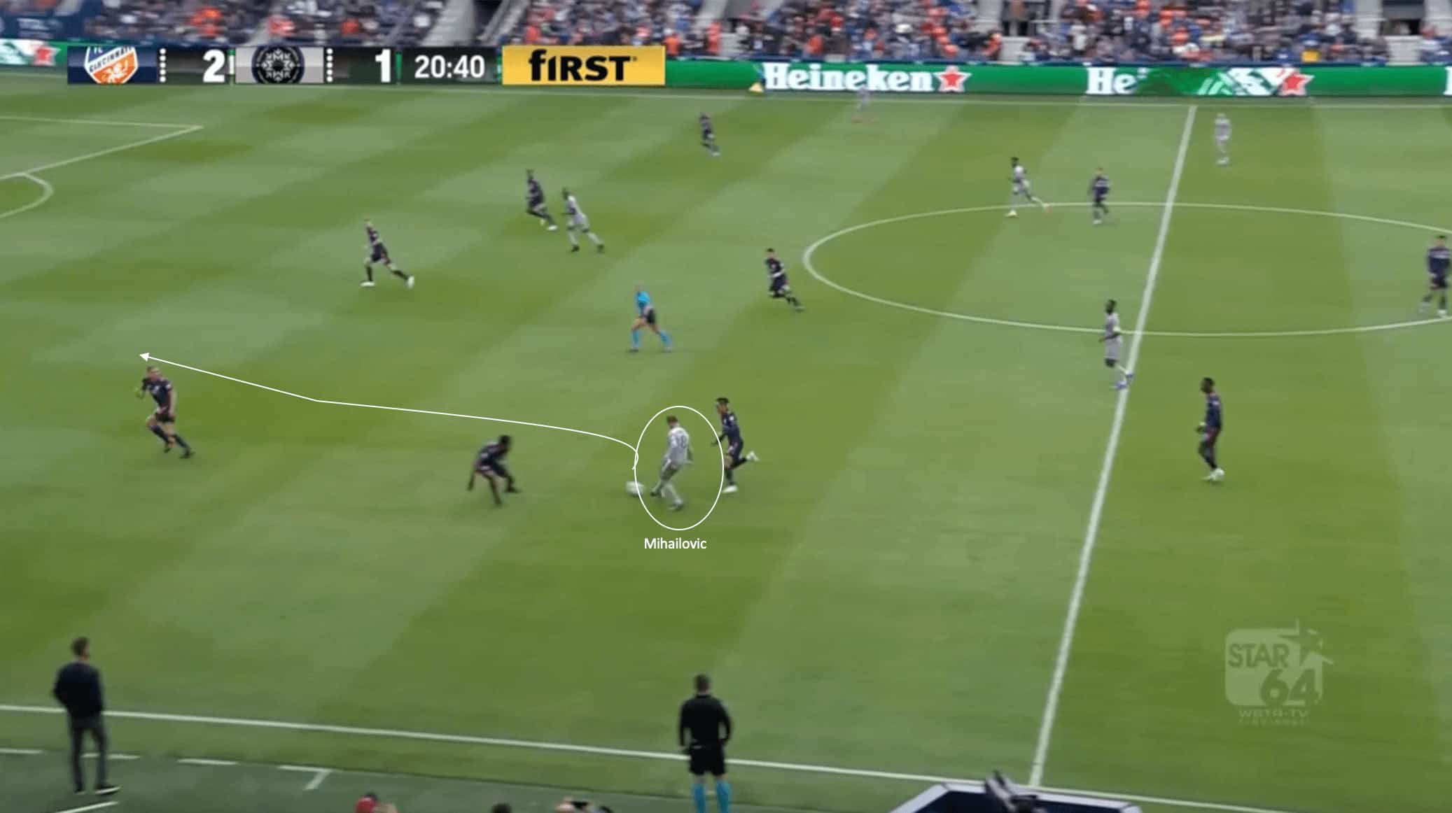 This pass from Mihailovic is able to instantly break Cincinnati’s midfield and defensive lines, allowing the winger to play the ball across the face of goal after dribbling into the penalty box.