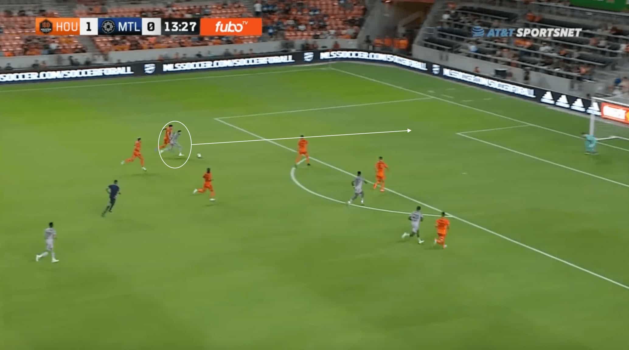 The wingback from Montréal is able to make an overlapping run past the opposition’s defence, with the defenders caught ball-watching.