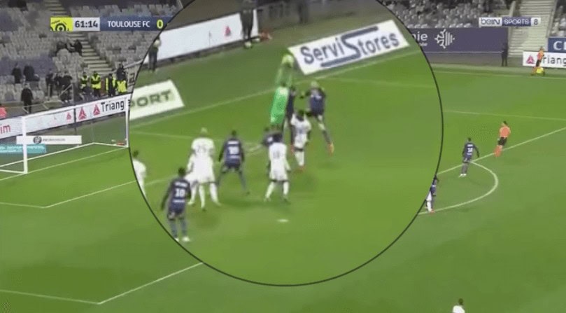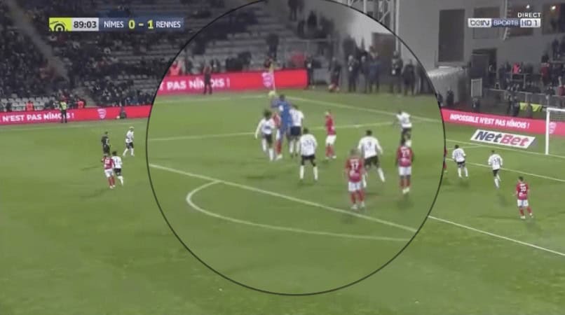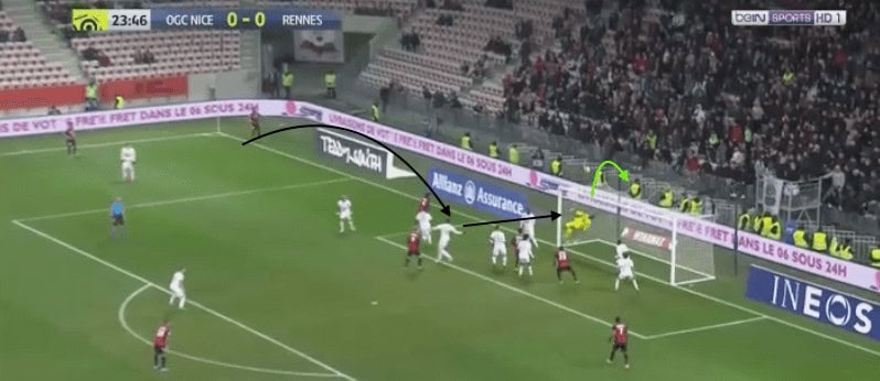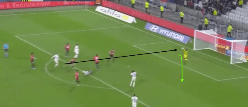 21% of the goals Rennes conceded came after a set-piece during the 2019/20 season, showing their defence’s incapability to deal with corner and free-kicks. Above is an example where Mendy produces an excellent reflex save to prevent this stat worsening. The headed shots comes at him at pace from just inside the six-yard box. Mendy uses his athleticism to spring himself into the air and tip the powerful shot over the bar. He saves a shot with a very high goal expectancy.