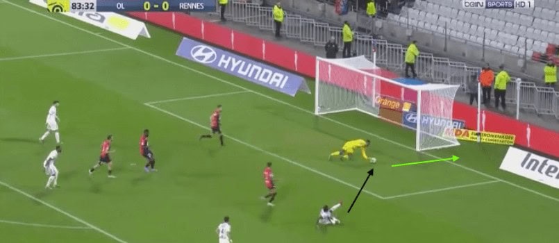 In the above example, Mendy is let down by his defence once again. Firstly, they allow an easy shot from outside the box. Secondly, they leave two Lyon players in a lot of space on the right side of the box. Because the initial shot is curled towards goal it’s difficult for Mendy to help it on its way for a corner, rather he is forced to parry it back infield to his left. Knowing that his save is likely to fall to an opponent, Mendy makes a great low block to ensure a double save.