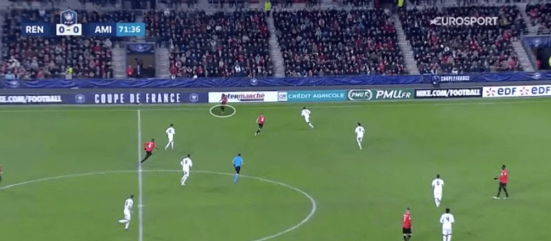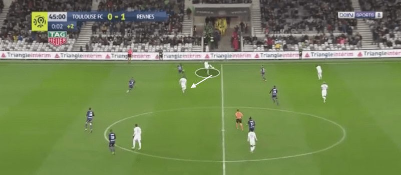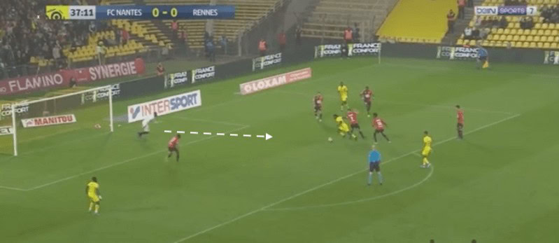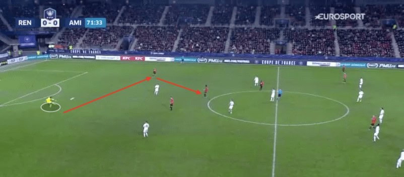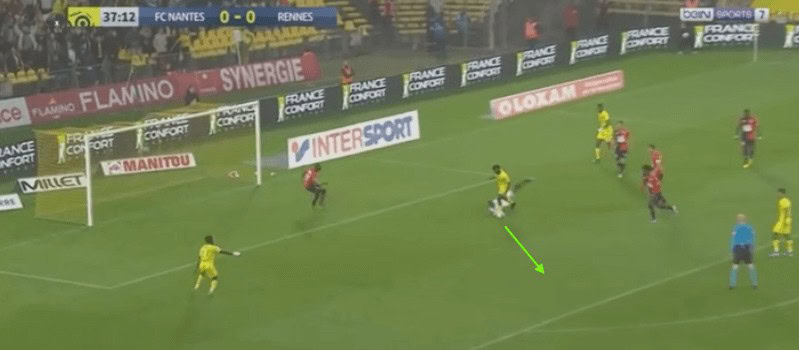 In the above example, Mendy receives the ball outside of his box because his team have pushed high up the pitch. The left-hand side of the opposition is exposed because they’ve loaded the middle part of the field. He ignores the pass highlighted, instead, choosing to go long. This forces a bad touch and slows the momentum of the team down. Whereas shorter passes would enable to team to move the ball forward quicker.