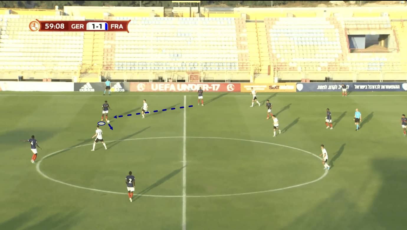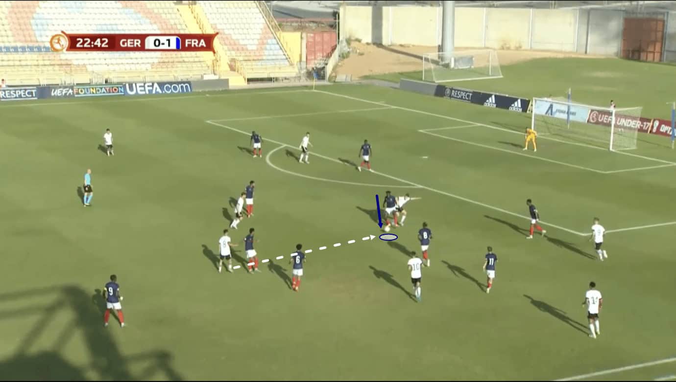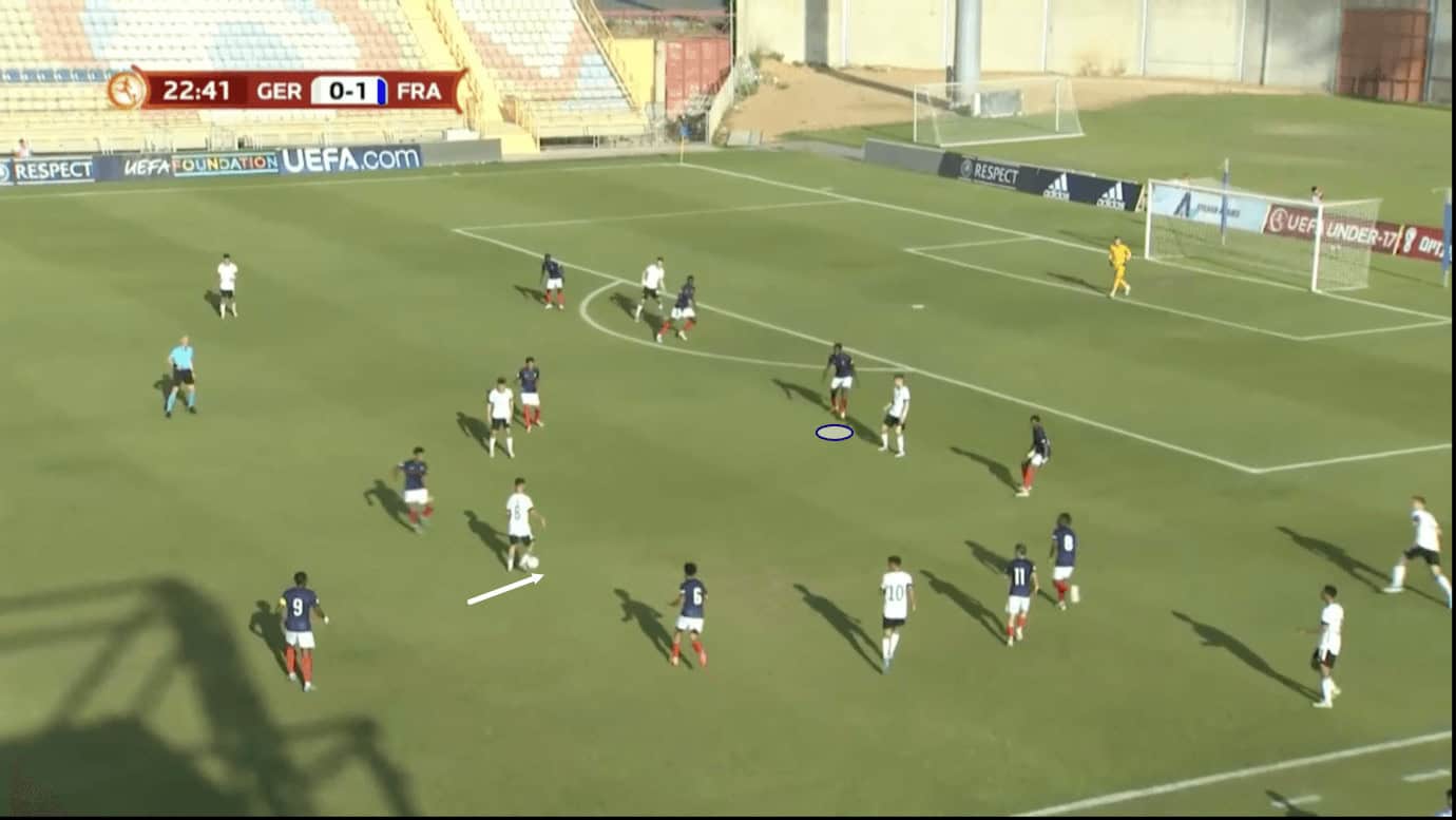 In Figure 4, we see the 17-year-old receiving the ball from his centre-back partner in quite a central position. The opposition is defending in a mid-block, sending just one centre-forward upfield to press the French centre-backs.