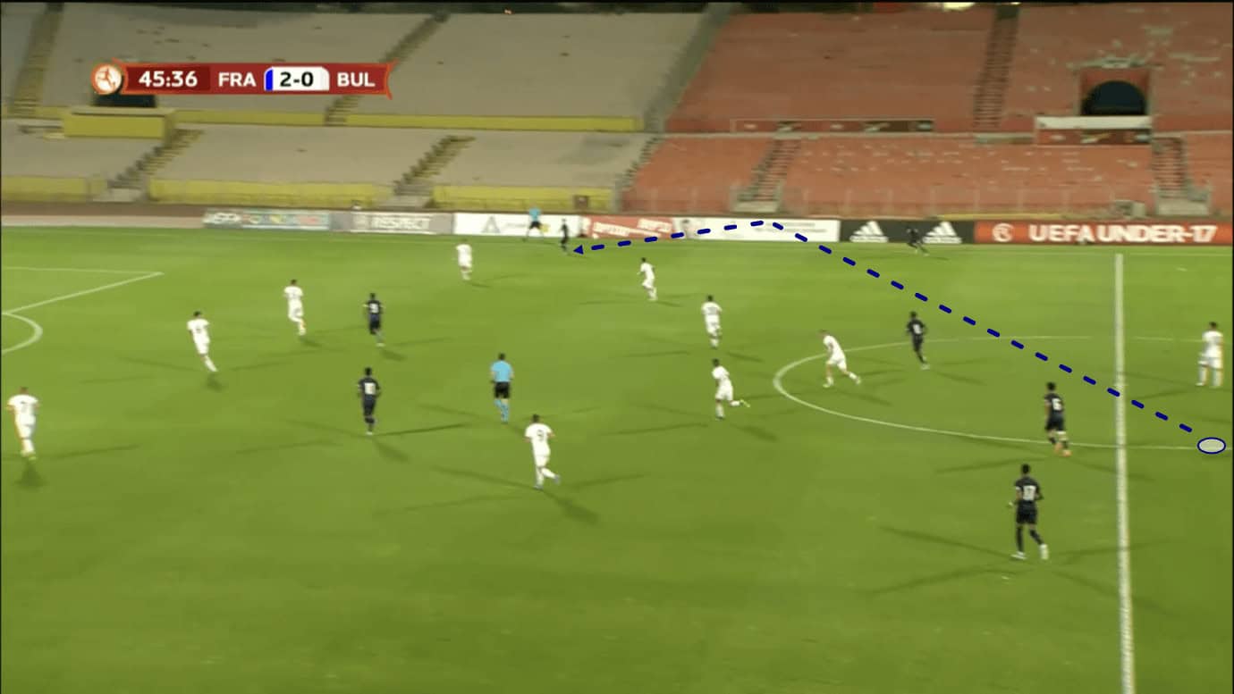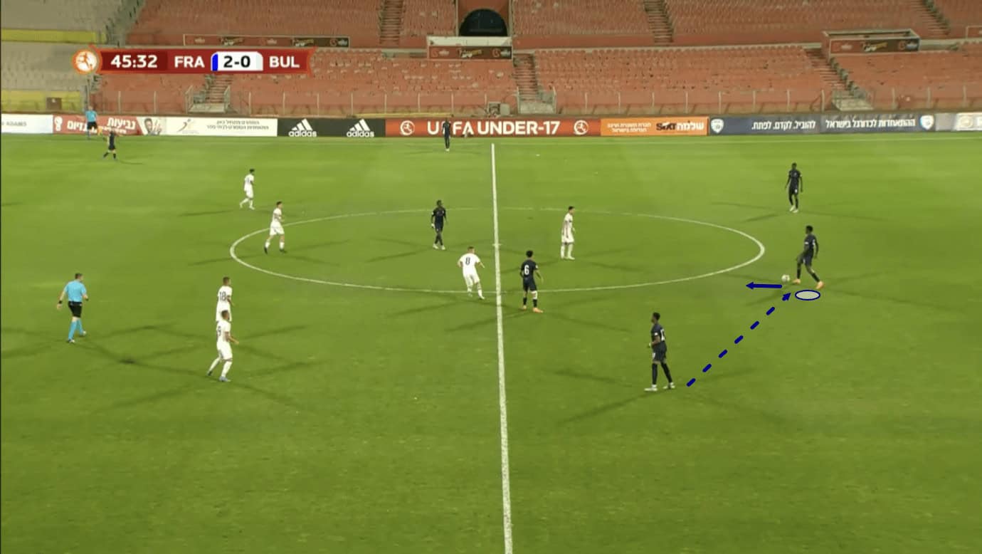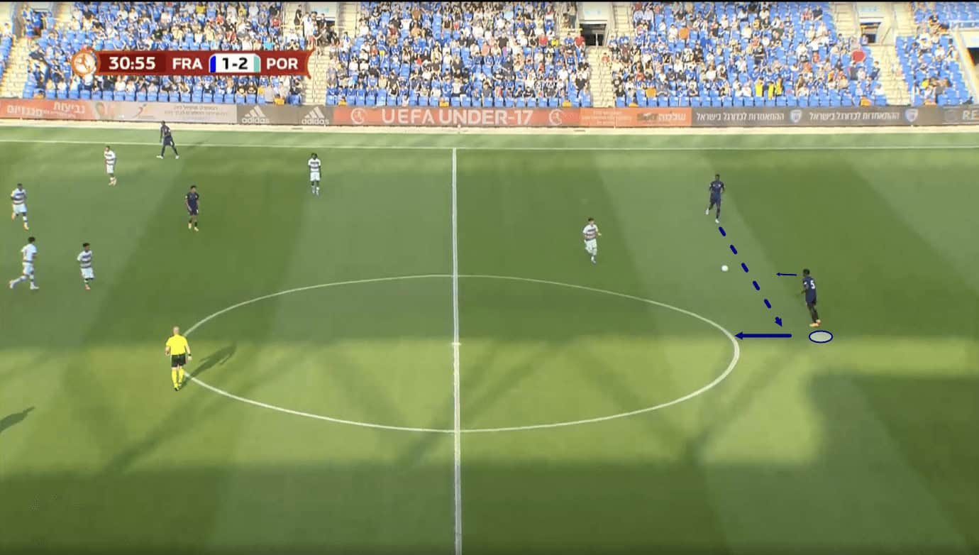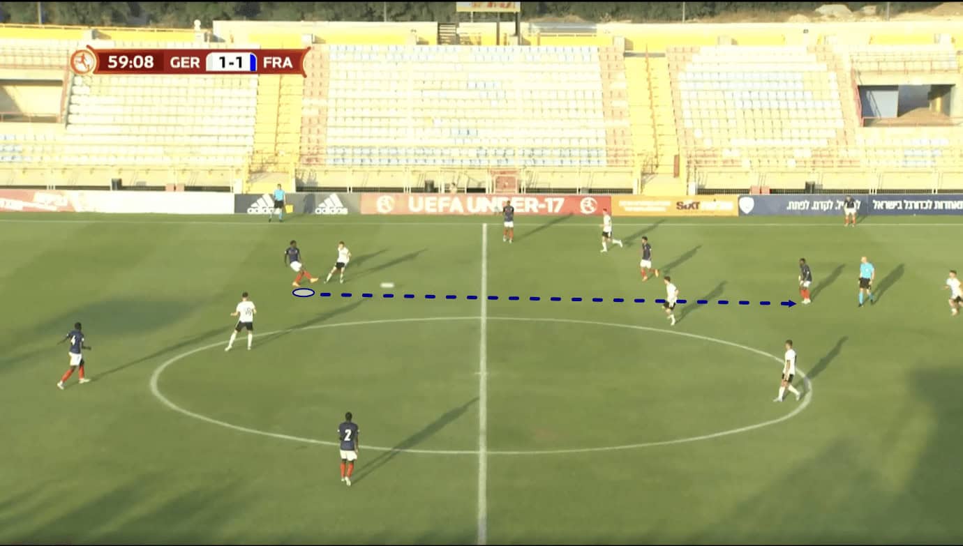 In Figure 4, we see the 17-year-old receiving the ball from his centre-back partner in quite a central position. The opposition is defending in a mid-block, sending just one centre-forward upfield to press the French centre-backs.
