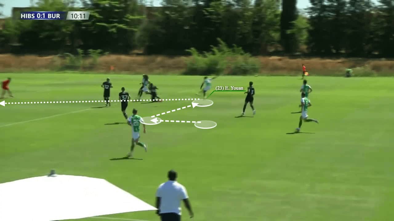 Playing in a central attacking midfield position in Hibs’ 4-2-3-1, Youan picks up a nice position between lines to receive the ball in a central area.