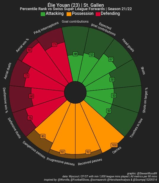 Looking at his pizza chart from 2020/21, which uses Wyscout data converted into percentile ranks to compare him with other forwards in the Swiss Super League (min 1,000 minutes played) that season, we can build a more detailed picture of Youan’s profile.