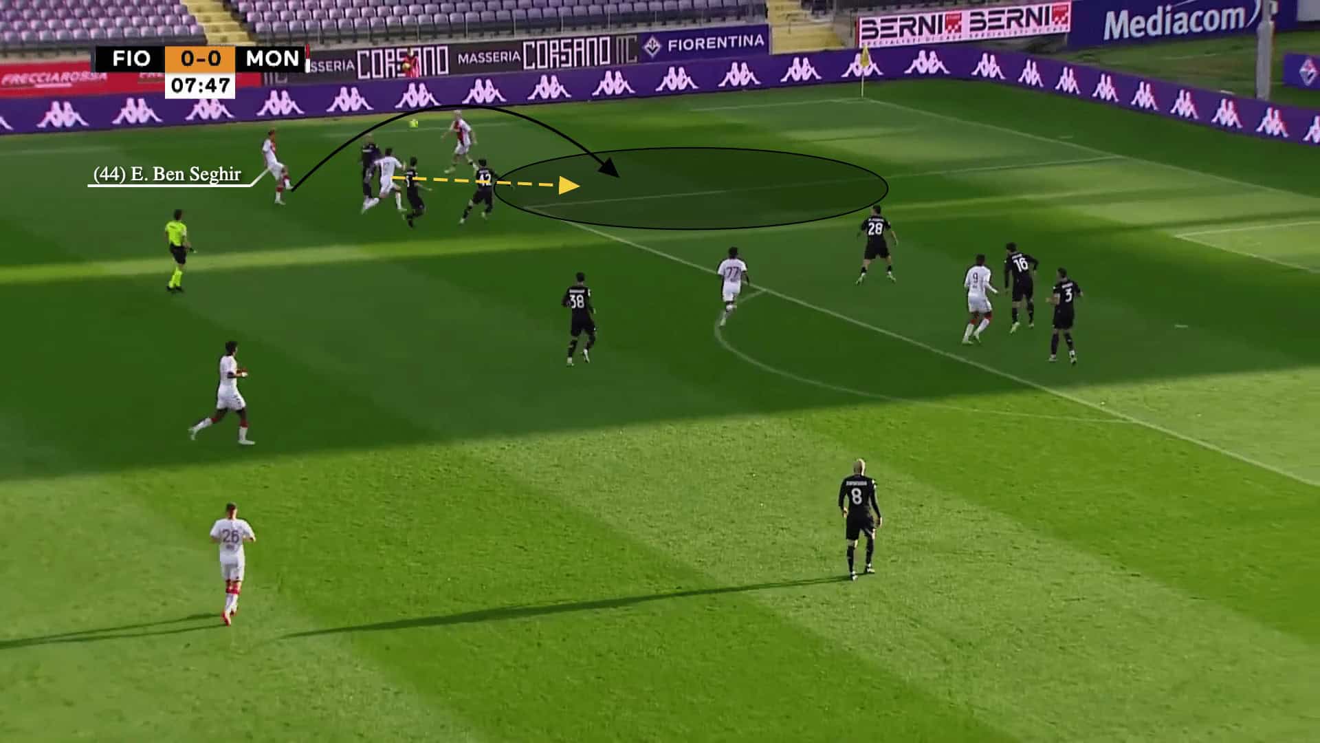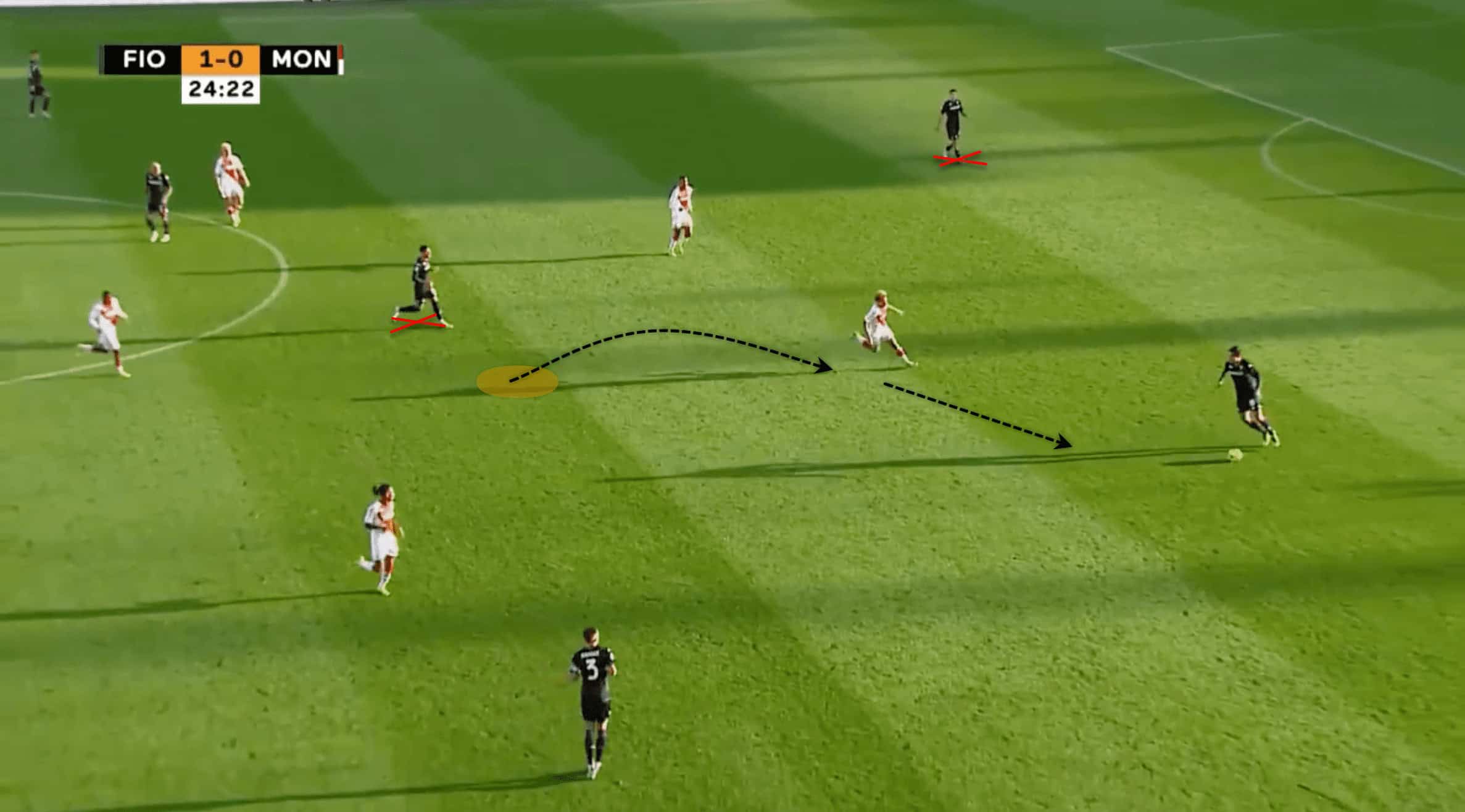 He plans to eliminate the middle pass and the pass to the other central defender. This reduces Monaco’s pressing options and increases the pressure on Fiorentina.