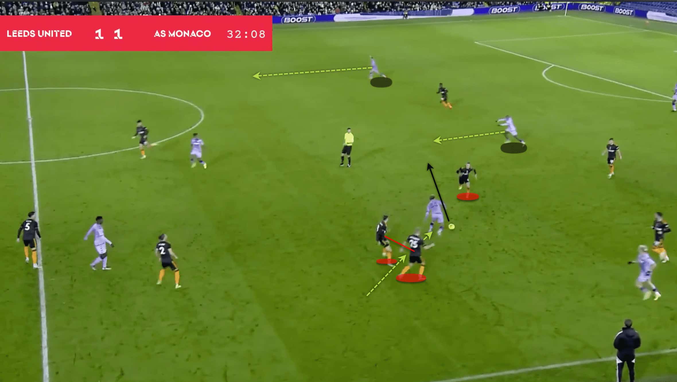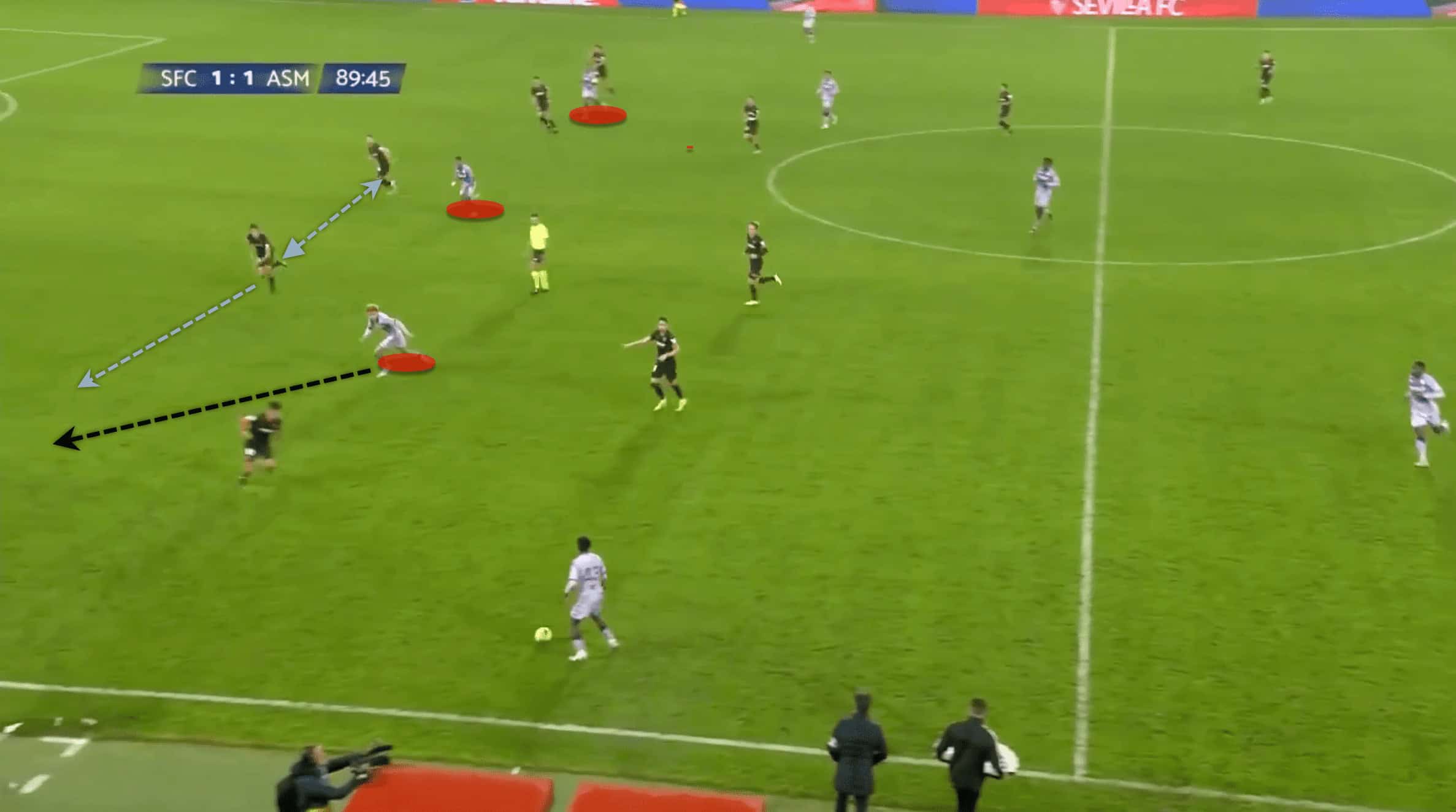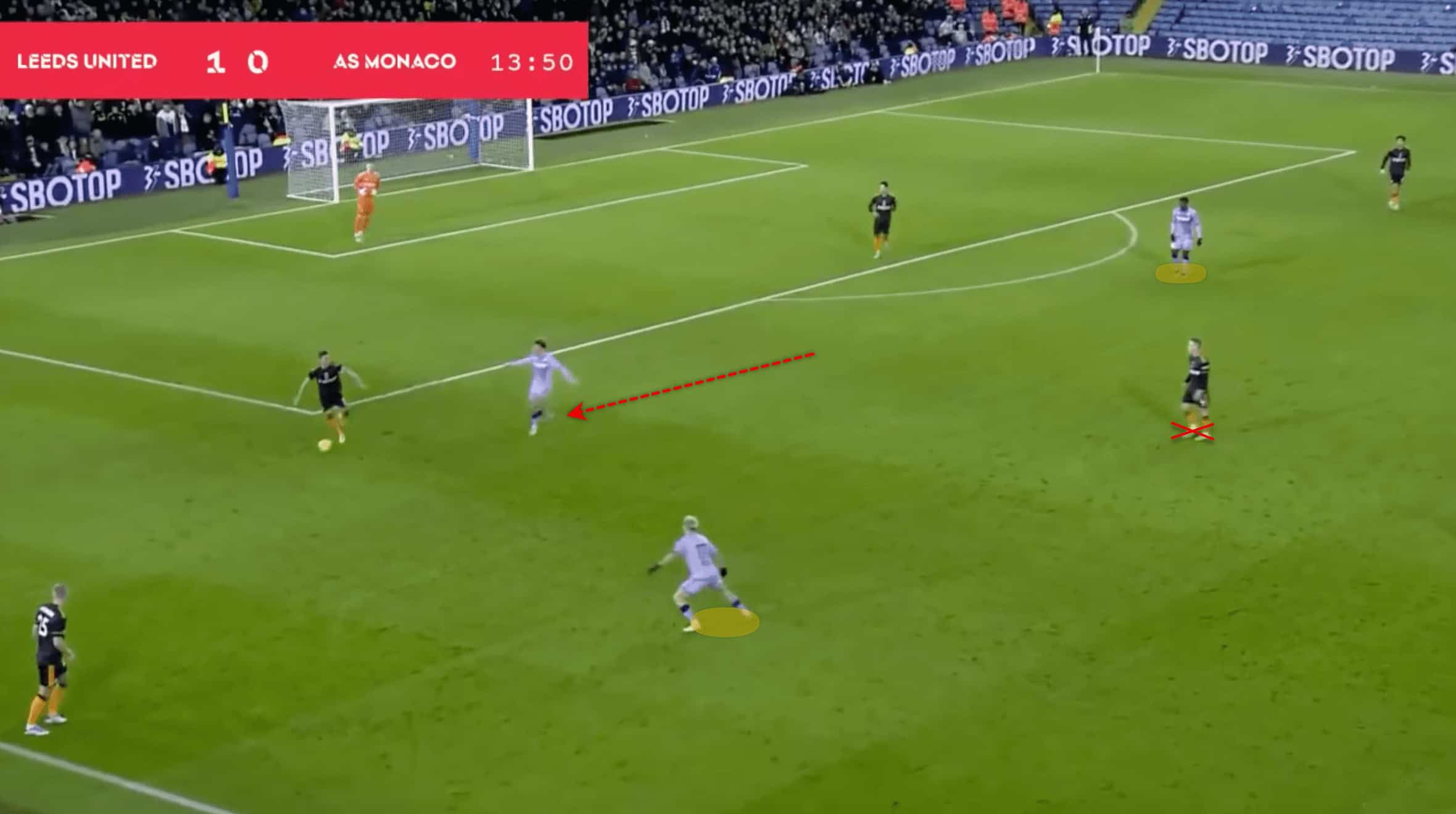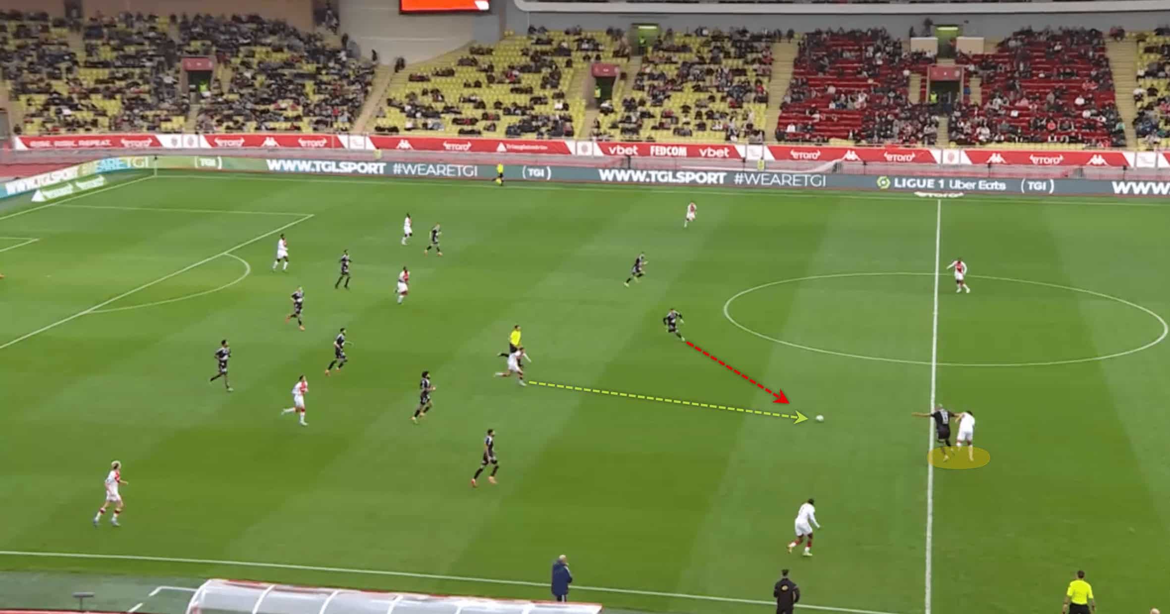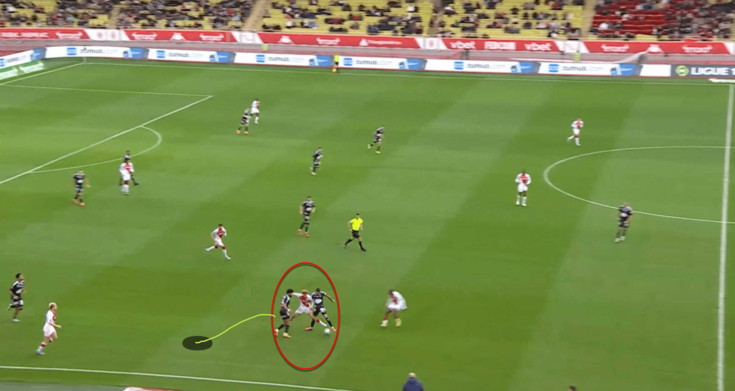 Due to his offensive positioning, his defensive duties have consisted mostly of recoveries, requiring him to drop deep before riding up to help Monaco regain possession. After Monaco’s centre defender loses the battle with Brest’s attacker, he runs against Brest’s offensive midfielder in the top photo.