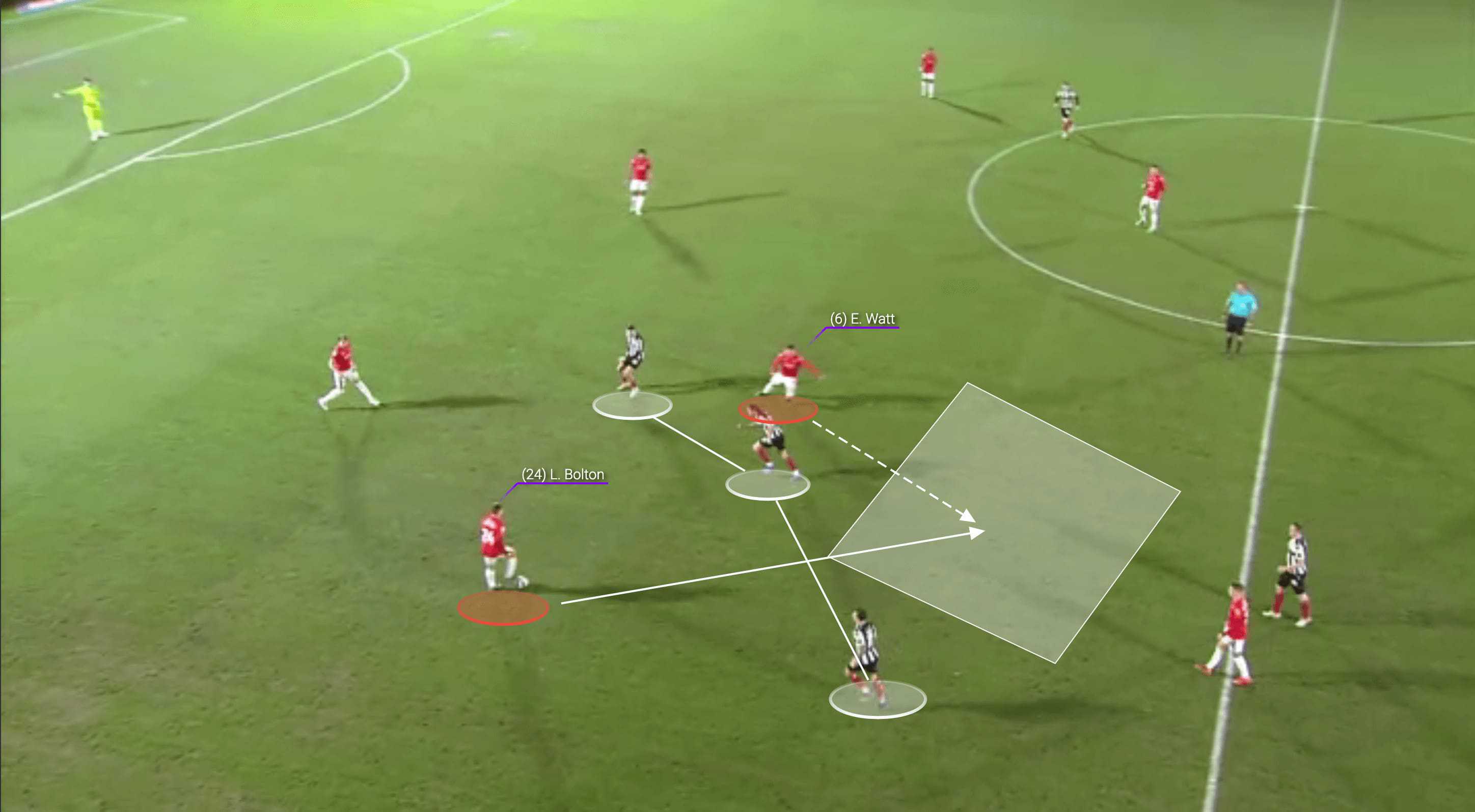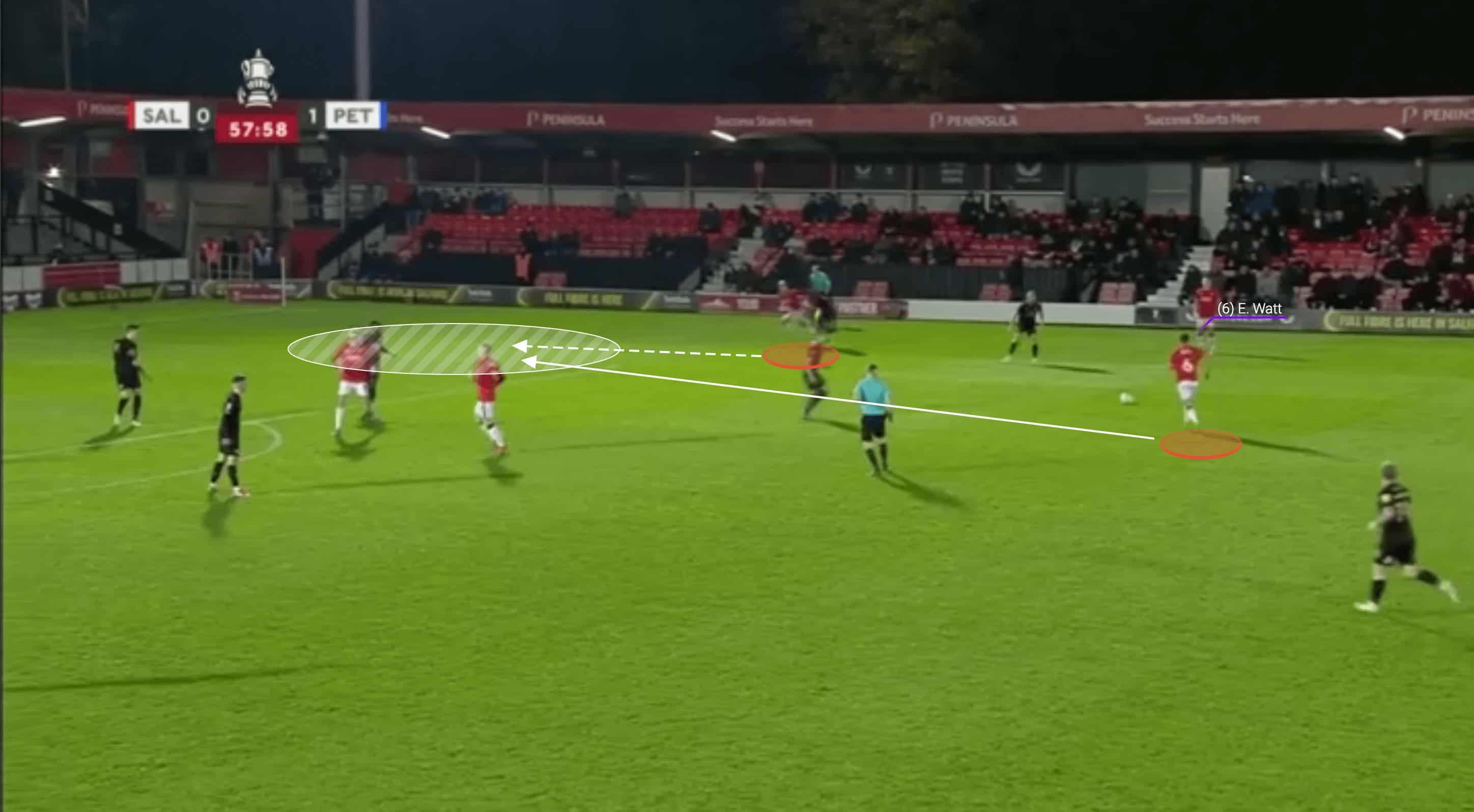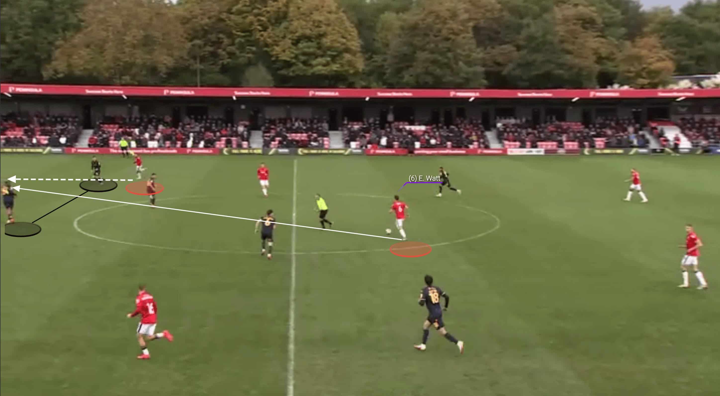 Watt is a very smart footballer who understands how to use angles and positioning in order to give himself and his teammates time and space to utilise the ball. He is very rarely stationary in the game and he will shift position constantly in order to give his teammate in possession options in terms of who they will pass to. We see an example of this here as Watt has initially regained possession through an interception before giving the ball out to Luke Bolton, the right wingback. As three players from the opposition look to press the ball, Watt makes an intelligent movement on their blind side in order to access the shaded area of space and allow Bolton to play the ball through the press.