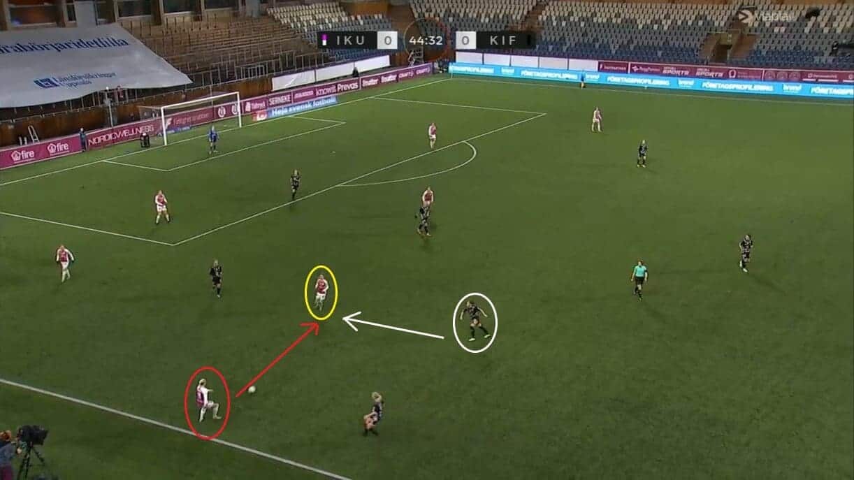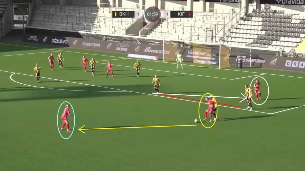 It would be easy to assume that Pelkander only has an effect on games when her team are on the defensive, but that is not the case. She is just as vital to them when they have the ball, with her here helping launch a counterattack and try and catch BK Häcken Dam out before they have had a chance to get back and reset inside their own half.