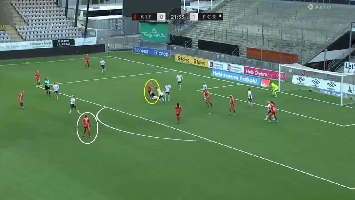 That theme of staying away from the ball and creating space is present in other ways, too, with Pelgander here taking up a position just outside the goal area and not being drawn towards where the ball currently is. By doing so, she not only takes up the attacking midfield role that she has performed so well in for Örebro when in these areas but also helps to keep the pitch as big as possible, meaning that it is instantly a lot more difficult for Rosengård to commit all players in the vicinity to close the ball down.