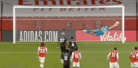 Martínez uses his reflexes to dive to his left, making the save with his fingertips, as seen in the second image.