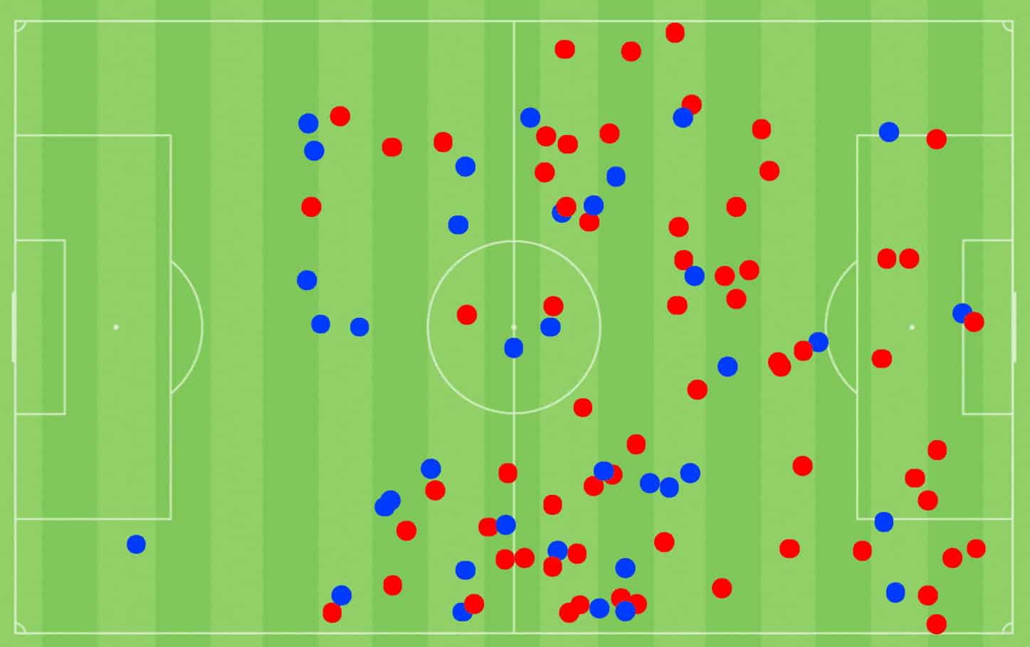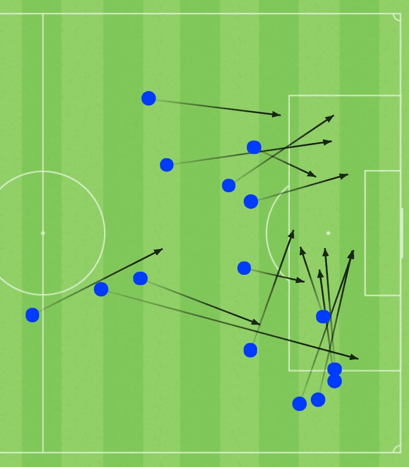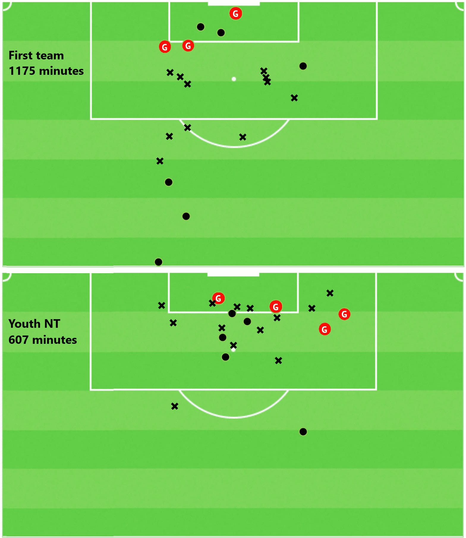 The map below shows his shots with the first team and with the youth national teams. Playing senior football, he has into interesting scoring positions and has tried more speculative shots too but with the national team, he has shot a lot from high xG zones near the six-yard box and has also shown his quality to cut inside from the right and shoot.