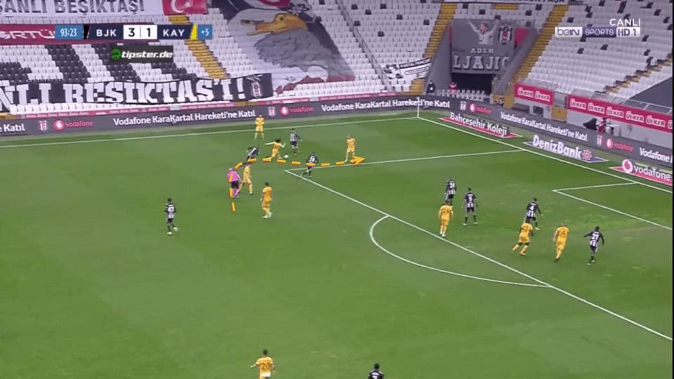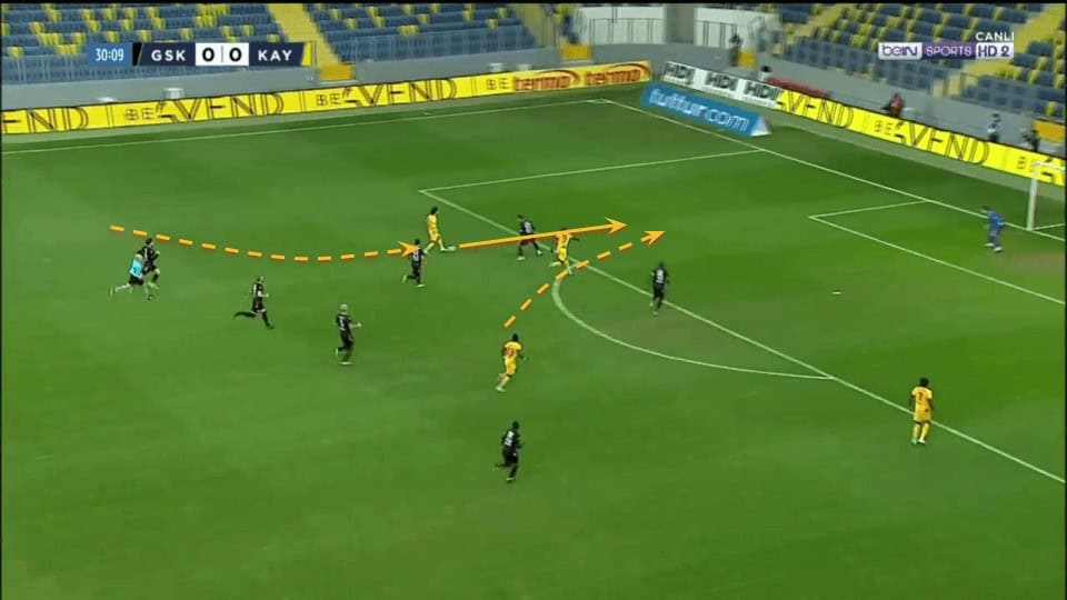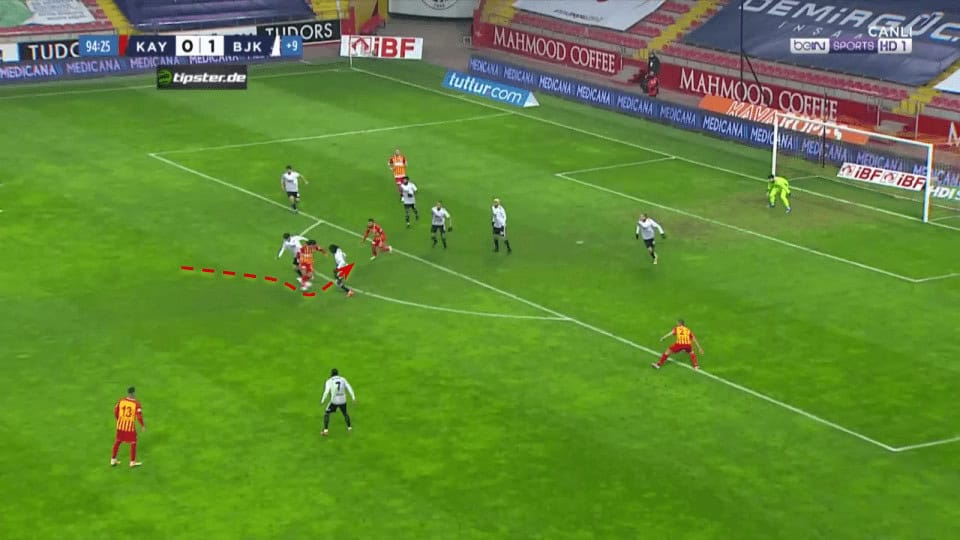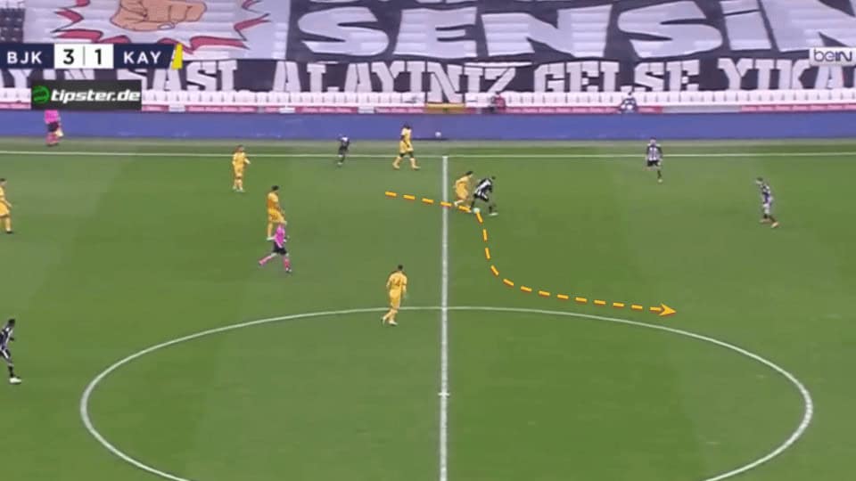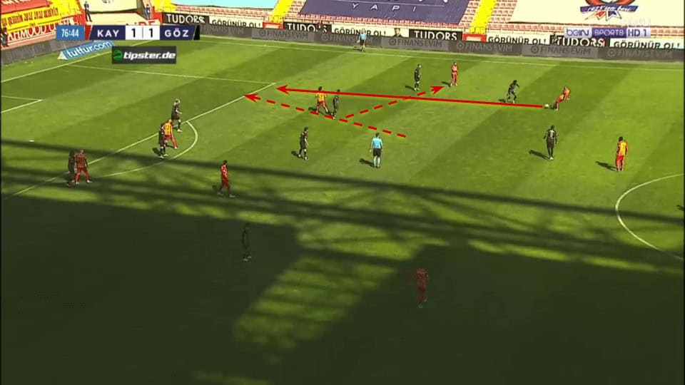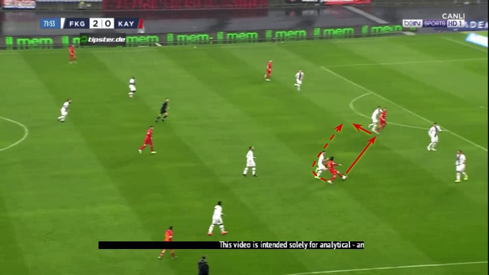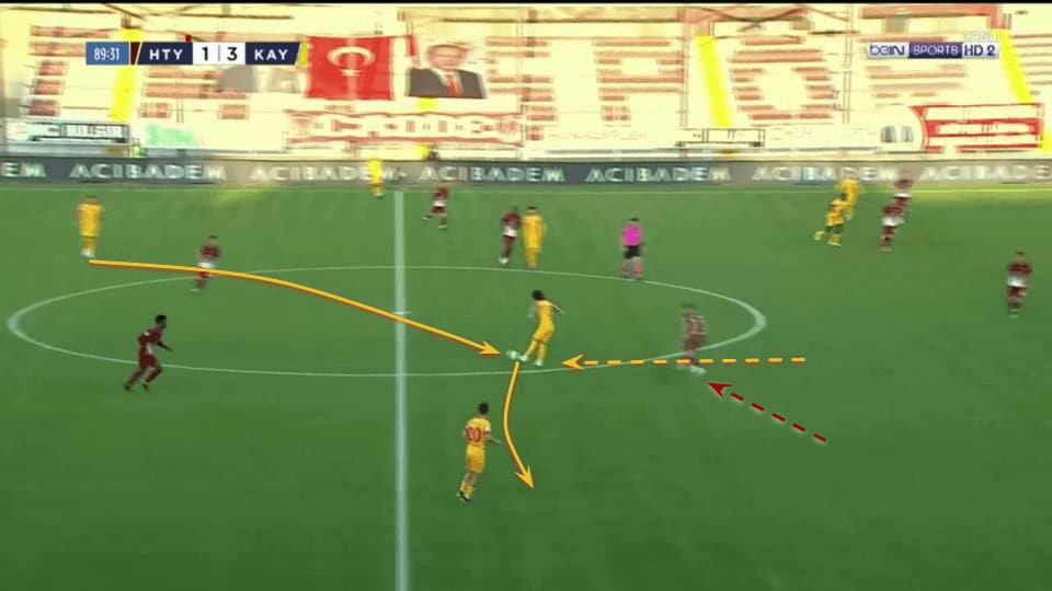 Plays like the one above in which Demir can’t even be pressed when receiving between the lines are an important part of his game as he can accelerate the attacks through the middle with just one touch.
