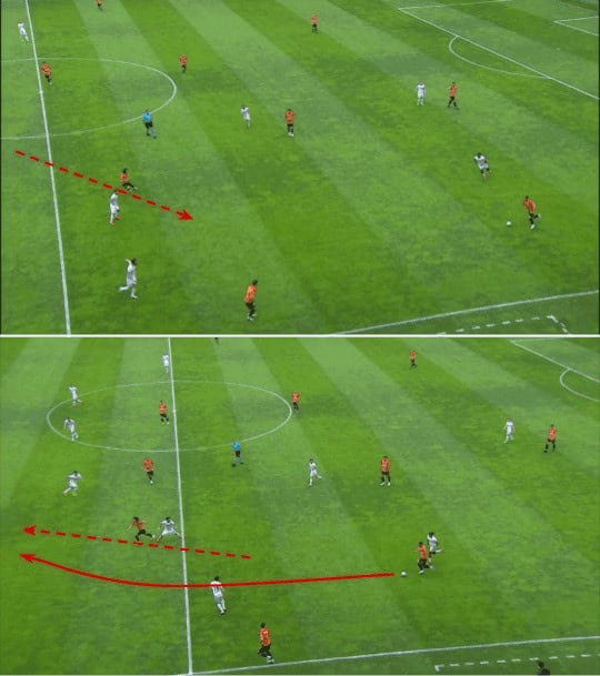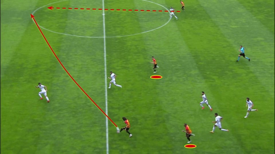 The example below is an interesting one. In an attacking transition, Demir has two good options for a short pass but he raises his head and spots the run of his teammate on the opposite side of the field which could lead to creating a chance directly with just one pass. He then trusts his technique and hits the longer pass into the run of his teammate.