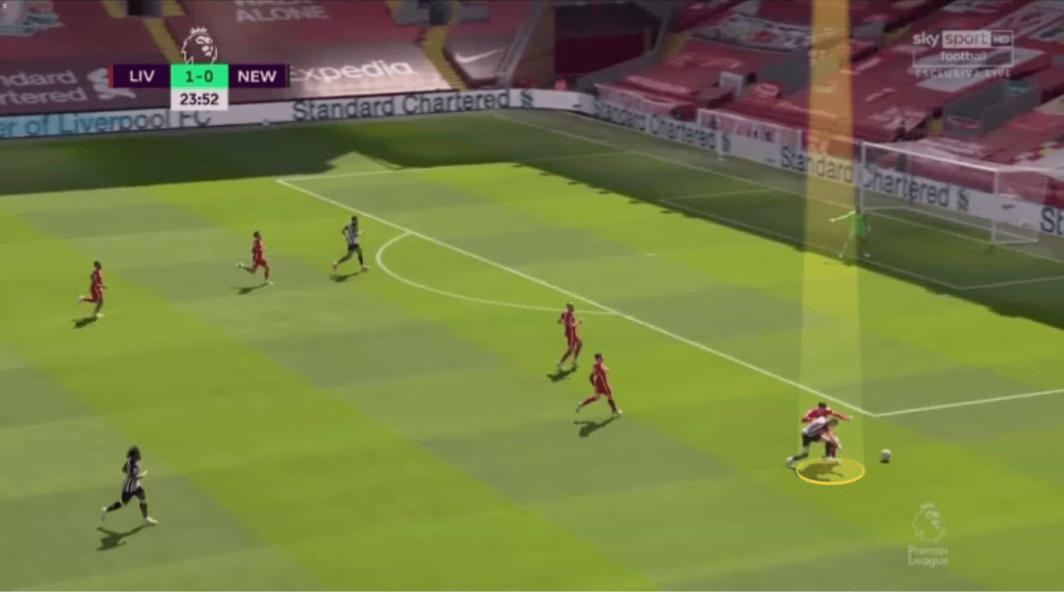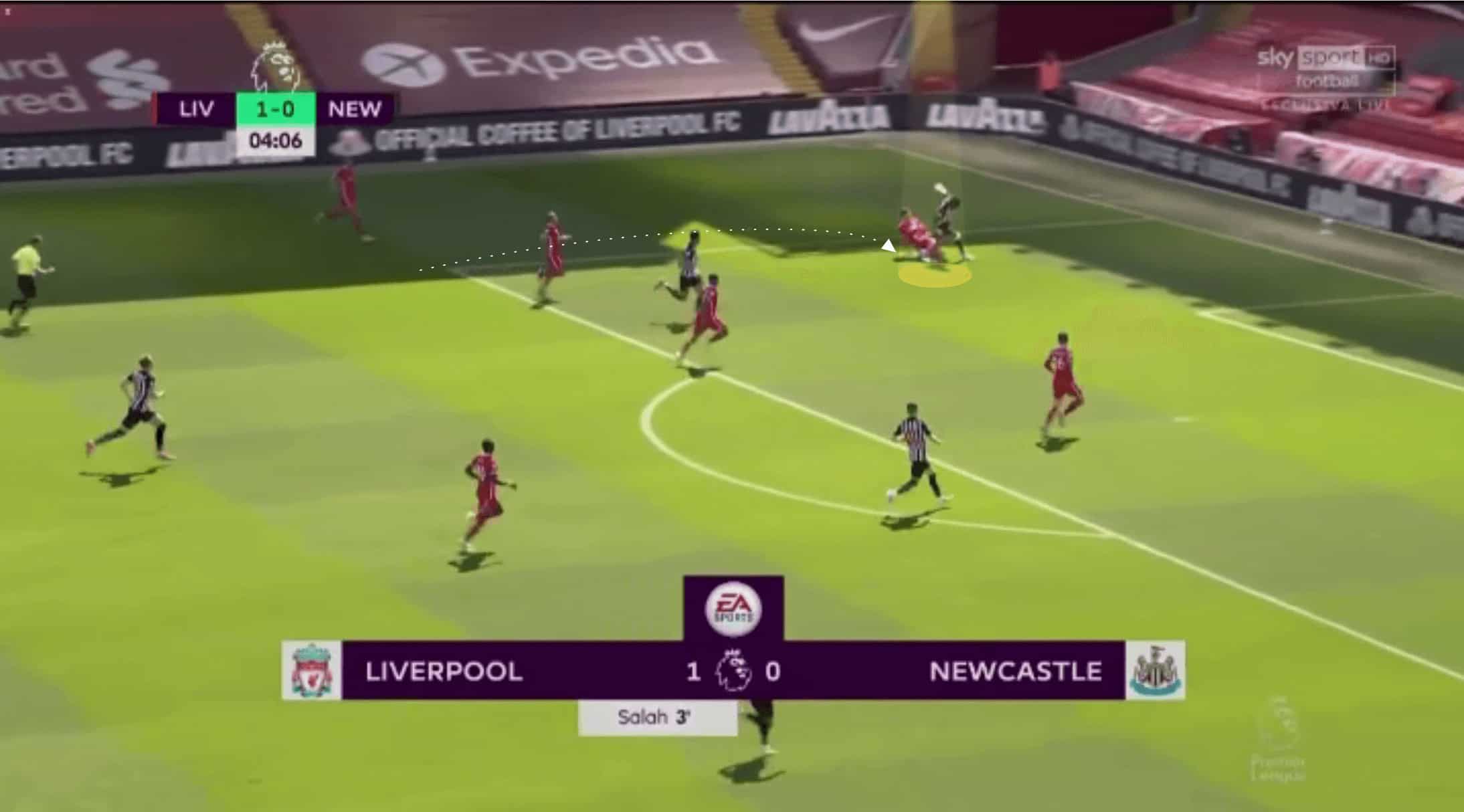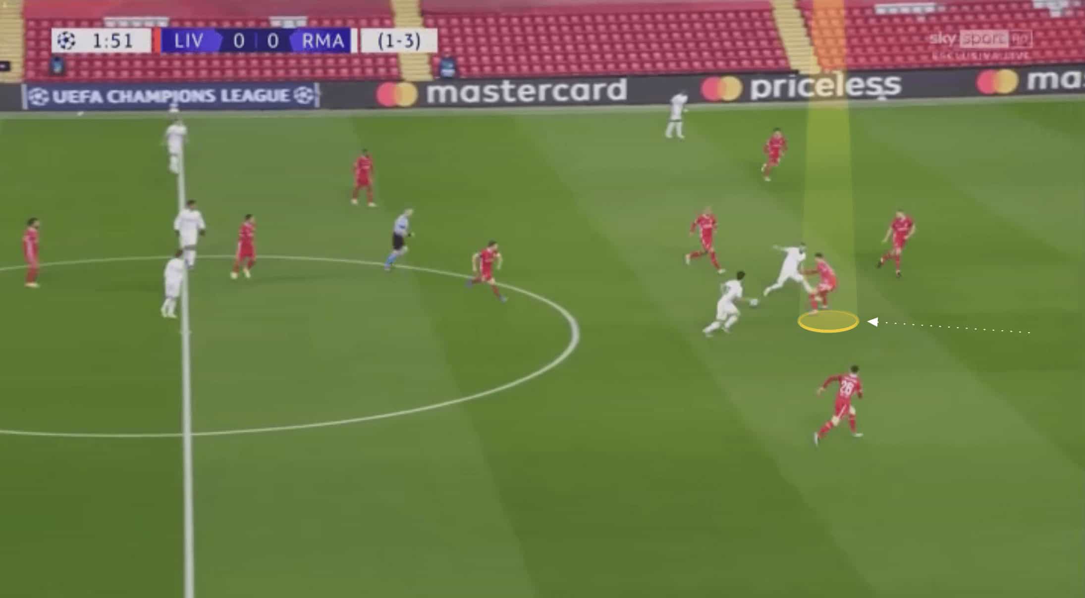 On the flip side, he looks to show inside in the example shown below, but the pass is played to his outside. Whilst this is certainly less of an issue than the previous example, Kabak needs to develop an understanding of his positioning across the width of the pitch. Below, if he wanted to show the pass into the area he was facing, giving him a greater chance of making an interception or catching the forward, then a slightly wider position would have benefited him. Whereas in the previous image, he either needed to get more narrow, preventing the straight pass or again go wider and face inside, where he could catch the forward more easily.