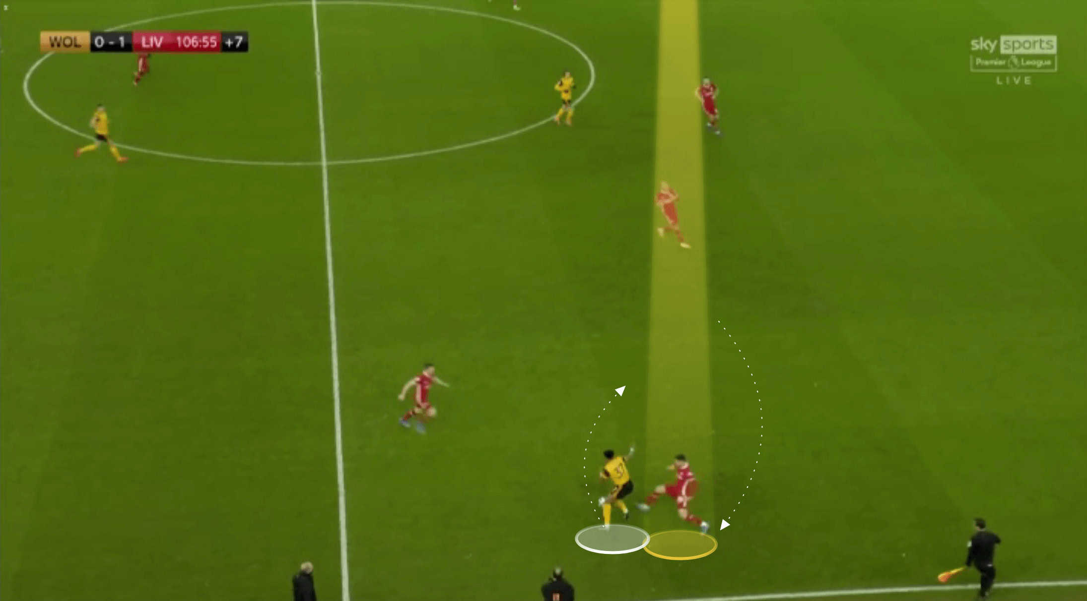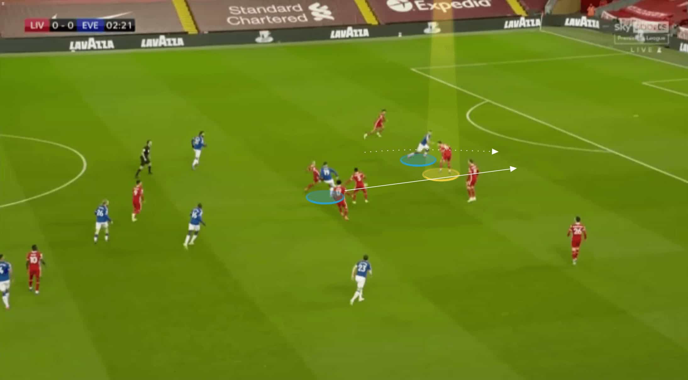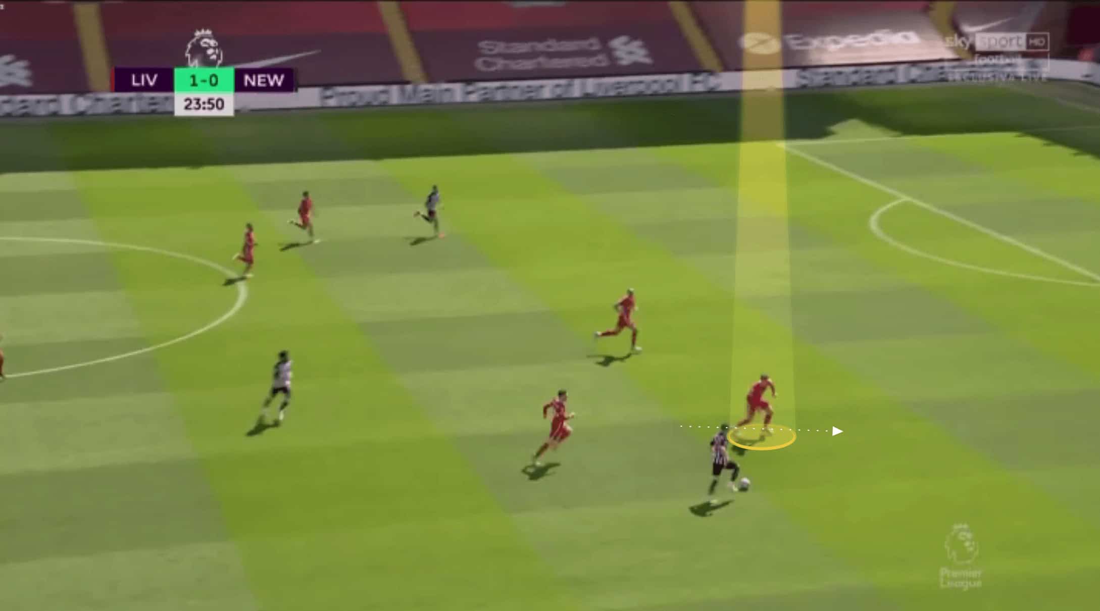 On the flip side, he looks to show inside in the example shown below, but the pass is played to his outside. Whilst this is certainly less of an issue than the previous example, Kabak needs to develop an understanding of his positioning across the width of the pitch. Below, if he wanted to show the pass into the area he was facing, giving him a greater chance of making an interception or catching the forward, then a slightly wider position would have benefited him. Whereas in the previous image, he either needed to get more narrow, preventing the straight pass or again go wider and face inside, where he could catch the forward more easily.