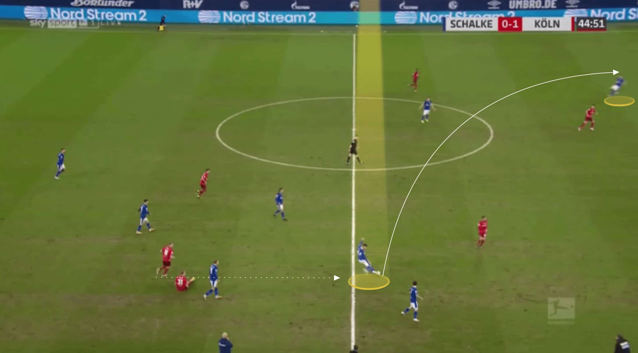 However, Kabak is fond of a longer ball forward, specifically a cross-field diagonal long pass. He hits these with quality technique, good accuracy, and a weight of pass that makes it difficult for defenders to get across and intercept in time. Kabak is able to hit direct passes and pick out players even heavily covered by defenders. This type of pass has clear advantages and benefits, but it should be noted that Kabak may pass up on making central progressive passes in favour of playing one of these diagonal balls. The image below shows an example of this.