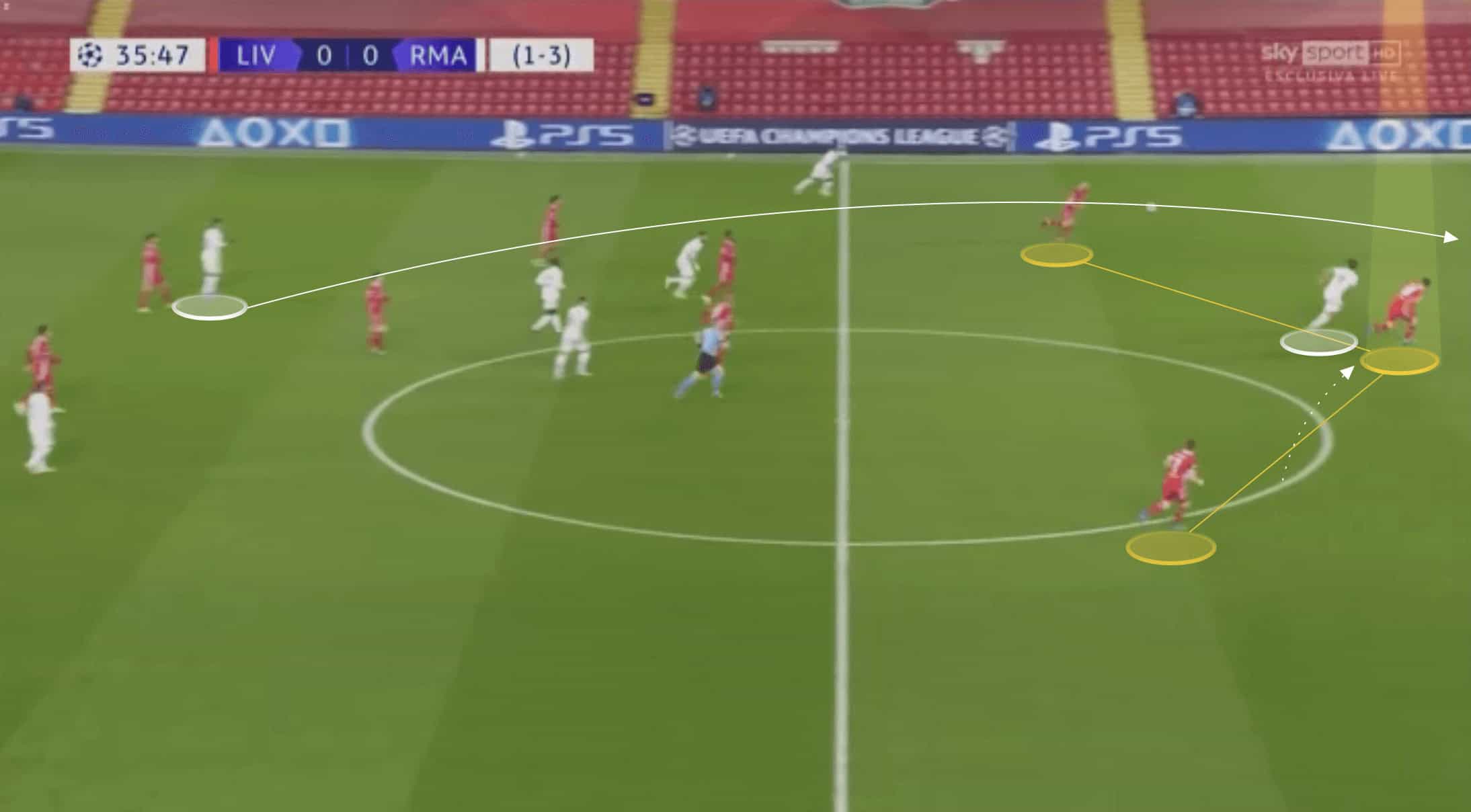Kabak is very quick to play forward or specifically hit one of these longer passes on attacking transition. Kabak will make an interception or tackle and will already have seen the pass option before making the challenge. As a result, he doesn’t need to look up or set himself before playing this pass, and he can launch a counter-attack quickly as a result.