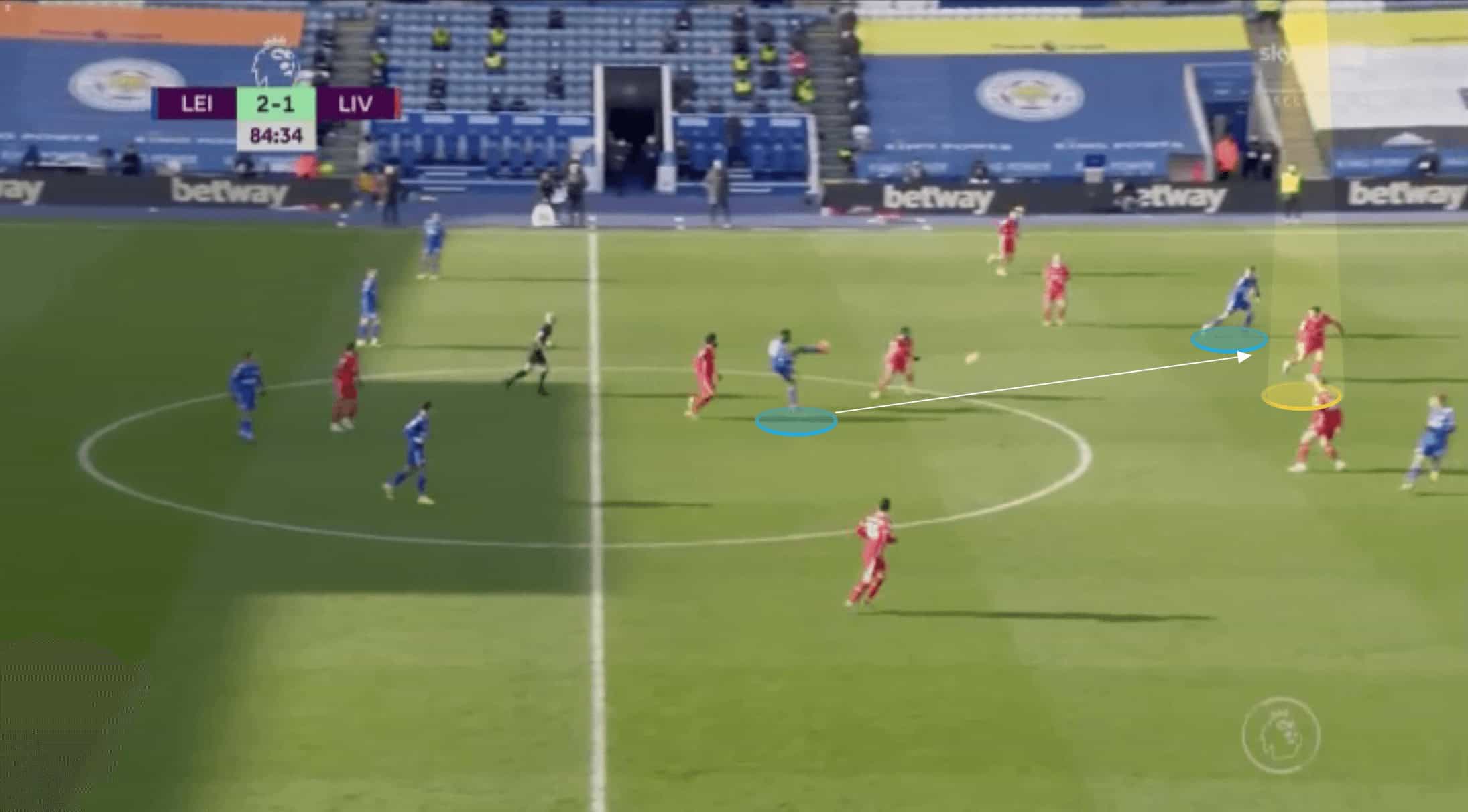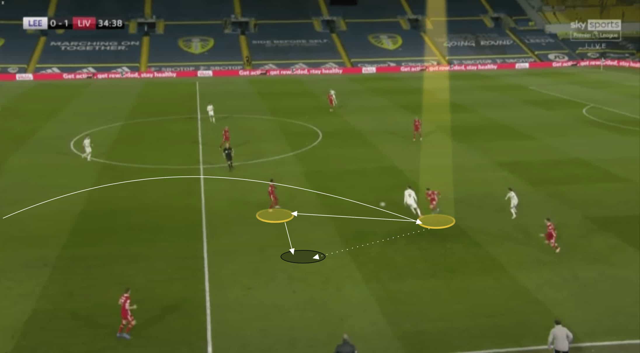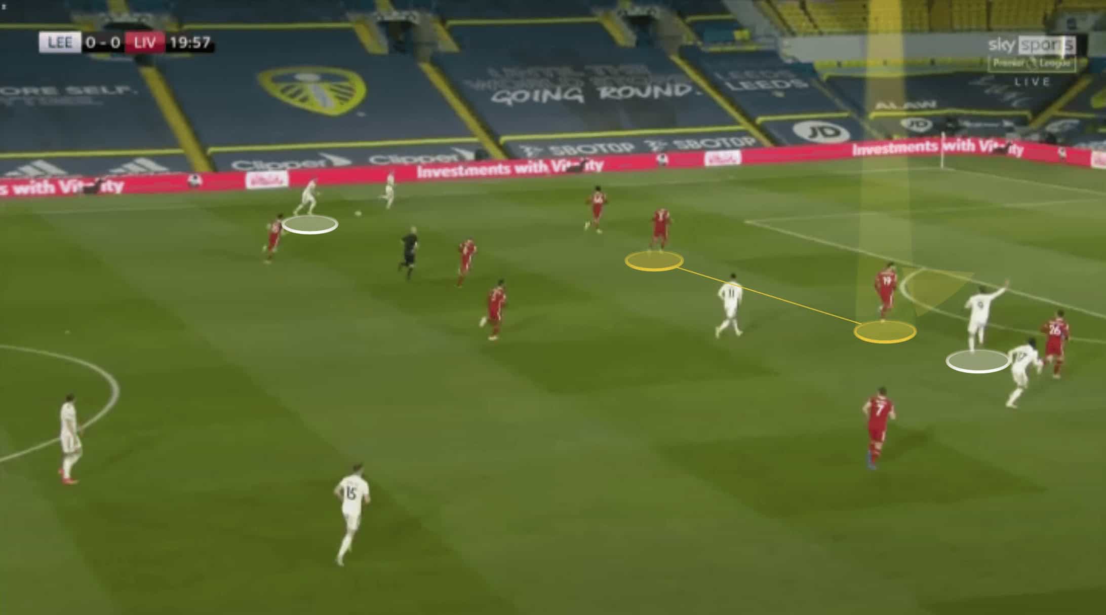 Kabak adjusts his positioning by looping slightly away from Fabinho whilst still facing forward. In doing so he is able to cut out the run of the forward-positioned behind him whilst still covering the threat of the second Leeds attacker further inside.