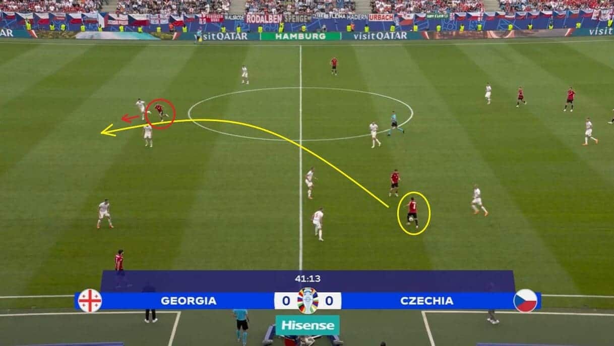 Here, he has seen the amount of unprotected territory that the Czech Republic have left open behind their high backline and so has moved to exploit it for his own gain.