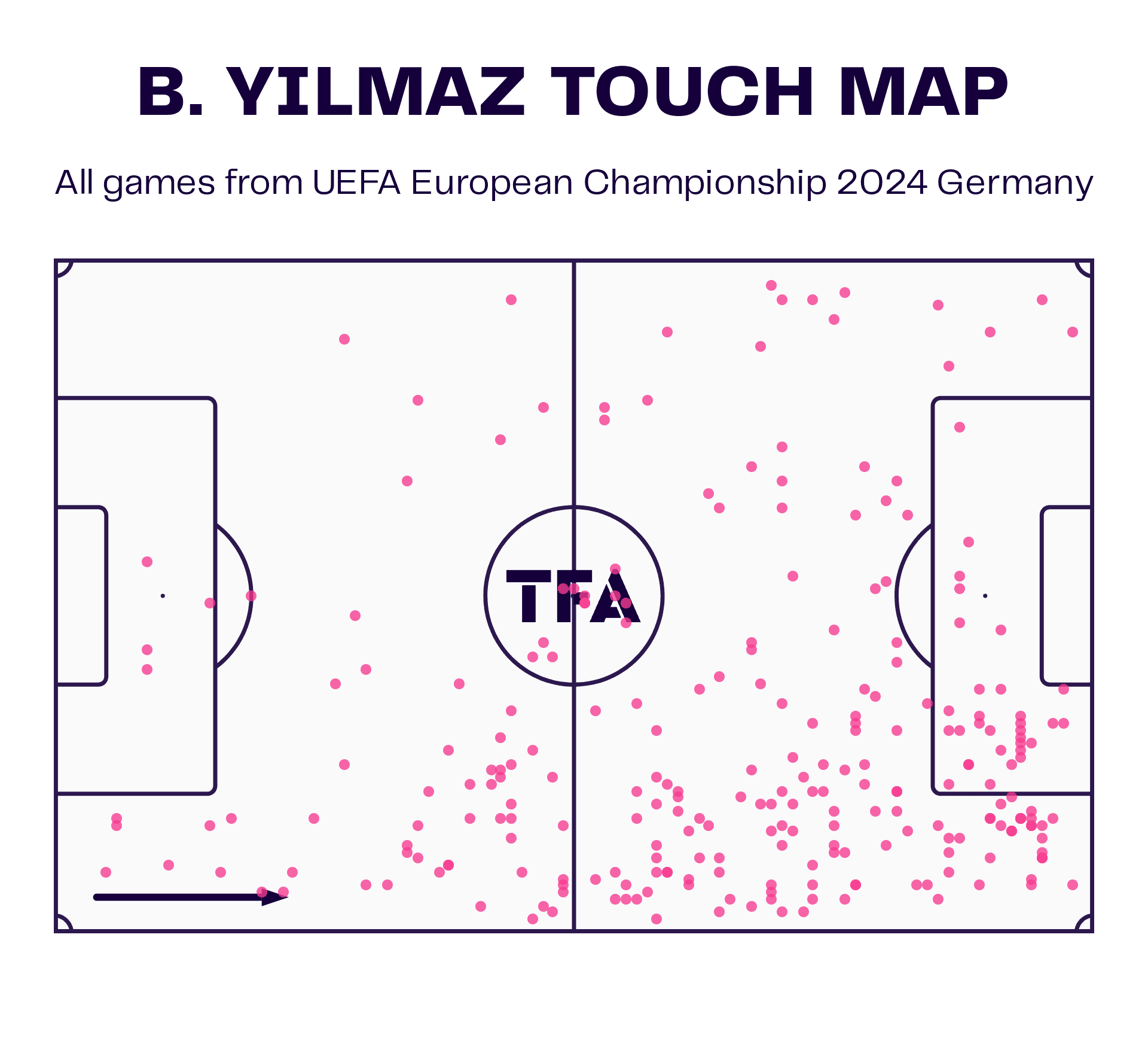 This is facilitated by Turkey deploying full-backs who naturally play in advanced positions, freeing up their forwards to operate closer together, and it has allowed Yılmaz to play with a significant degree of unpredictability whenever he has had the ball.