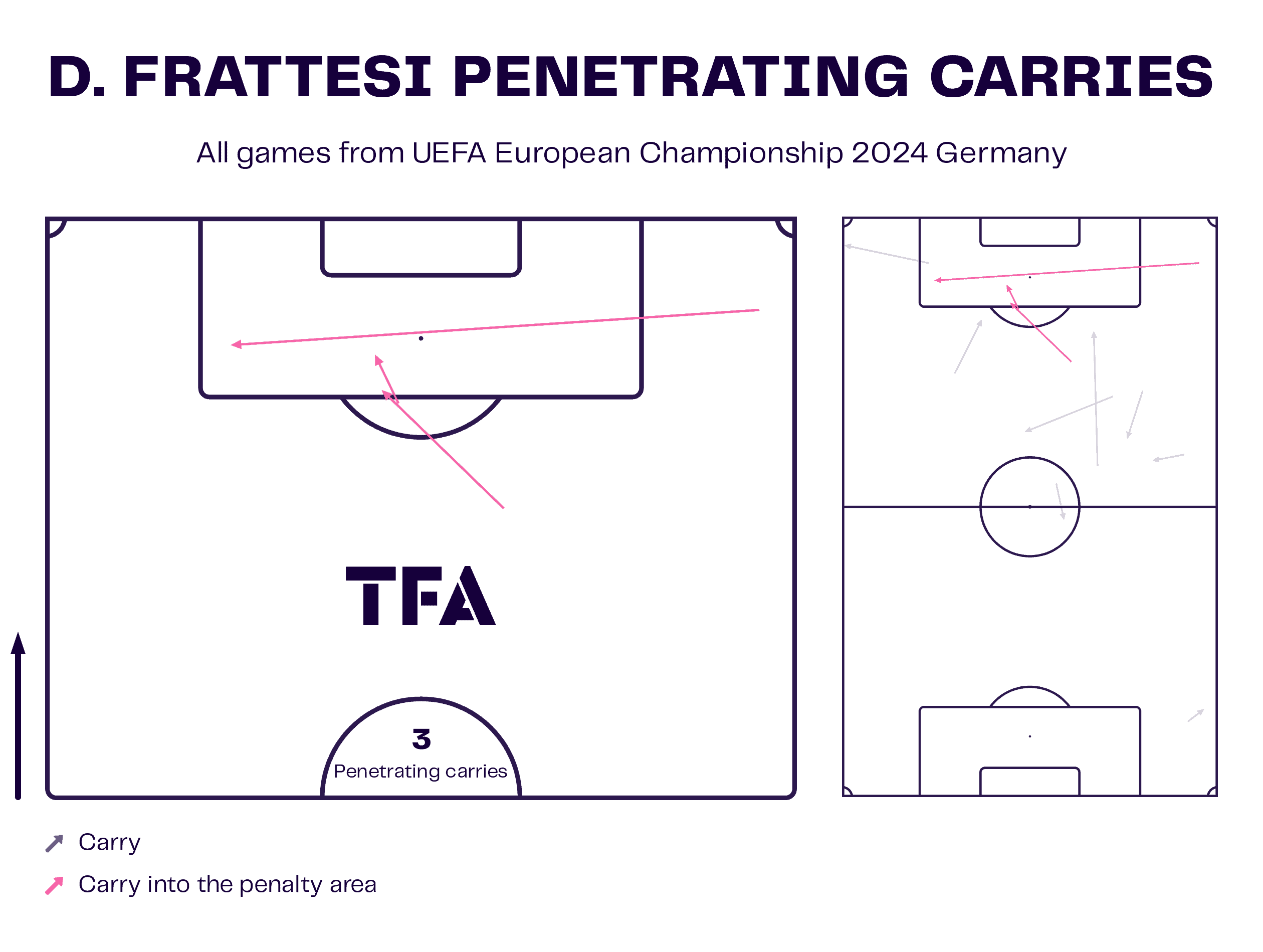 As a result, Frattesi is left frustrated, and it was a situation in which he could have run through to shoot at goal, with the fact that he averaged 4.37 touches inside the penalty area per game and won 50% of his offensive duels (including three out of four against Croatia) showing that he constantly wanted to get into forward areas when on the pitch.