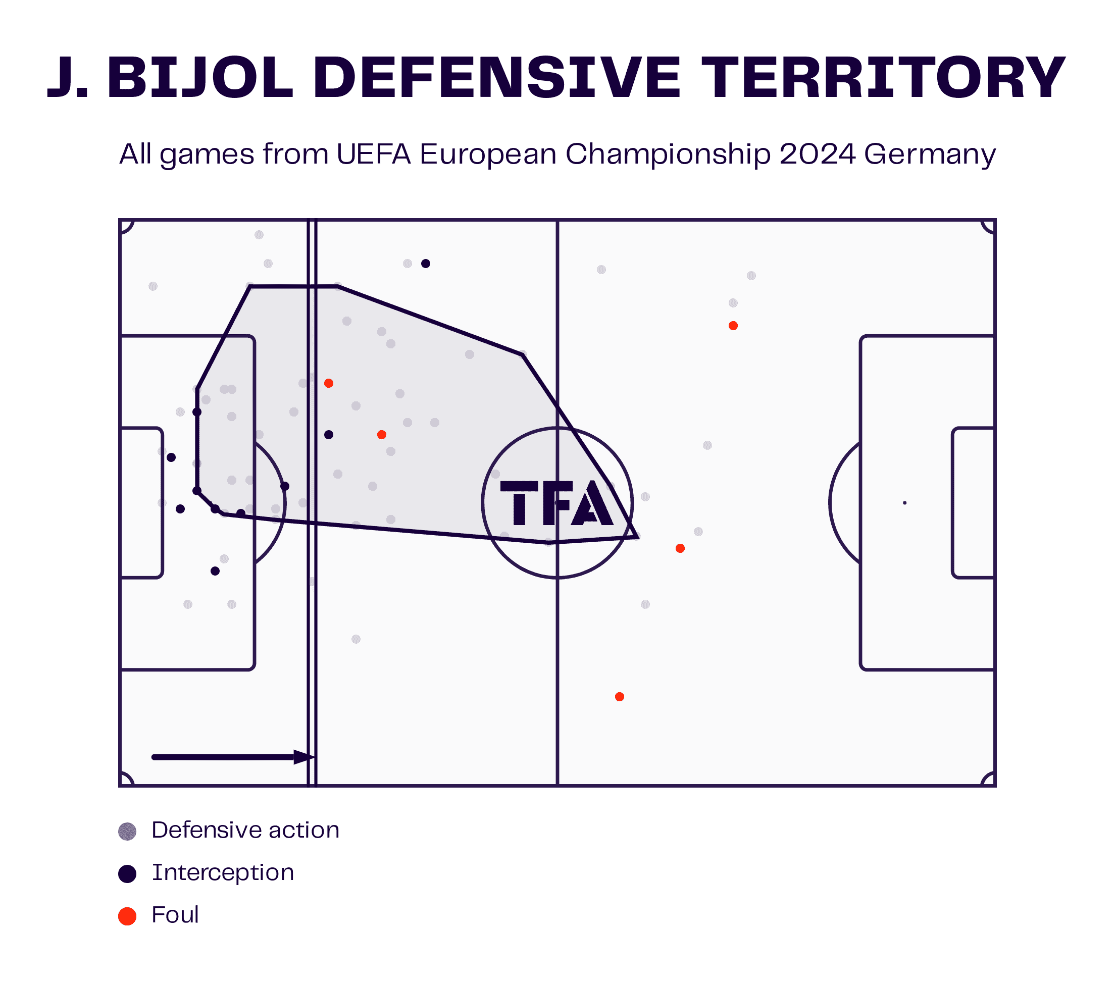 It is clear that Bijol made a number of contributions further up the pitch, but there is a high concentration of defensive actions and interceptions in his own goal area.