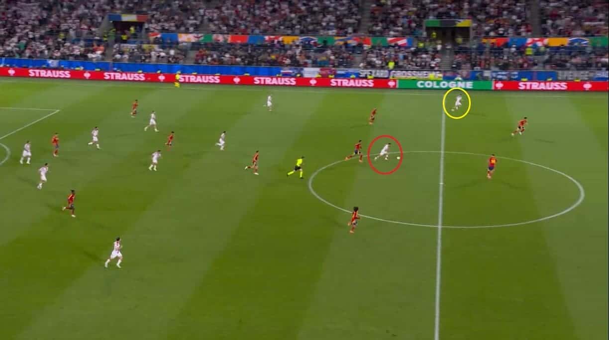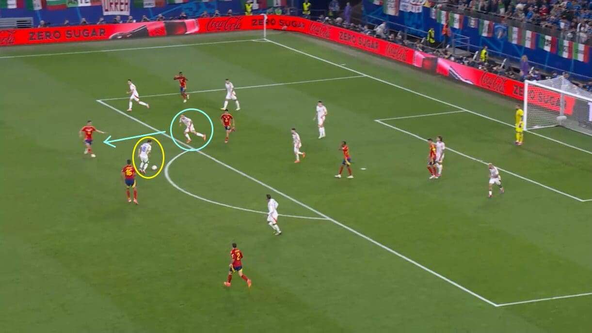 In this case, he has sat back in the defensive shape that Italy head coach Luciano Spalletti demanded, but it can be seen how he is looking for a way to break out and to get his team onto the front foot, with his one-two pass with Nicolò Barella intended to catch Spain out and to try and allow Italy to attack the unguarded territory behind them.