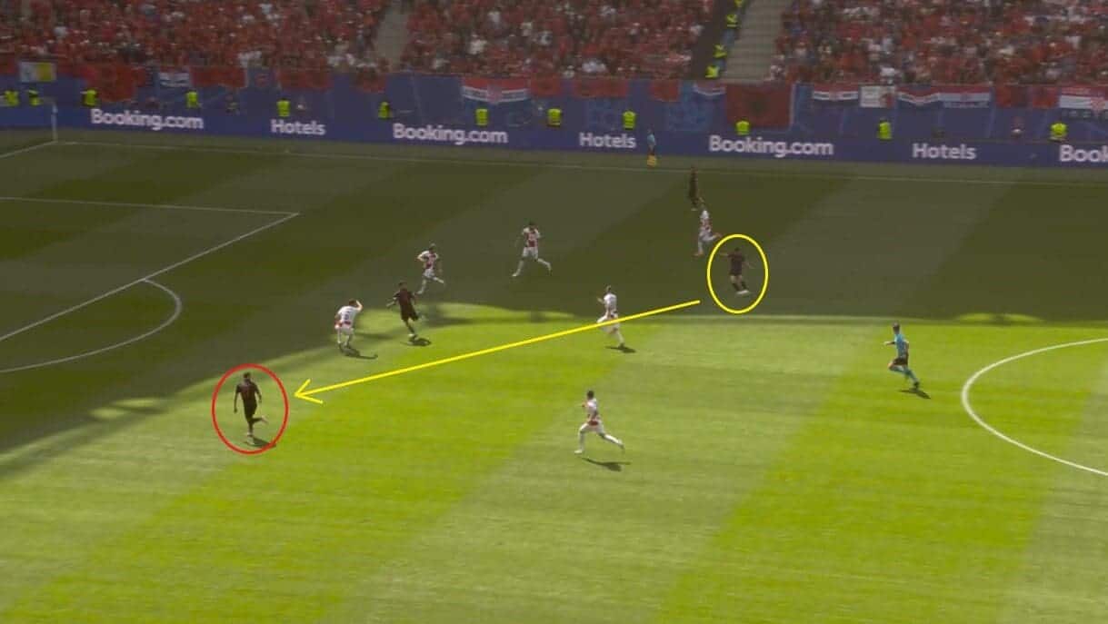 In this case, Asllani has taken up the role of the outlet at the top of the field, having got forward and spotted the open space on the near side of the Croatian defensive line, which shows he has good awareness of his surroundings and can react to chances to exploit opposing weaknesses.