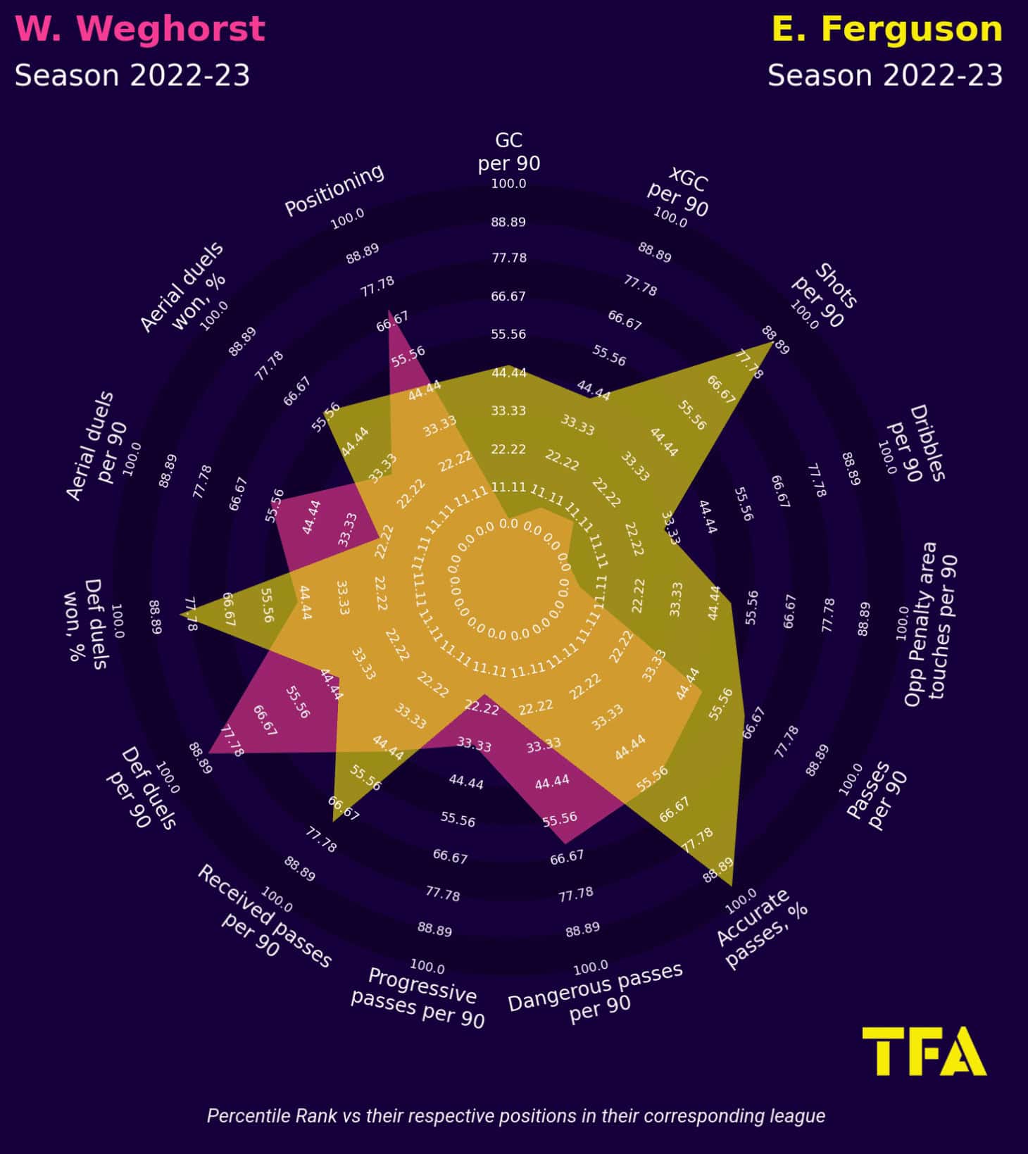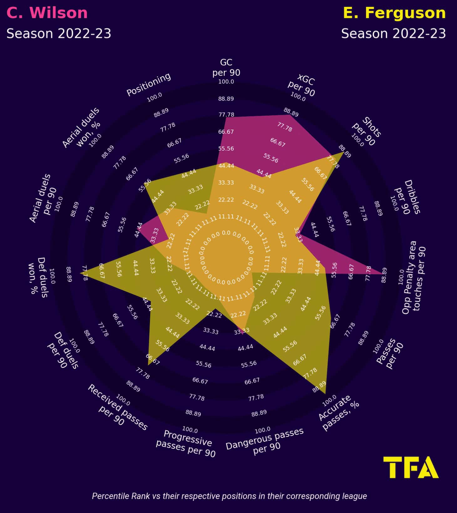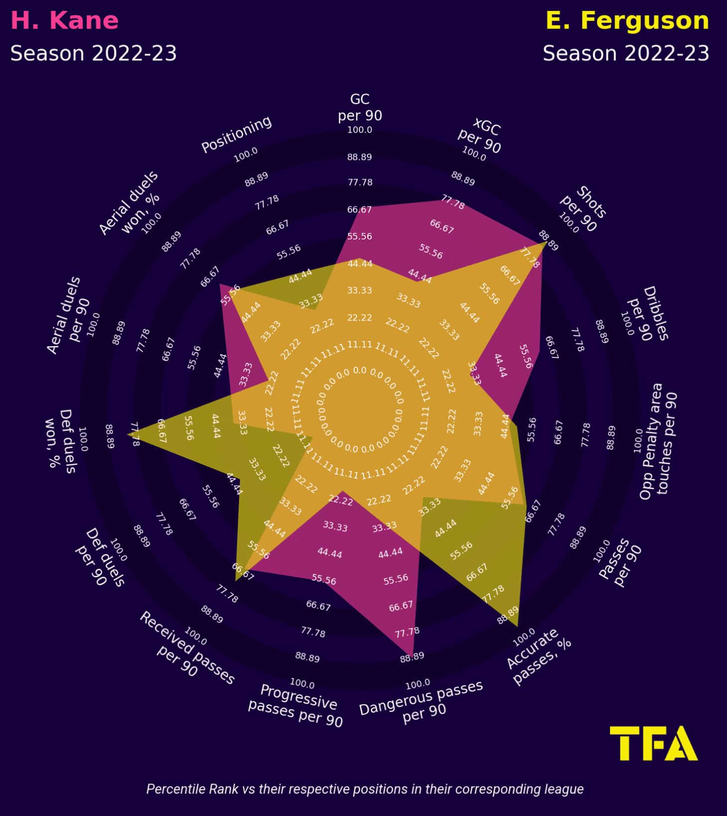 From the heatmap above, we can see that whilst he may share some traits of an ‘old-school’ number 9 with his striker’s instinct, Ferguson is straight out of the Harry Kane mould of what a good forward should be.