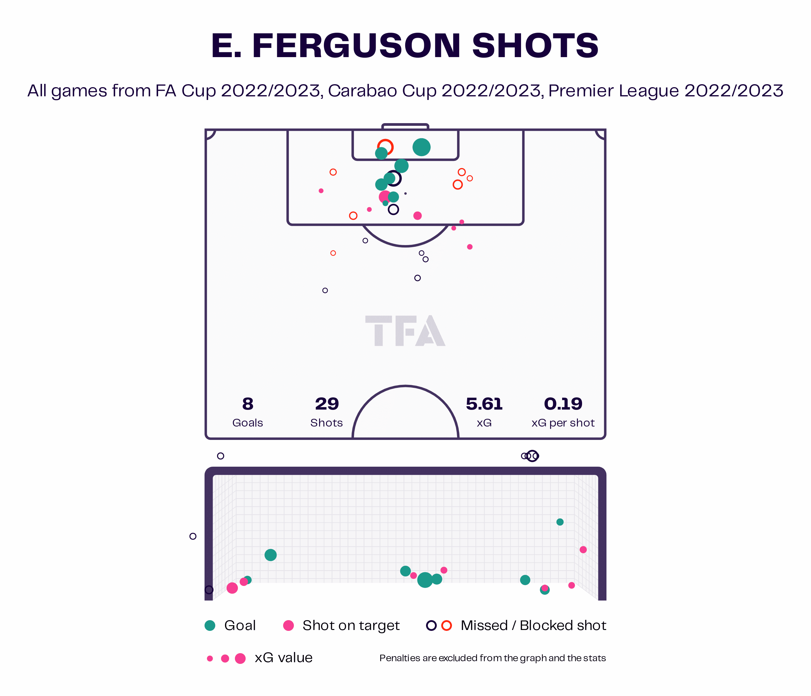 Whilst there is a lot of debate around the ‘expected goals’ metric and how it’s measured, we can work on the overall basis that Ferguson has scored some low percentage chances, meaning he is clinical when an opportunity presents itself.