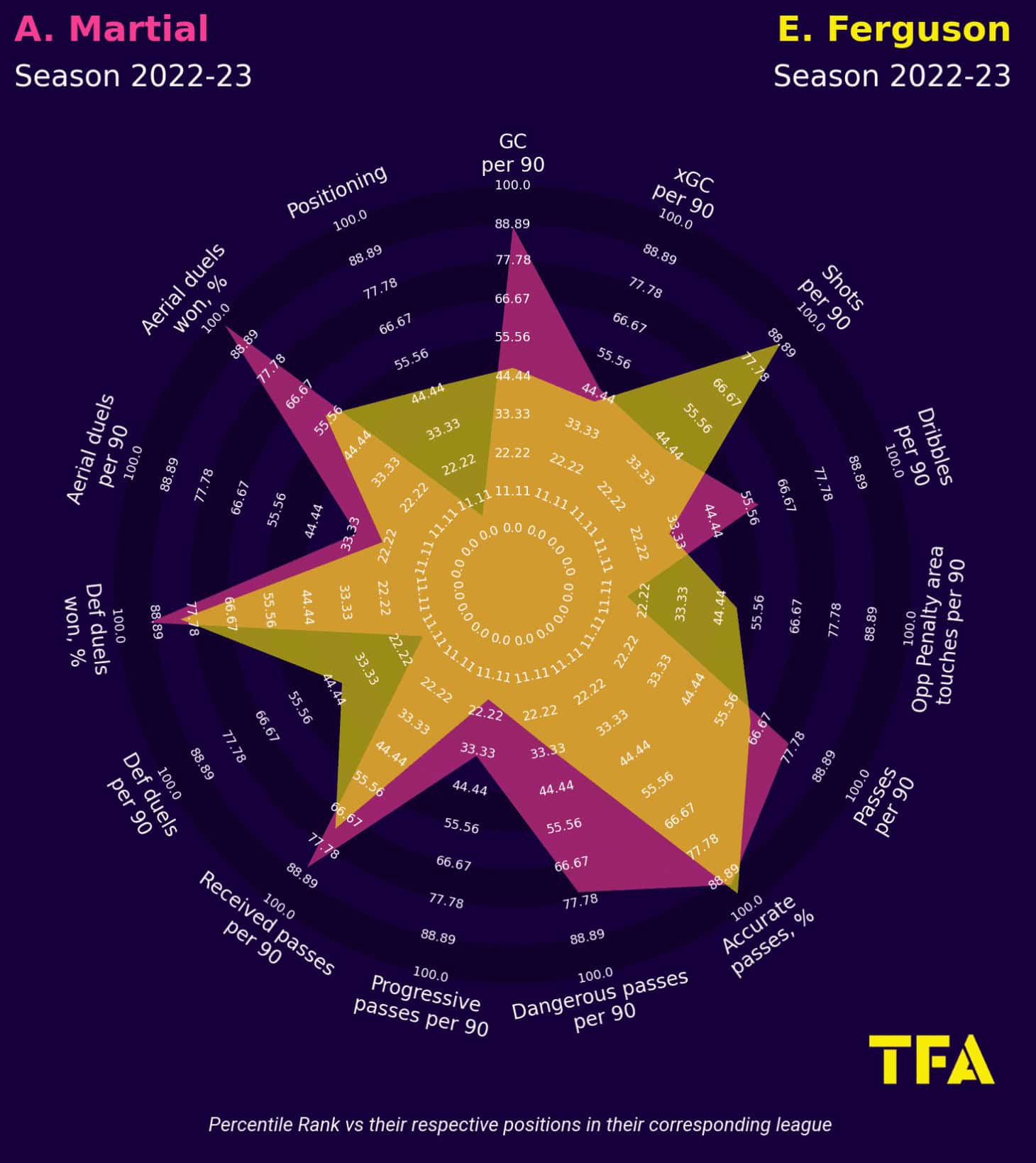 Interestingly, Ferguson takes many more shots per 90, yet Martial has a higher number of goal contributions per 90.