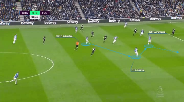In this scenario, just over a minute into the game and we can see the Brighton build-up play through the lines, Estupiñán fires the ball forward to Solly March who executes a cute little flick into the path of Ferguson.