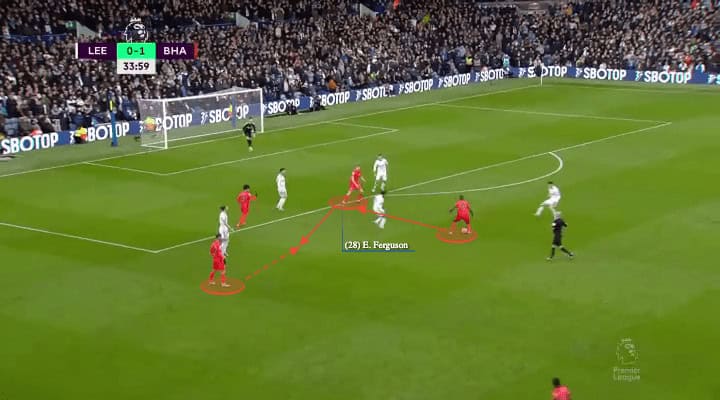 In this instance, we can see that Brighton are in the attacking phase and Ferguson is the subject of the Leeds defender’s attention.