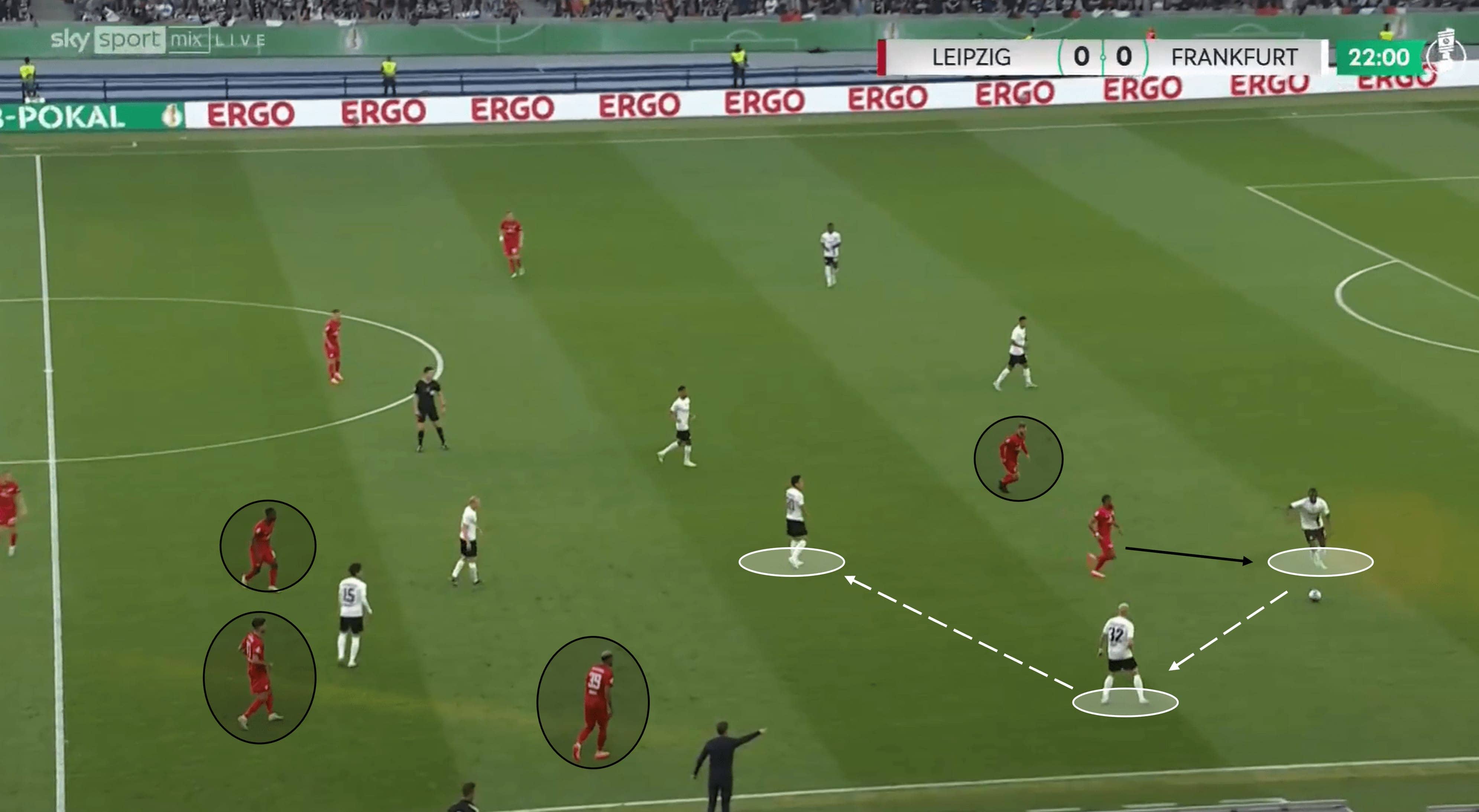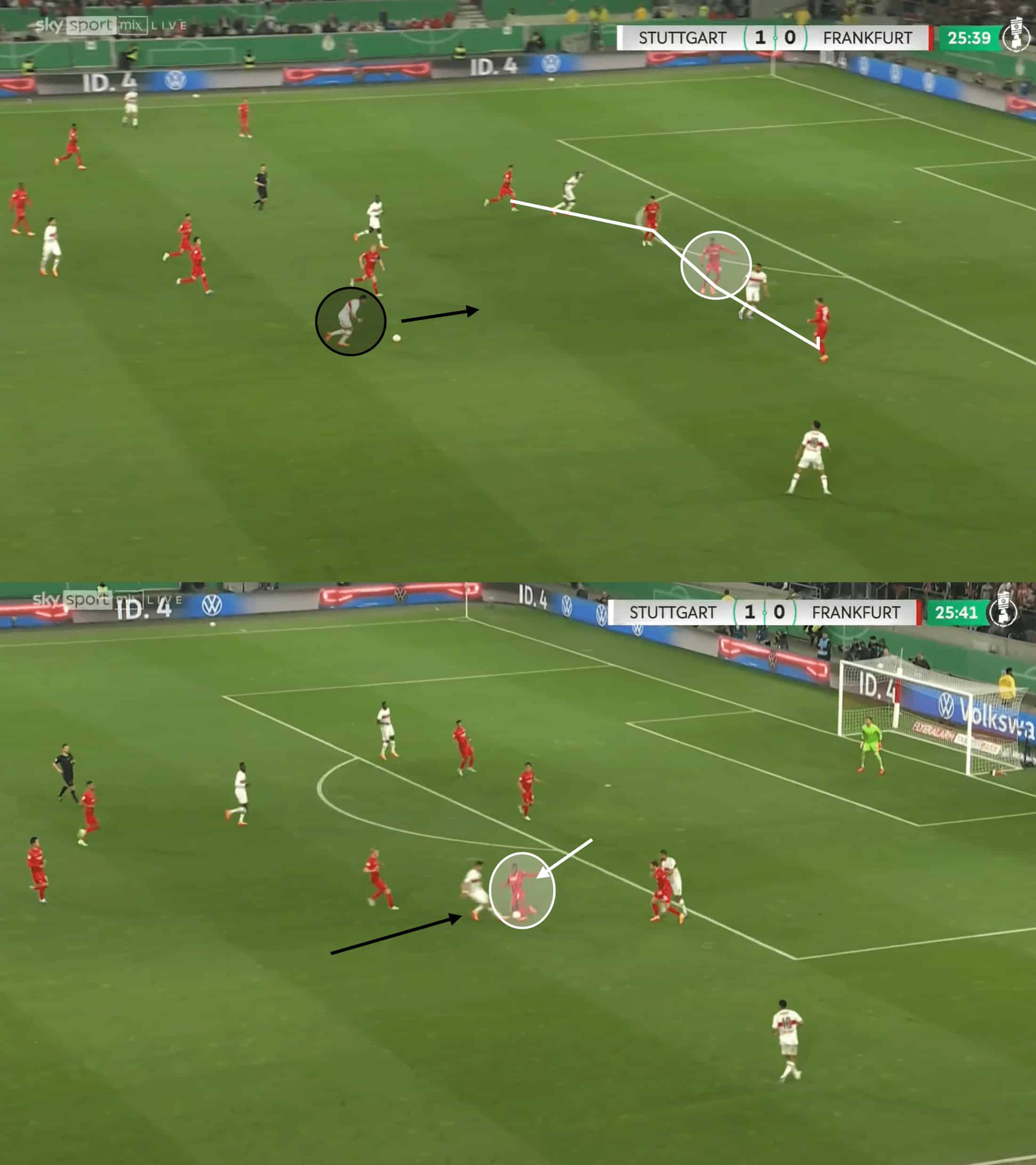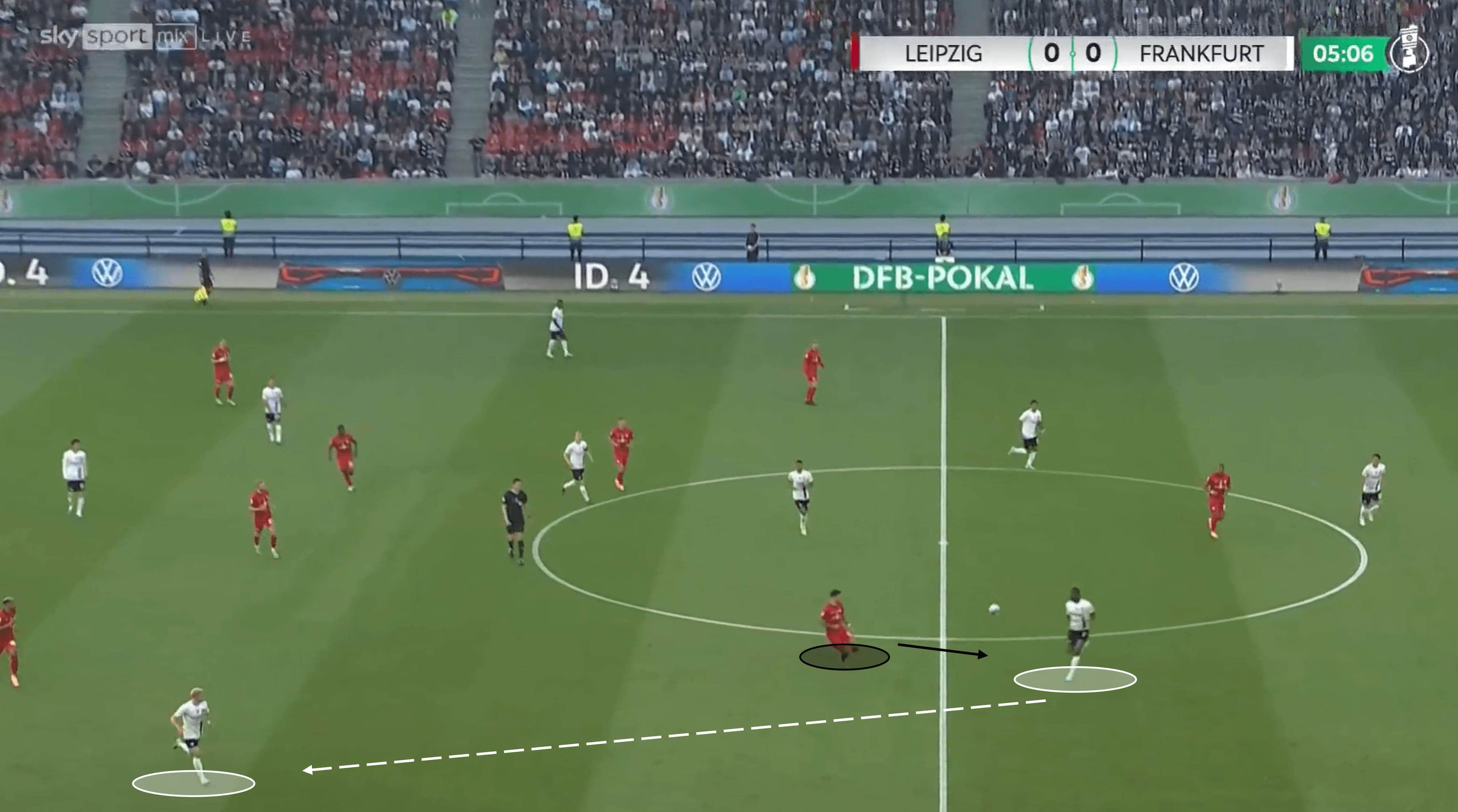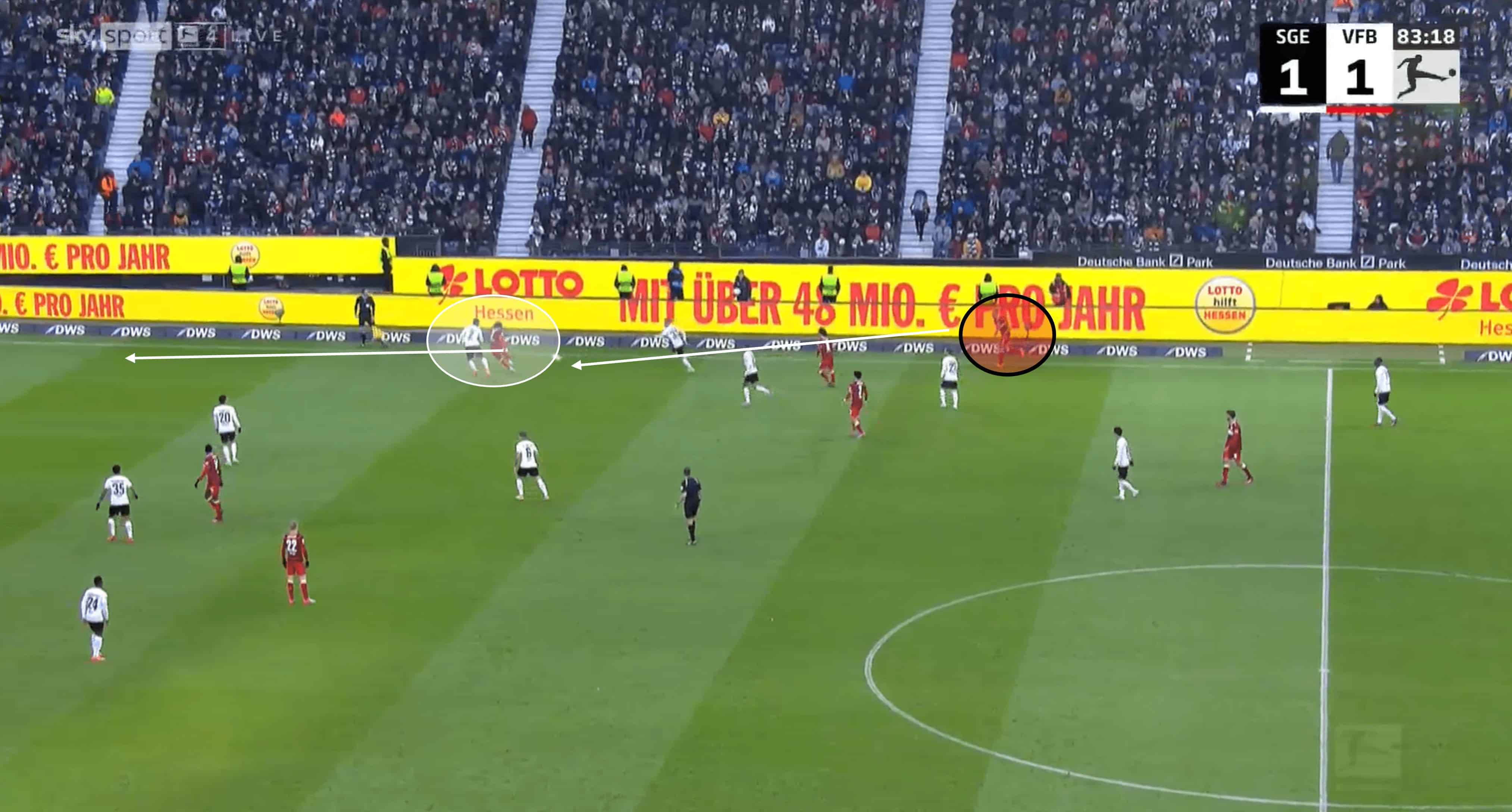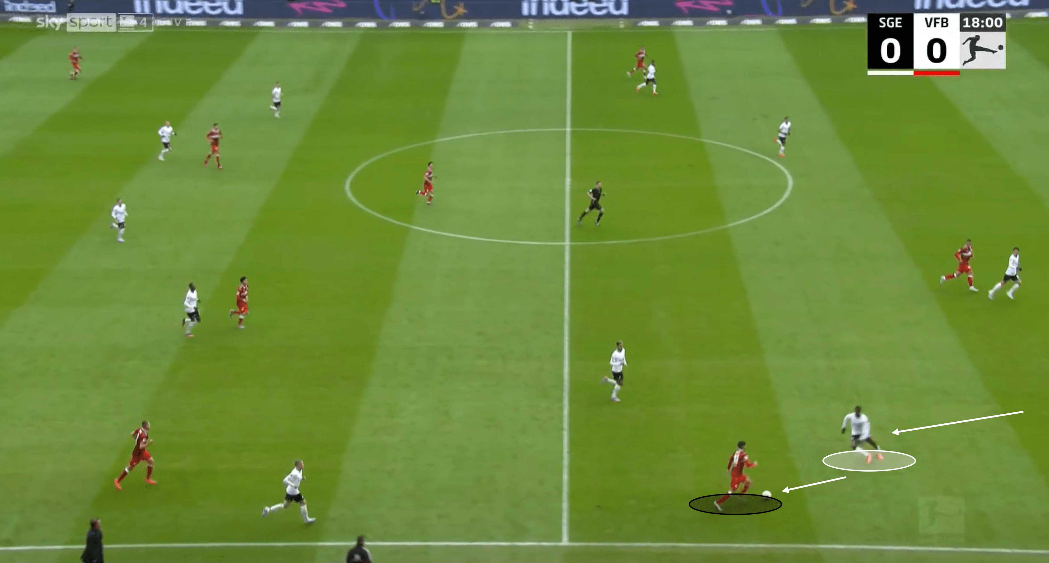 Ndicka is able to apply the same trait in deeper zones as well, not just in midfield areas. The opponent in the image above has his heart set on driving into the final third, with Frankfurt’s defensive line appearing compact and well-organised. As the opponent looks to beat the midfield unit, he takes a very heavy touch, which is just an invitation for someone like Ndicka, who wastes no time in getting out to the ball with another almighty challenge to stop the attack. Again, this action highlights physical attributes like acceleration and strength, technical aspects like tackling, and mental elements like anticipation and decision-making.