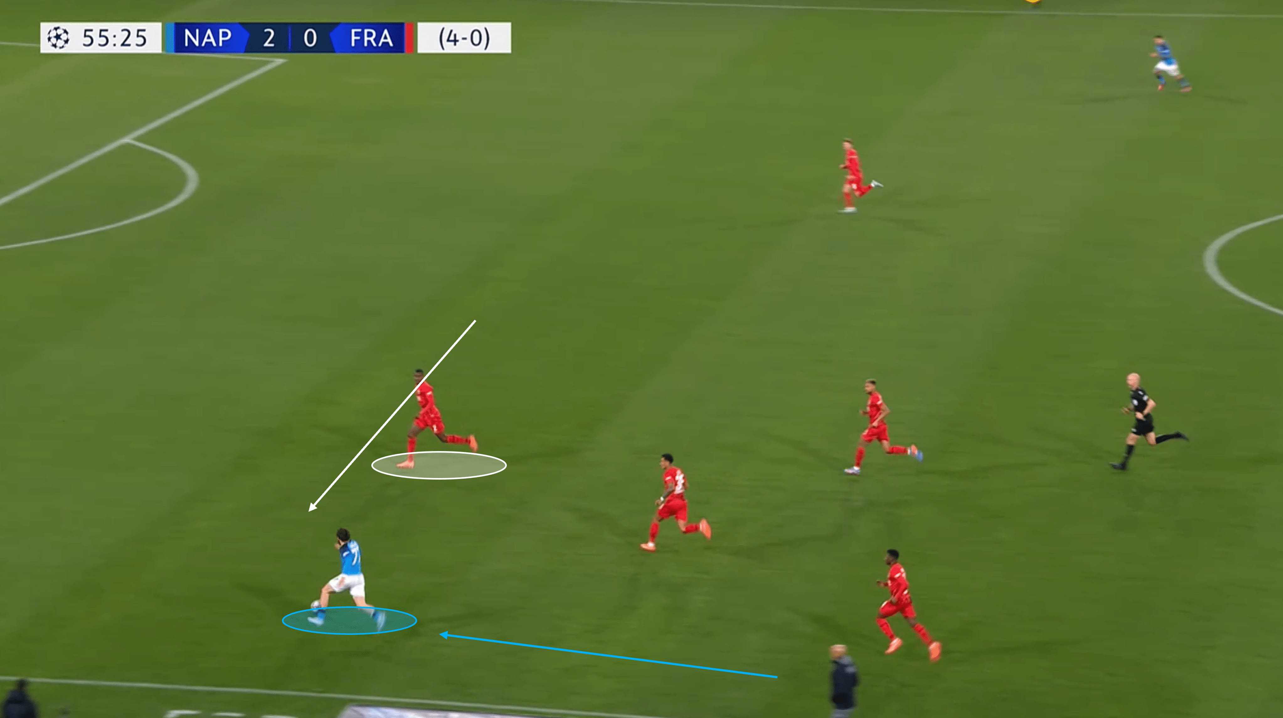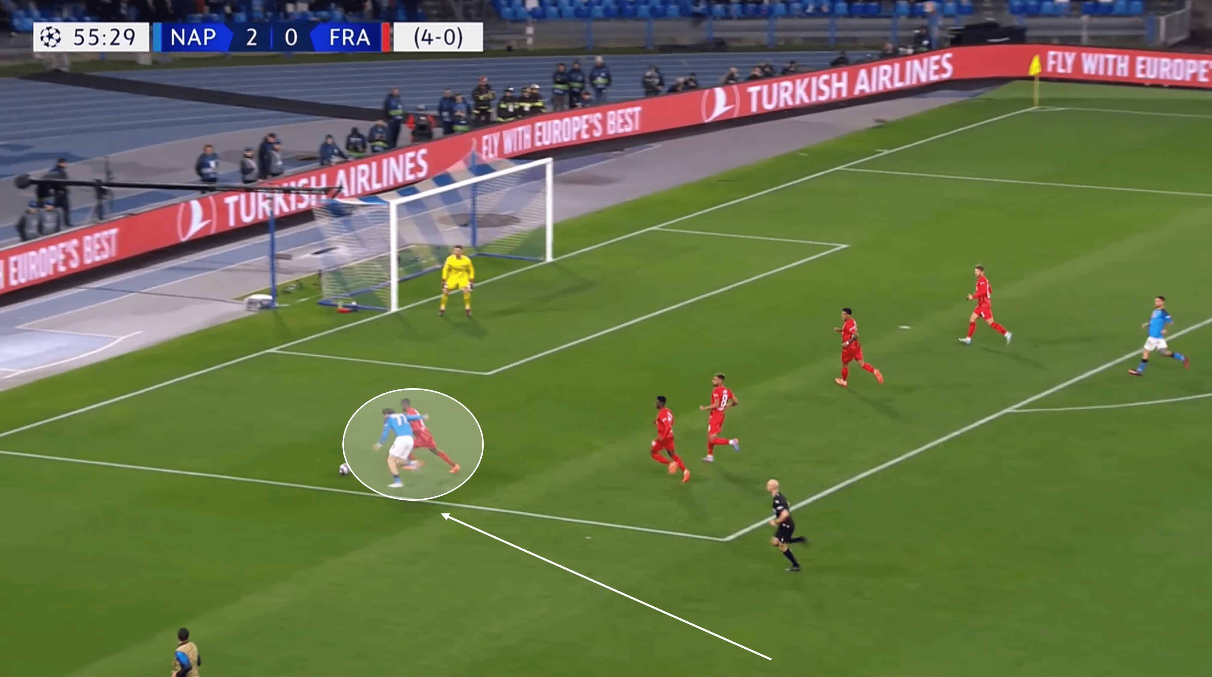 Timing and execution are key in defensive duels, especially in dangerous areas like the one you see above. After coming across the turf to close his opponent down, Ndicka forces the Napoli man wider again, narrowing his options significantly, before putting in a well-timed challenge to not only stop the attack but regain possession for his side.