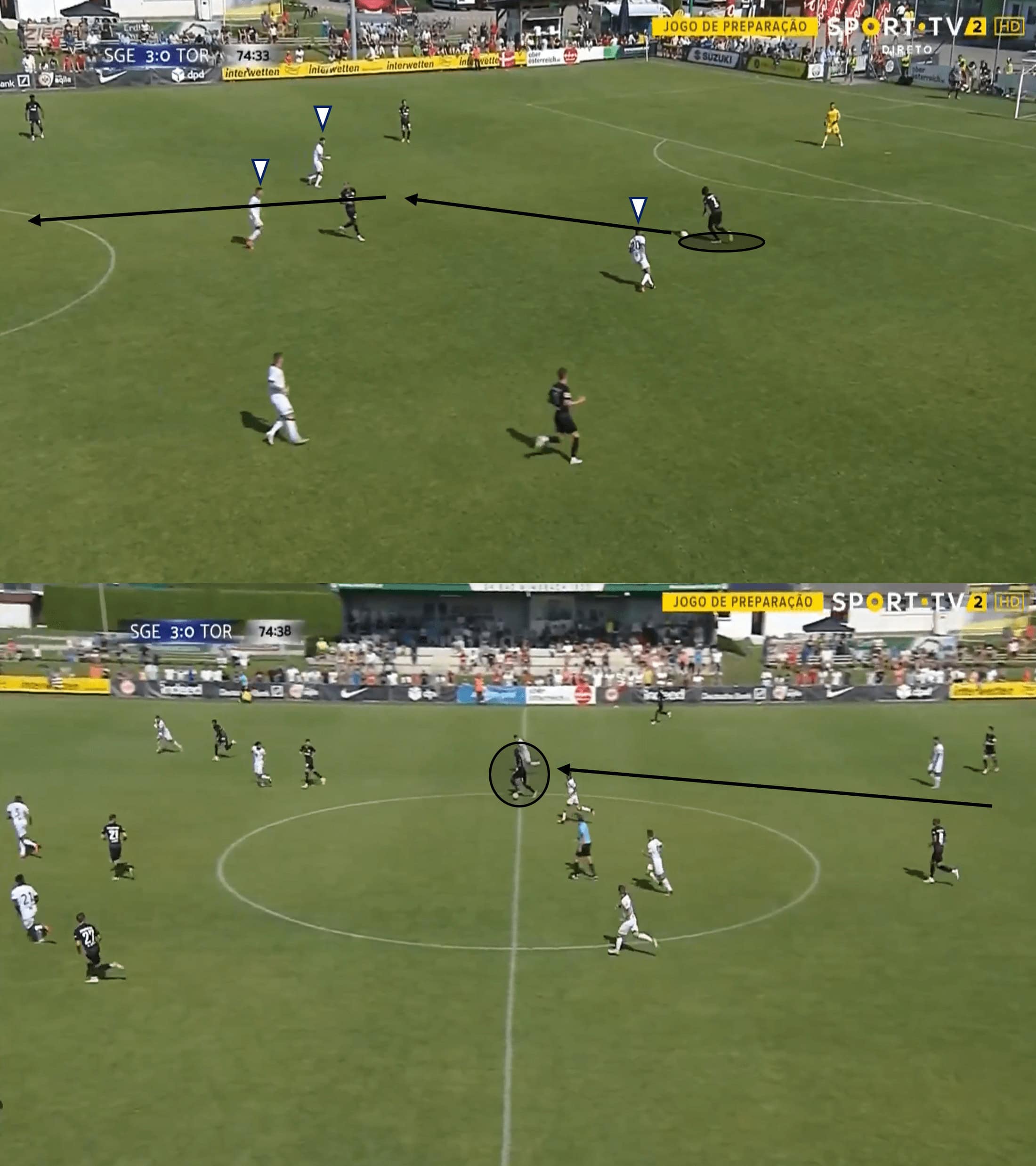 We see a similar example here, but the decision not to just hoof the ball long has some interesting tactical elements in there. Again, Ndicka is forced to act quickly under pressure – get it wrong and he gifts the opponent a chance on goal, so he does well to ignore that first and foremost. Given the significant pressure being applied by the opponent, and the number of bodies high up the pitch, Ndicka would’ve been forgiven for playing a long ball to either clear his lines or to try and hit the space in behind the defence. Instead, he stays with ol’ reliable partnership with his left wing-back, but he feigns the action of a long pass to throw the opponent off, before playing the short pass. From there, his side have the option to play through midfield with the space and numbers they have.