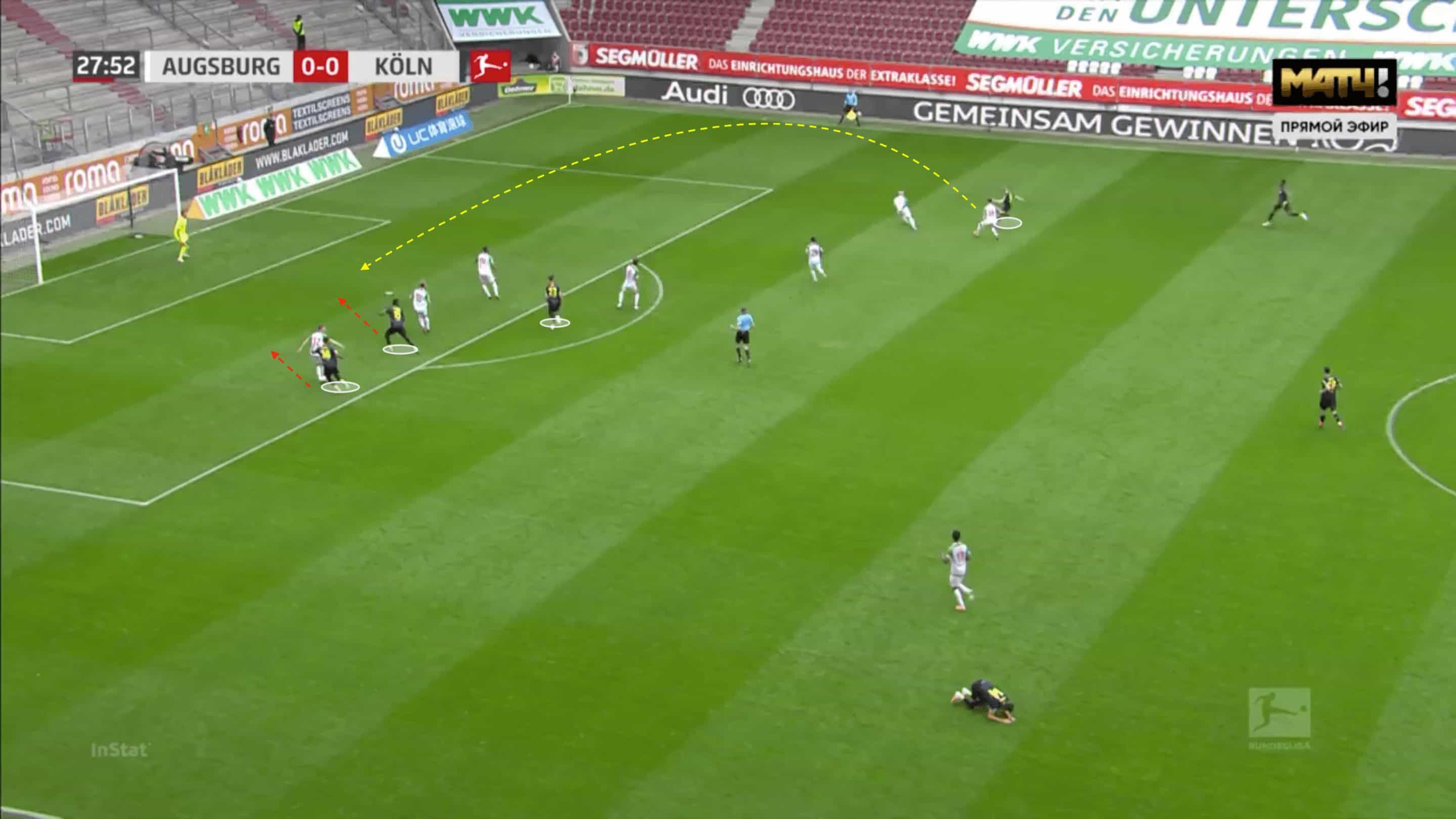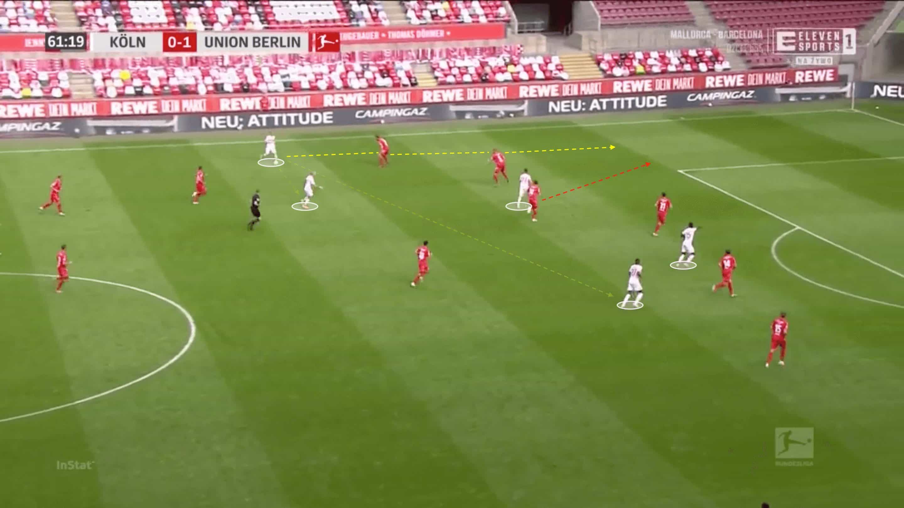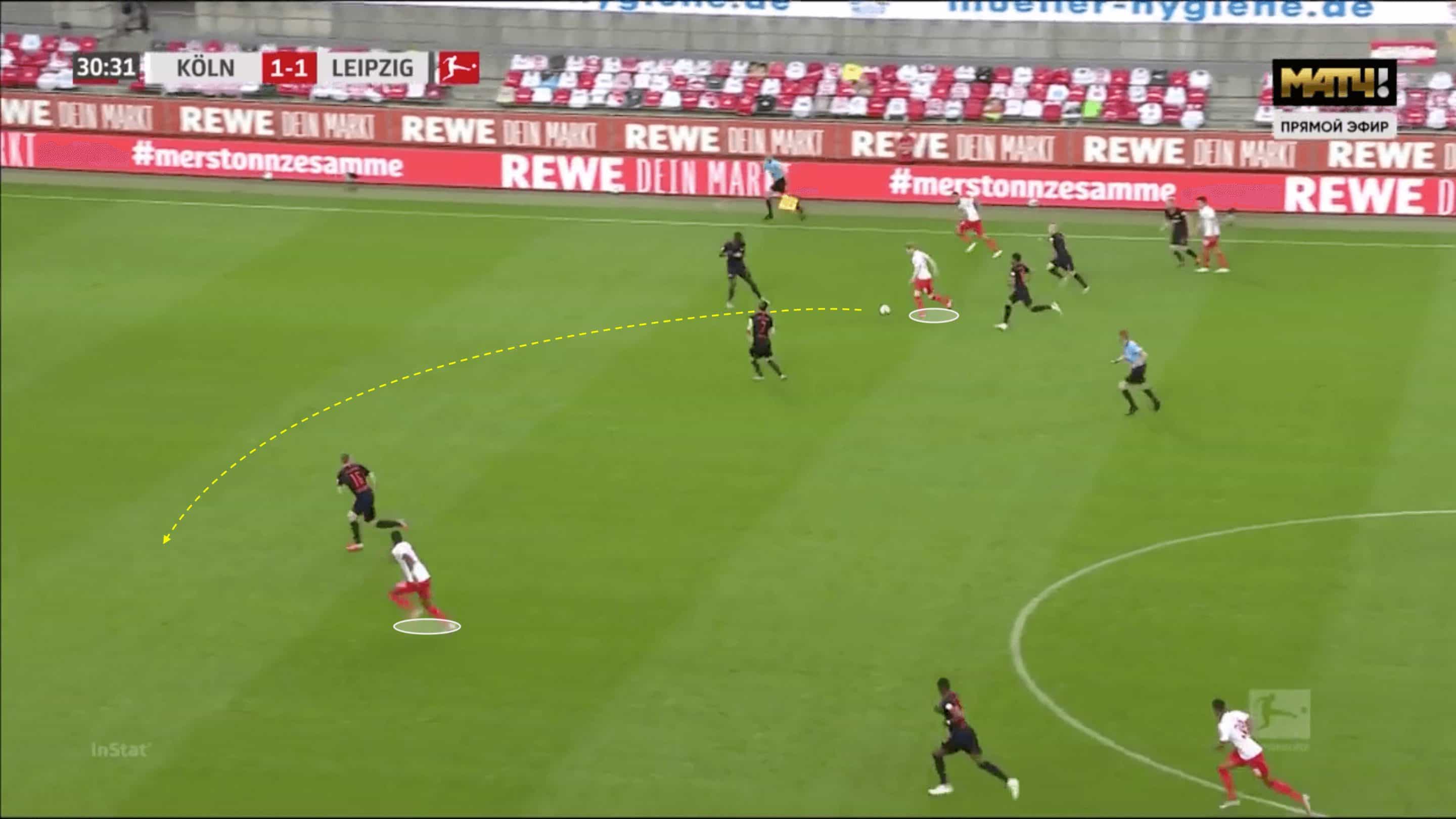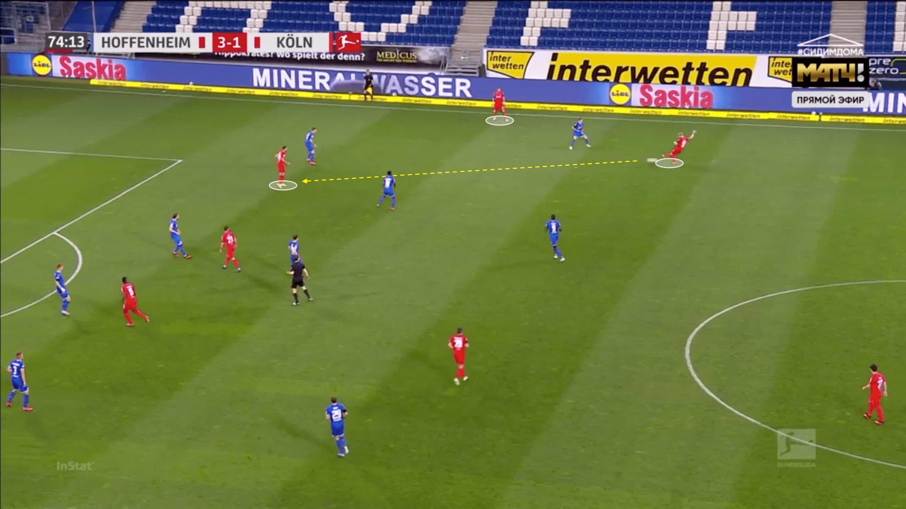 Following what was said before, Kainz will only carry the ball himself if he doesn’t see an immediate chance to play a through pass and isolate a teammate. The Austrian is defiantly a “passing” man in the sense that he prefers to launch the counter-attack via a long through ball rather than carrying the ball up the pitch himself. This other approach to launching a counter-attack adopted by Kainz pairs very well with his characteristics and that only shows that he is an intelligent player all around. The quickness with which Kainz plays the ball forward is often a surprise to the opponents and that paired with the fact that his teammates make the appropriate runs when they see Kainz has the ball often results in dangerous counter-attacks for FC Köln.