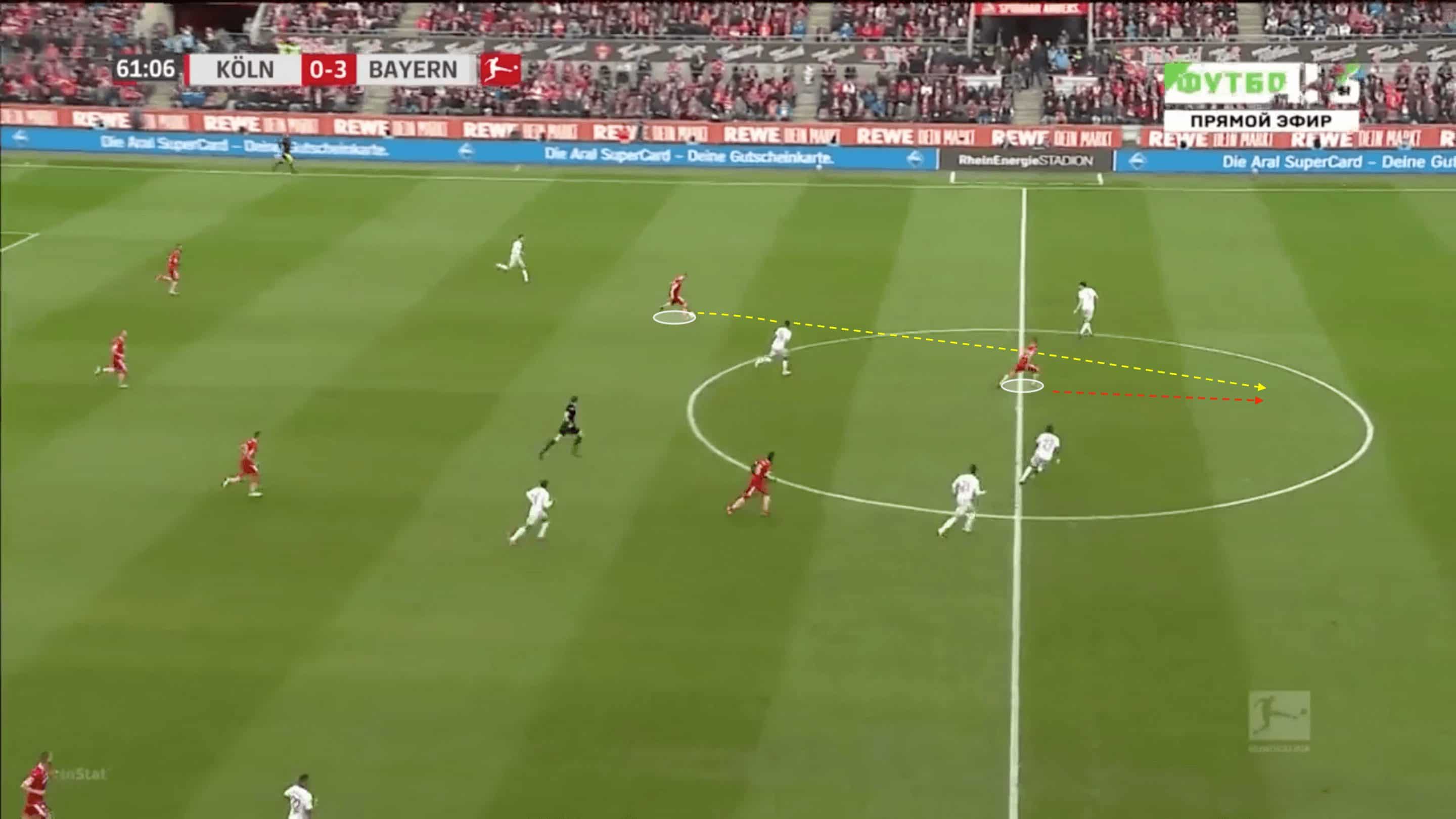 In the image below we can see one of the mentioned situations, Kainz gets the ball in his own half and immediately plays a wonderful through ball with his left foot and gets his team’s forward in a 1vs1 situation against the goalkeeper.