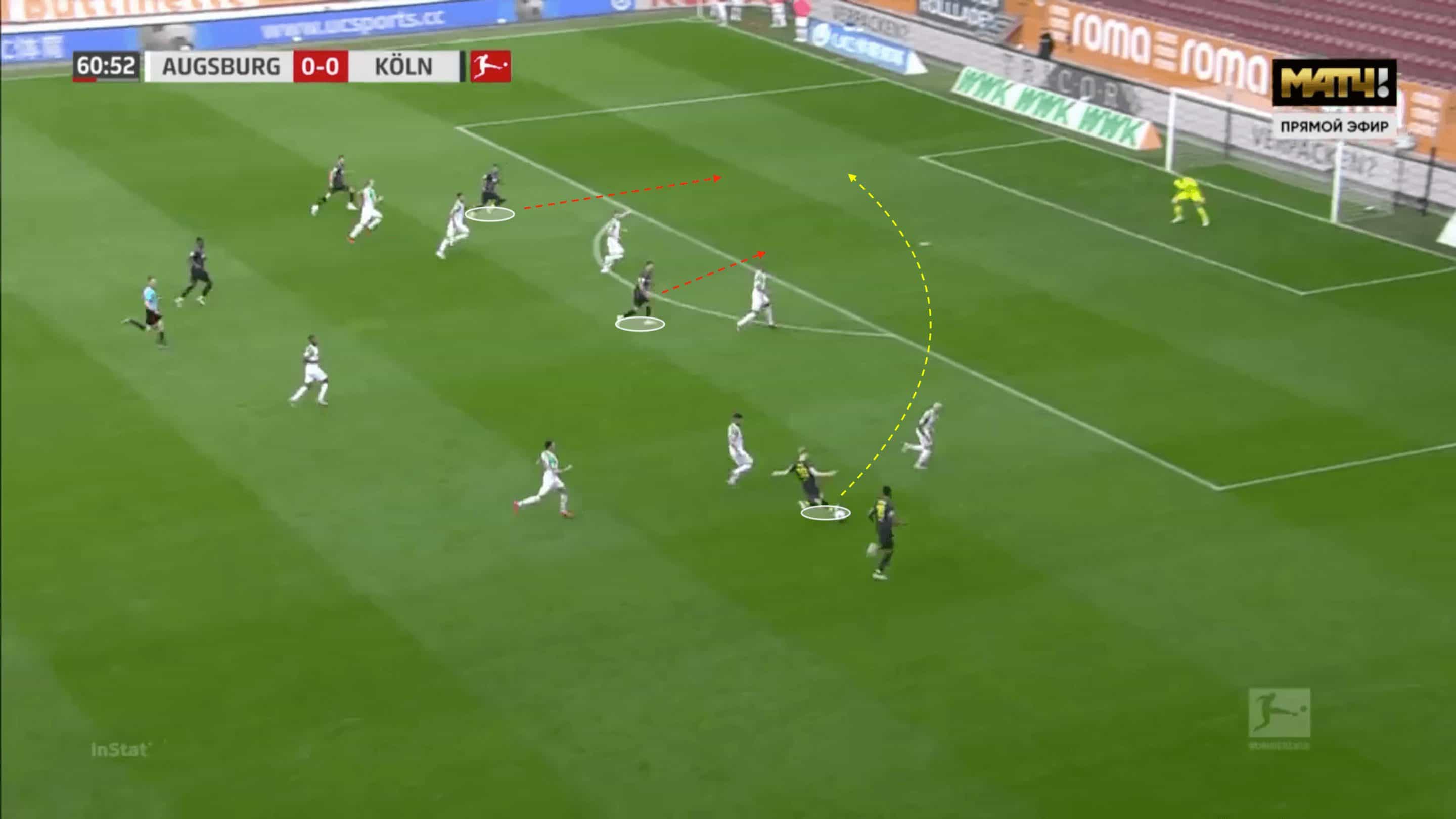 As the heatmap above shows, Kainz operates mostly on the wide areas, however, he also comes inside to the half-spaces quite often due to his style of play. Florian Kainz is not a traditional winger so to speak, though he does operate in the wide areas and in advanced spaces. Nevertheless, his role is much more to be a wide playmaker. Besides coming inside to free up the wide areas to the wing-back, Kainz has other characteristics that separate him from a traditional winger, he is a player that likes to be involved in the build-up play whether it is deeper or to provide the final pass. Also indicative of his role as a wide playmaker is the fact that when FC Köln have possession, Kainz is rarely the player that attacks space and depth and usually the one playing the pass for the player that is making the run in behind the defensive line. Other examples of this will be provided throughout the report.