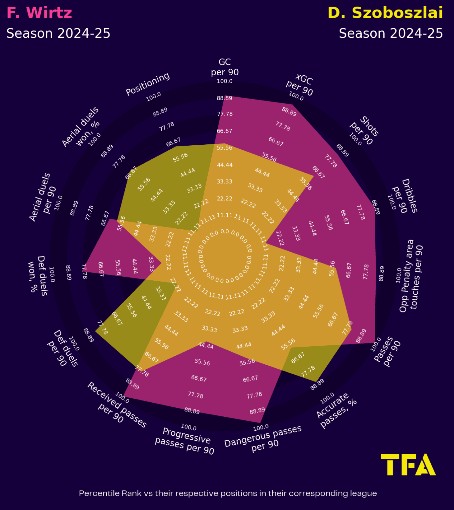 However, the radar highlights Wirtz’s lack of defensive metrics compared to Szoboszlai.