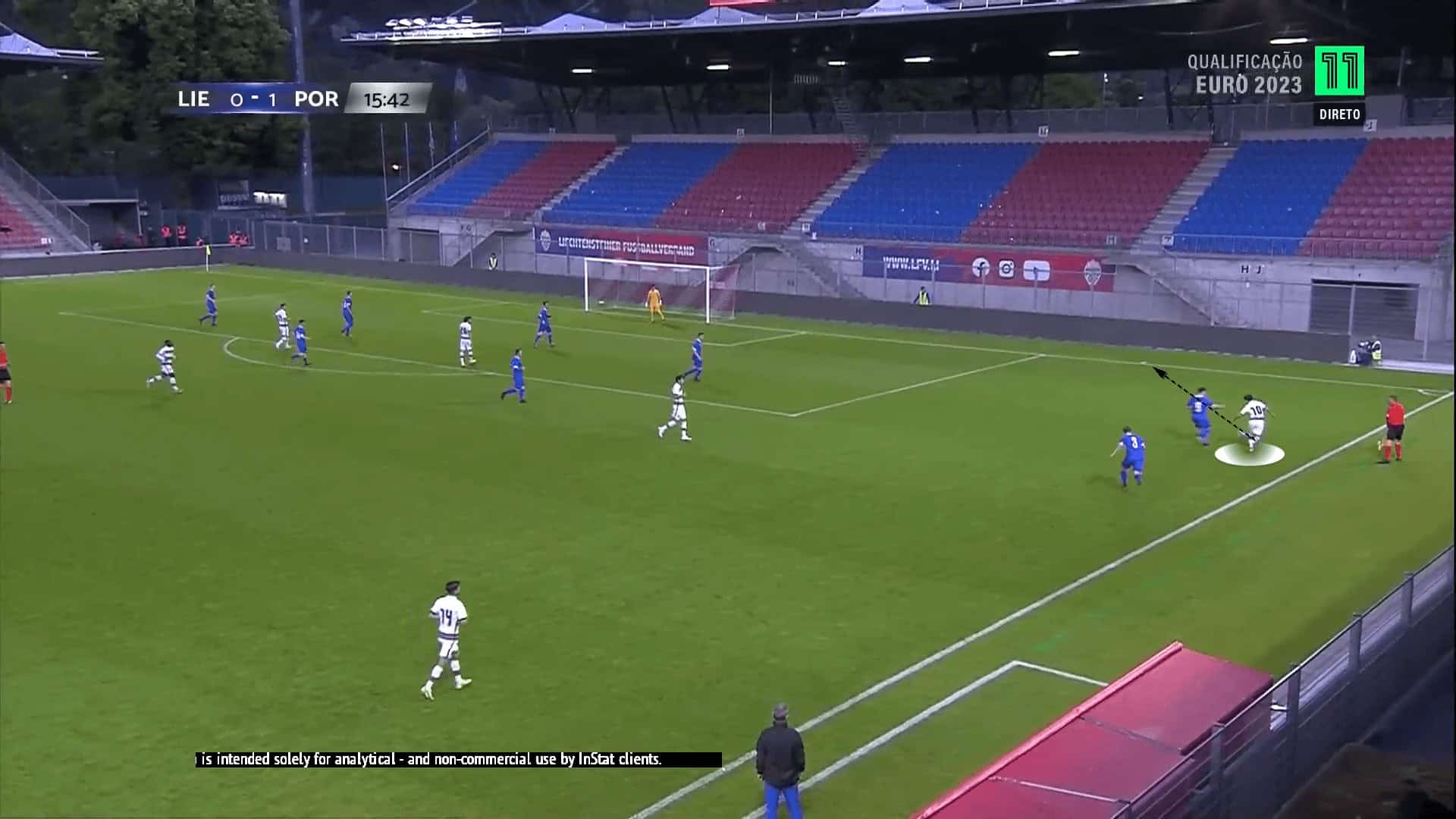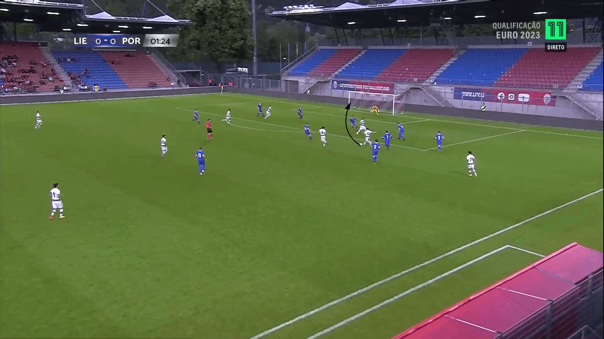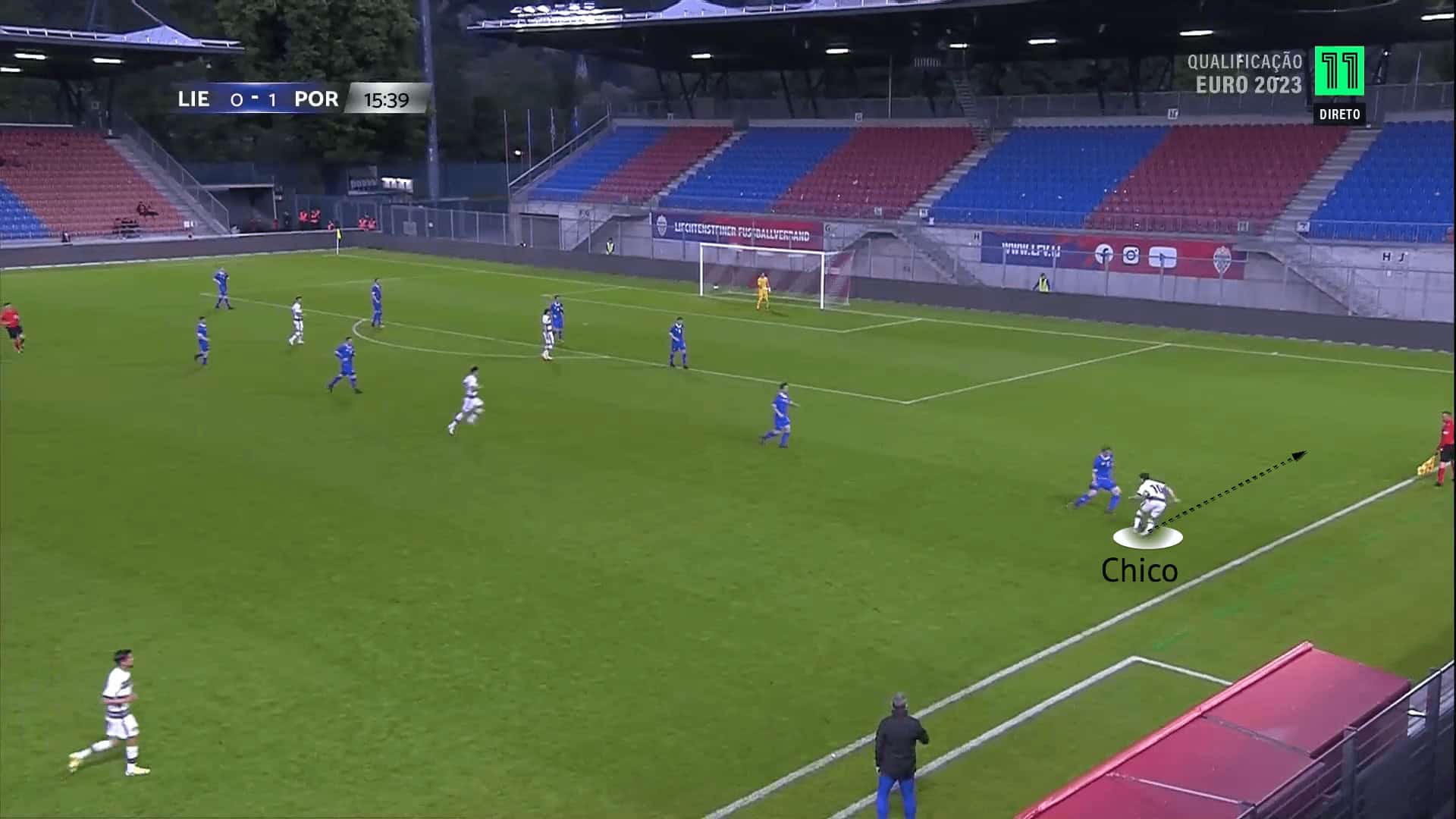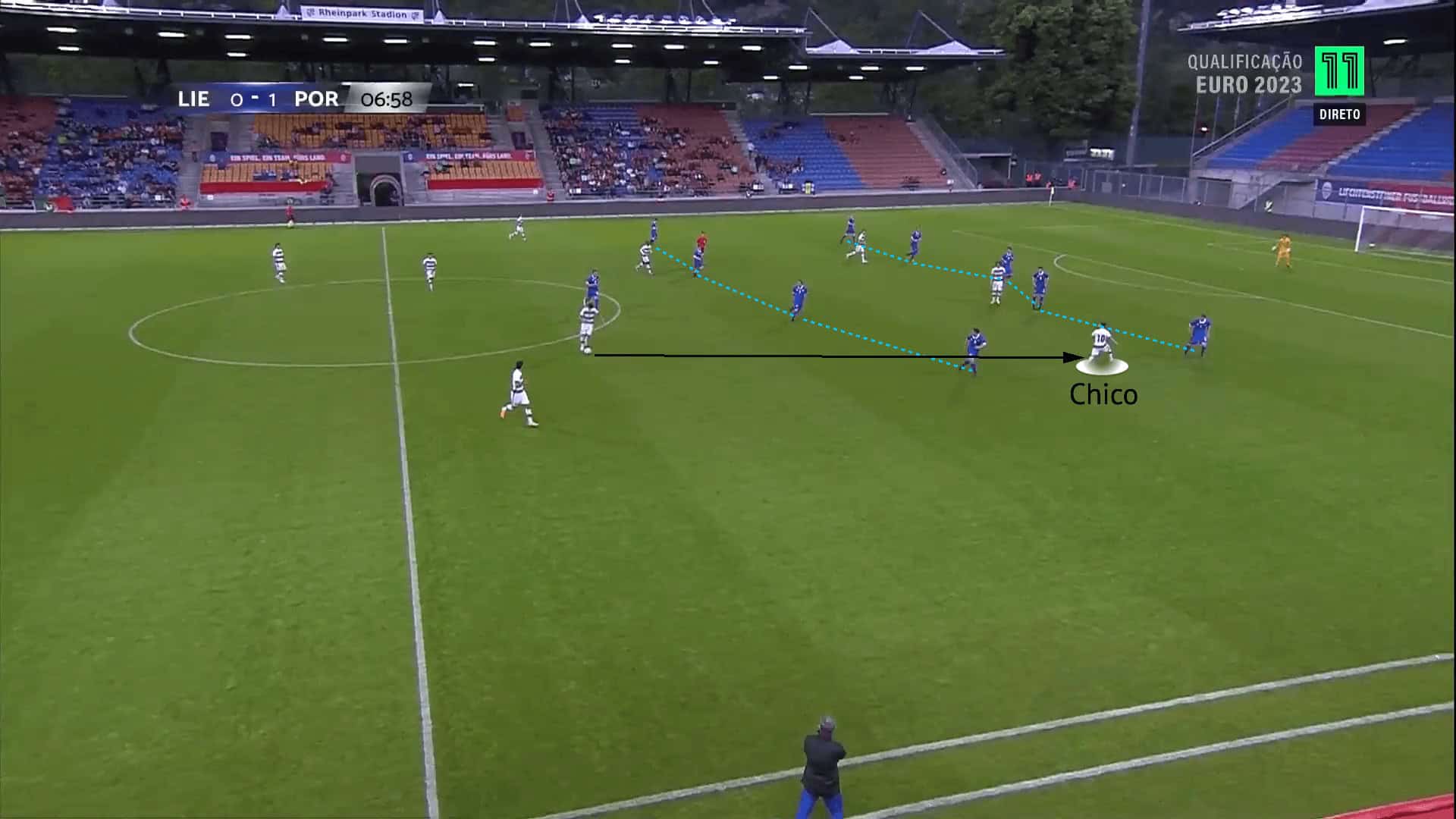 Positioned between the lines of the Liechtenstein 5-4-1 defensive shape, Chico does a sharp movement to drop and receive the disguised pass from Paulo Bernardo with Rodrigo Conceição holding width.